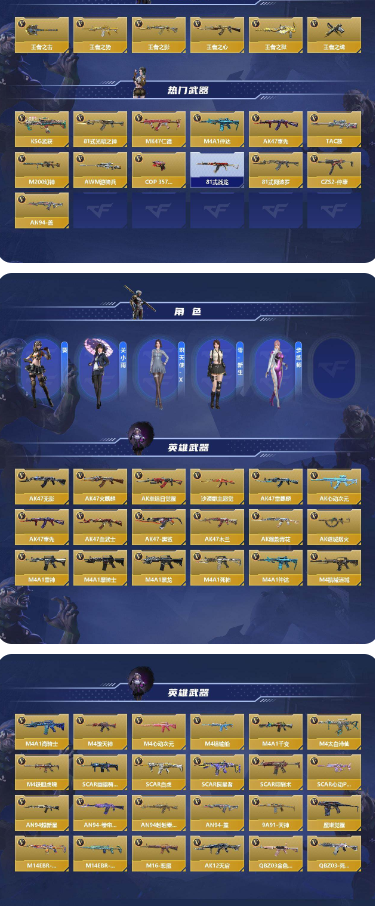 【英雄武器】:QCW05 - 孟婆,HK417 - 炎龍鎧甲,M1887 - 幽冥玄喵覺醒,FAMAS - 湮滅,AK47 - 無影,AK47 - 火麒麟2,AK47 - 黑武士,AK47-Rush - 星速,AK47 - 櫻鬥士 - 超覺,AK47 - 機械迷城,AK47 - 猩紅傳說,AK47 - 血武士,AK47 - 死神,AK47 - 黑鯊,AK47 - 風神翼龍,AK47 - 輪迴,AK47 - 雅韻青花,AK47 - 塔羅牌覺醒,AK47 - 謎城煙火,AK47 - 鋼鐵狂熱,M4A1 - 雷神,M4A1 - 黑騎士,M4A1 - 黑龍,M4A1 - 死神2,M4A1 - 玫瑰精靈,M4A1 - 游騎兵,M4A1 - 臥龍覺醒,M4A1-Rush - 夜襲,M4A1 - 龍血,M4A1 - 仲達,M4A1 - 機械迷城,M4A1 - 賽博雷神,M4A1 - 海騎士,M4A1 - 冰鋒覺醒,M4A1 - 黑龍鈺 - 子涵,M4A1 - 墮天神,M4A1 - 心動次元覺醒,M4A1 - 獵神,M4A1 - 雷暴,M4A1 - 夏清,M4A1 - 太白詩仙,M4A1 - 鐵膽虎魄,SCAR - 幽暗騎士覺醒,SCAR - 文遠,SCAR Light - 白虎,SCAR - 探星者,SCAR - 守護者覺醒,SCAR - 印刷術覺醒,SCAR - 心動 PICK,劍齒虎,AN94 - 超新星,劍齒虎 - 炫彩,AN94 - 捲簾大將軍,AN94 - 赳赳秦師,AN94 - 蓋,AUG - 機械紀元,9A91 - 死神,9A91 - 魔蜥覺醒,M14EBR - 暗夜覺醒,M14EBR - 天神,M14EBR - 拂影,M14EBR - 玄武,M14EBR - 葫蘆山莊,M16 - 惡魔,AK12 - 天啟,QBZ03 - 湮滅,QBZ03 - 金色薔薇,QBZ03 - 死神,QBZ03 - 玉面羞花,HK416 - 極光,QBZ19 - 天使,G36 - 競技戰魂,MK47 - 云舞,G3A3 - 五色琉璃覺醒,G3A3 - 衍神兵,QBZ97 - 嵐舞