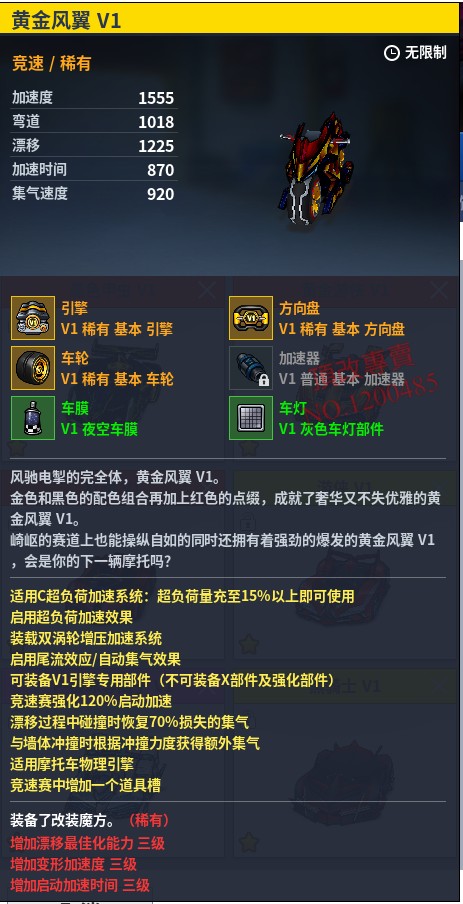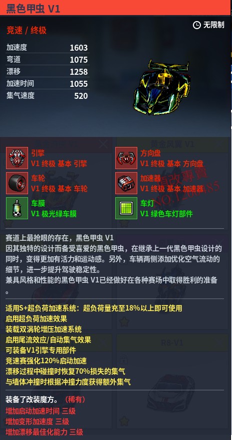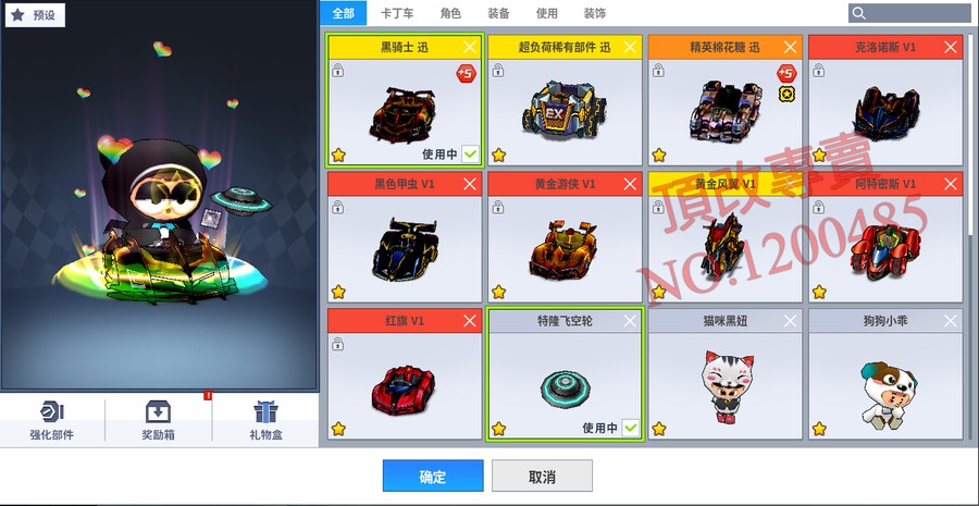 內容:疾影訊 (改S賦能/台服叫巴爾札特)+ 5紅框V1(克洛諾斯V1+黑色甲蟲V+黃金遊俠V1+阿提密斯V1+紅旗V1) +黃金爆刃 V1 (車輛都頂改)