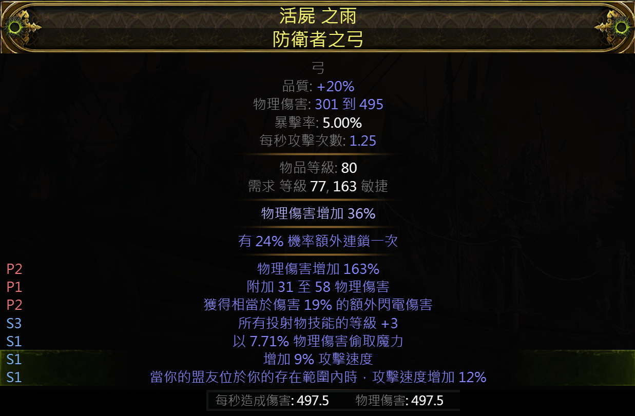 大傷495 額外閃電傷/投射物技能+3/攻擊速度/物理偷取魔力/連鎖/