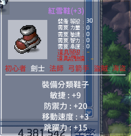 道具 【9敏紅雪鞋】 9敏紅雪鞋火速交易直接下單30等劍士鞋子裝備敏捷+9 移動速度+3 跳躍力+15
