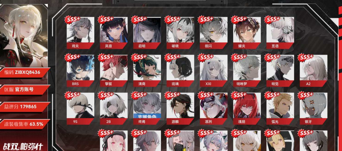 【ZJBXQ2311】等級:120,總評分:176980,成員塗裝:57.7% 收集率;SSS + 成員數量:30,SSS + 成員:4S 狂夫,4S 破曉,4S 徊閃,4S 耀炎,4S 覓語,4S 回音,4S 擎驅,4S 清商,4S 琉璃,4SXXI,4S 明覺,4SA2,4S 游麟,4S 瑰麗,4S 弧光,4S 銀牙,4S 溢彩,4S 夙星,4S 夜刃,4S 爆裂,4S 重能,4S 風暴,4S 深痕,4S 零度,4S 流光,4S 蝕暗,4S 深紅之淵,4S 黎明,4S 紅蓮,4S 异火;SSS 成員數量:35,SSS 成員:3S 戍炎,3S 希聲,3S 幻奏,3S 嵐音,3S 啟明,3S 雀翎,3S 裁律,3S 但丁,3S 維吉爾,3S 漻影,3S 幻日,3SBRS,3S 深遙,3S 森息,3S 明晰夢,3S9S,3S2B,3S 終殤,3S 銀冕,3S 漂剎,3S 灼惘,3S 绯耀,3S 萬華,3S 塵銘,3S 輝曉,3S 烬燃,3S 暗能,3S 芒星之迹,3S 晖暮,3S 極昼,3S 仰光,3S 誓焰,3S 深紅囚影,3S 鴉羽,3S 乱數;SS 成員數量:9,SS 成員:2S 逆旅,2S 隱星,2S 華鈡,2S 檀心,2S 輪光,2S 遙星之座,2S 脉冲,2S 真理,2S 超刻;成員塗裝:燦星紡祈系,啜泣心晴,晞染天光,赤錦徊夢,宇脉浪涌,梨綠雲華,灰燼回生,紅綃春樹,巫眇魂祀,茕心溯愿,長夜瞭望,御衡圣翼,沙飞虹芒,冷熾碧,朽骨回生,罪妄月华,苍空炽月,街头红芒,瑤蓝眸转,尼刻 US1000,旌风雪冠,焰骸孤冕,绯瀾盛律,綺影燦然,濱海漣漪,逐游骑,炸裂霓虹☆,榮勋典范,薄紗紫荊,万灵游行,秘龙馳星,甜莓轮,逐隱幽芒,拾夢白菀,綺愿稚梦,煜黯棘,骨新娘,深海少女,纺光同塵,拂曉長誓,蚩龙渊渺,绛龙佔岁,赤樗椿,《海浮荧,破夜极星,朱云流霭,鳞波沐舞,末世绀华,深夏螢,落華鸾歌,夜莺玫瑰,深海蓝调,詭夜冥魈,波旬夜叉,但丁,維吉爾,遐寐矜安,熠耀方程,泳歌盈步,晴灘遊影,绚彩节拍,緋彩盈曦,BRS,旧日灼焰,馭龙擎云,鶻翎归梦,夢庭序曲,狂驟燥音,迷途梦魇,玄符不语,齿轮红帽,夏雪微鸣,霜綾栖鴞,破坏者装束,霜綾栖,寄叶 A 型二号,寄叶九号 S 型,少年的装束,寄叶二号 B 型,暗宵冬狩,苍山尘叶,殛夜残响,残恸解脫,星砂夜行,言蔷薇,曼荼纱舞,閃耀晨星,逐声迷蝶,怀沙朔流,孤夜黯棘,猩红注射,爆竹声中,弯钩船长,终殤讯使,白夜领航员,輝煌流星,零时合约;武器塗裝:罚诫律,九黎銘尊,血烁黎明,蓝梭命剪,飞沫惹夏,风花芥頌,桂莺诗律,浮嚣,权视穹鸣,荒际猎燈,桃心勇者,雾靈貓犀,蛾赤魔,汐光电漪,热刃鱼游,緋羽灼华,绣漪荷韵,变速节阀,安全义务,玄鶴,失乐裁断,鯉繹,染霜,游春桃,不羁制造者,鸢弯雪羽落,焚祸灾轮,澎浪合成器,寥光緻忆,星龙拳,执花斩风,灼魉,星霆,青髓,虹浪染彩,燃鳞,悲奇迹,玲珑曼舞,白羽幻梦,暫时雪,折纸鴟歌,燼骸孤冕,茜辉伴生,南十字星,弥夏烨绽,愿风鸣,森宇幻翼,云阙清辉,龙争竞,静夜新生,世界树,赤冕耀施,荧尘致愿,天垢玄溪,永夏激浪,掌心白雪,深海突击,伯利恒之星,南瓜咧嘴笑,开门红,热夏虹弦,巡夜之弧,紫鸢,轻丝俏,科德韦尔 - 49,白金天鹅,骨鲮锋刃;【官方帳號】【官方截圖】