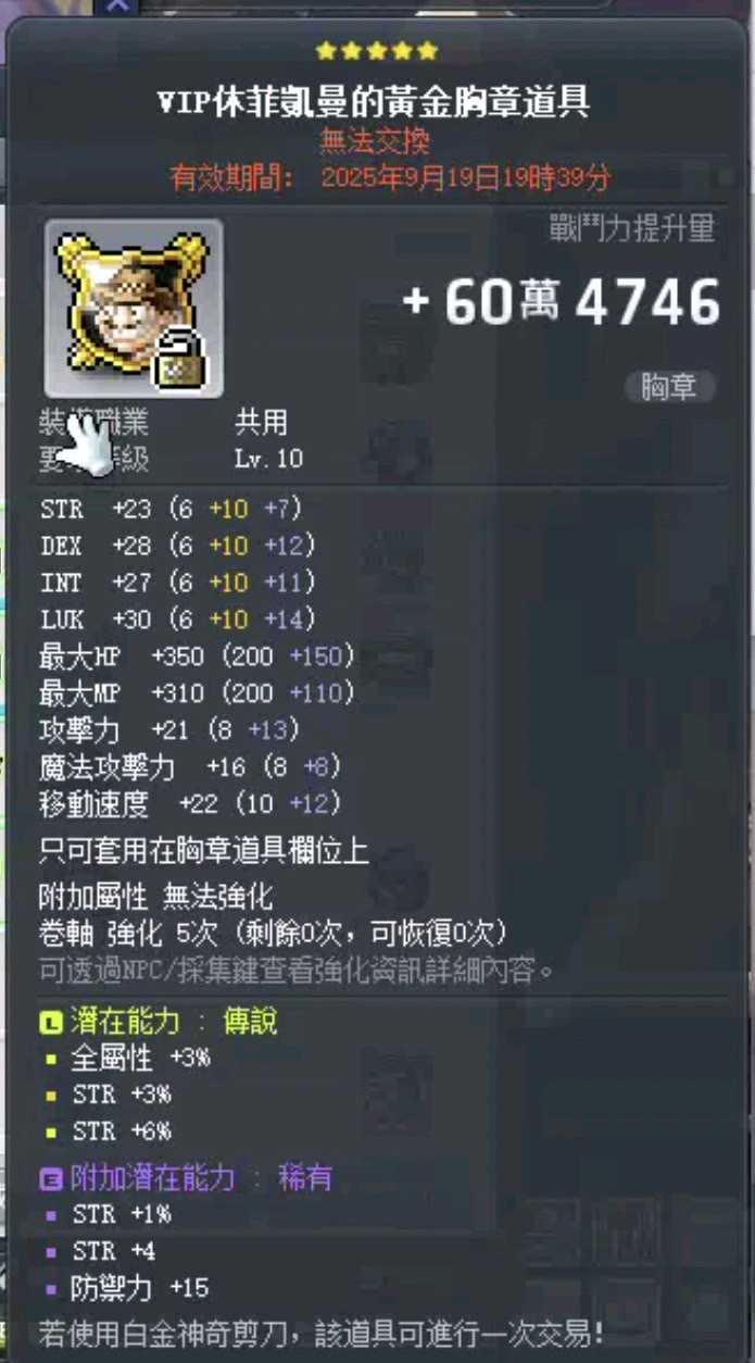 【胸章】 VIP休菲凱曼的黃金胸章道具傳說12%力白3均2.6攻附加稀有