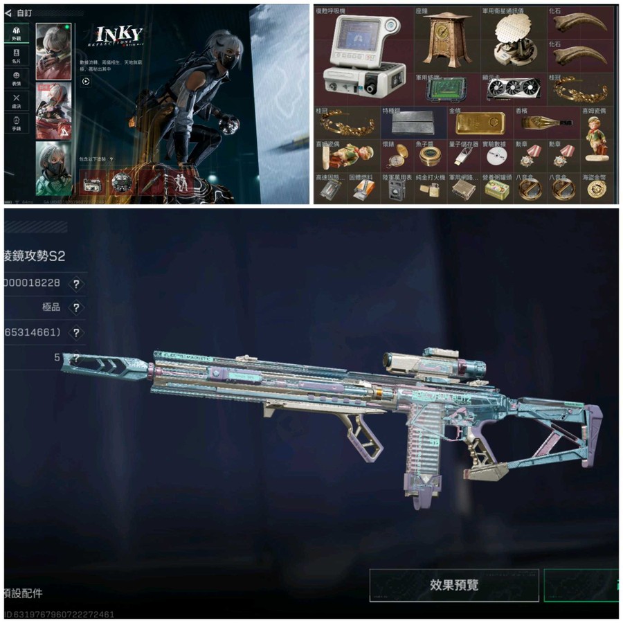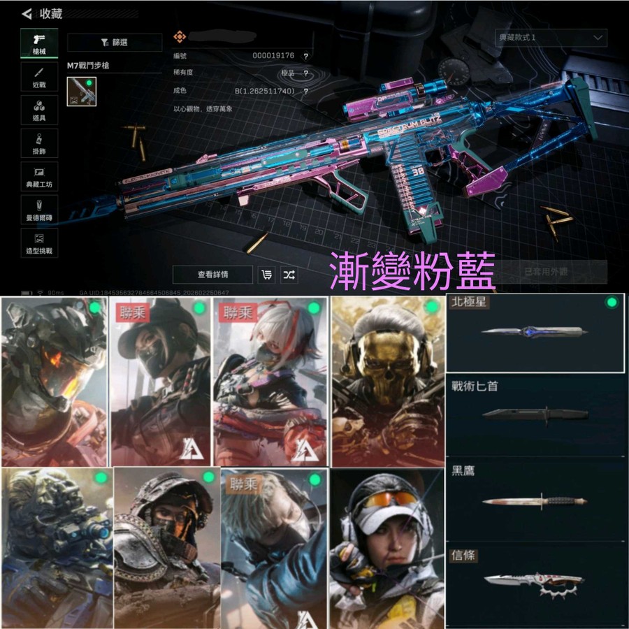 | GM01 | 烽火60 全面50 | 650 (純幣390M) 剩1280點卷 | 紅皮 蝕金玫瑰/凌霄/天際線/維什戴爾/刀皮 信條/北極星/槍皮 極品B M7+35把傳說槍械造型/眾多賽季限定吊飾/部門全三級/倉庫9級/指揮6級/訓練7級/靶場7級/潛水2級/收藏是2級/技術中心&工具台&製藥台&防具台皆3級/已解鎖13/14角色/10個高級咖啡豆/限定收藏 拉小宅/比利狼/極品平安果/至純源石/天才少年/S7賽季任務紀念/S5 S6 S7巔峰戰神S4 S5戰場統帥) | 40000NT該帳號主要資訊可看圖片4(含極品M7 可以私訊議價談談 整組給) |