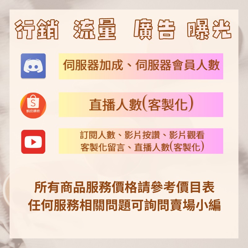 ✅所有流量、互動服務皆有機率被官方平台偵測,本店僅提供您的需求服務,完成後續若出現問題本店不承擔任何責任,若對您或您的品牌、企業形象造成正面或負面影響及任何後續問題,本店將不付任何責任,購買前請三思,同意以上聲明再購買,購買視為同意上述聲明內容。