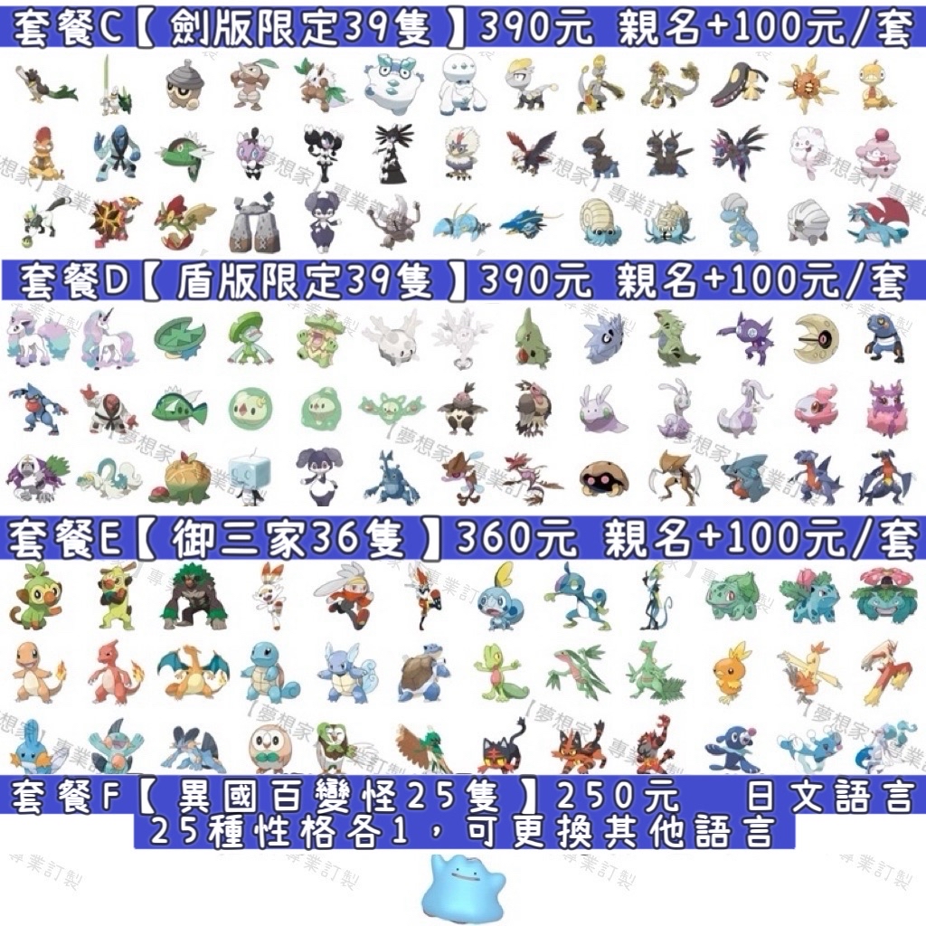 💎套餐區都是6V.滿等.性格配好.極巨化滿.努力值滿,鎖定個體的寶可夢都會用王冠鍛鍊好,官方目前有開放異色的都是提供異色,需要更換成原色的話,要提前告知