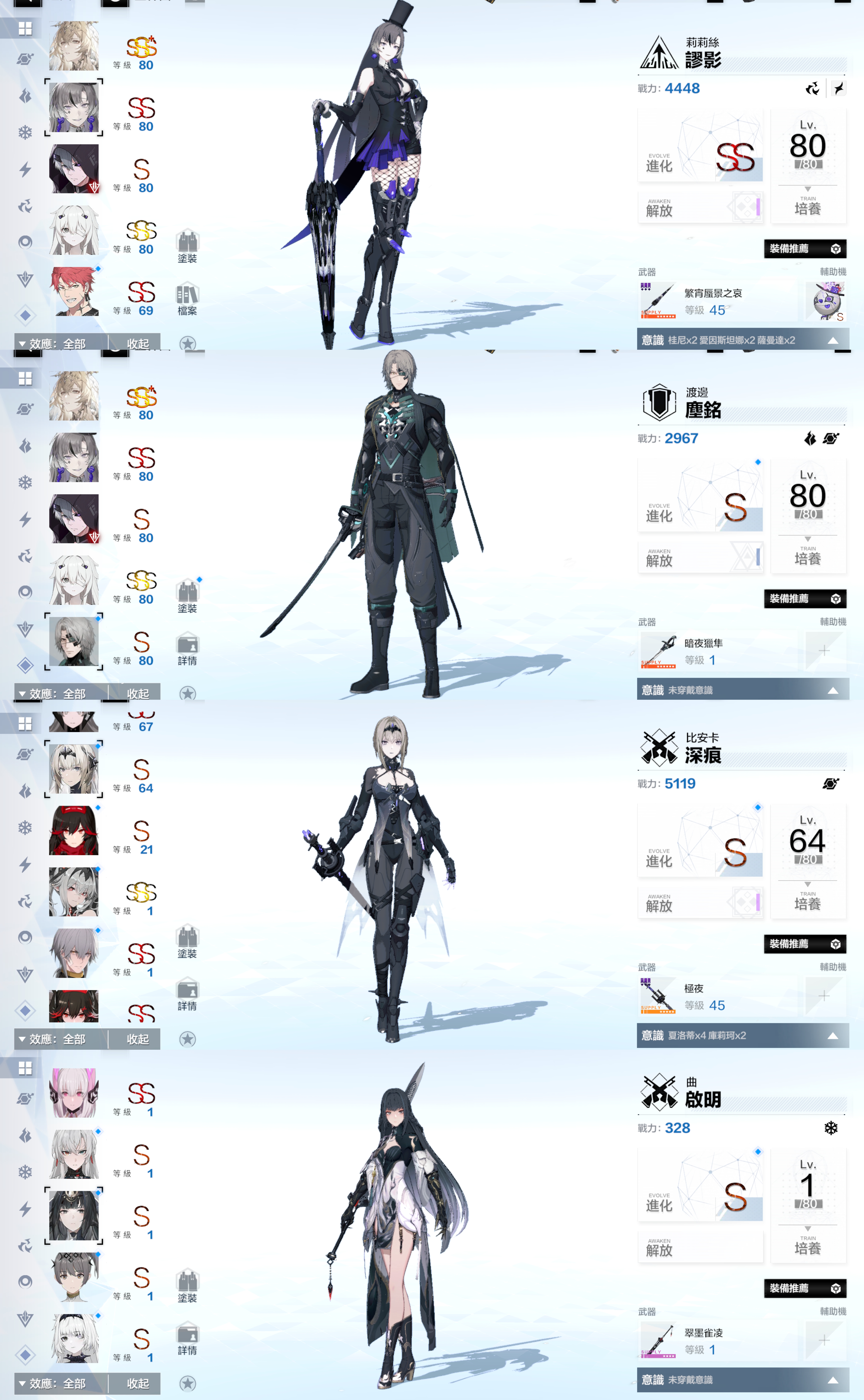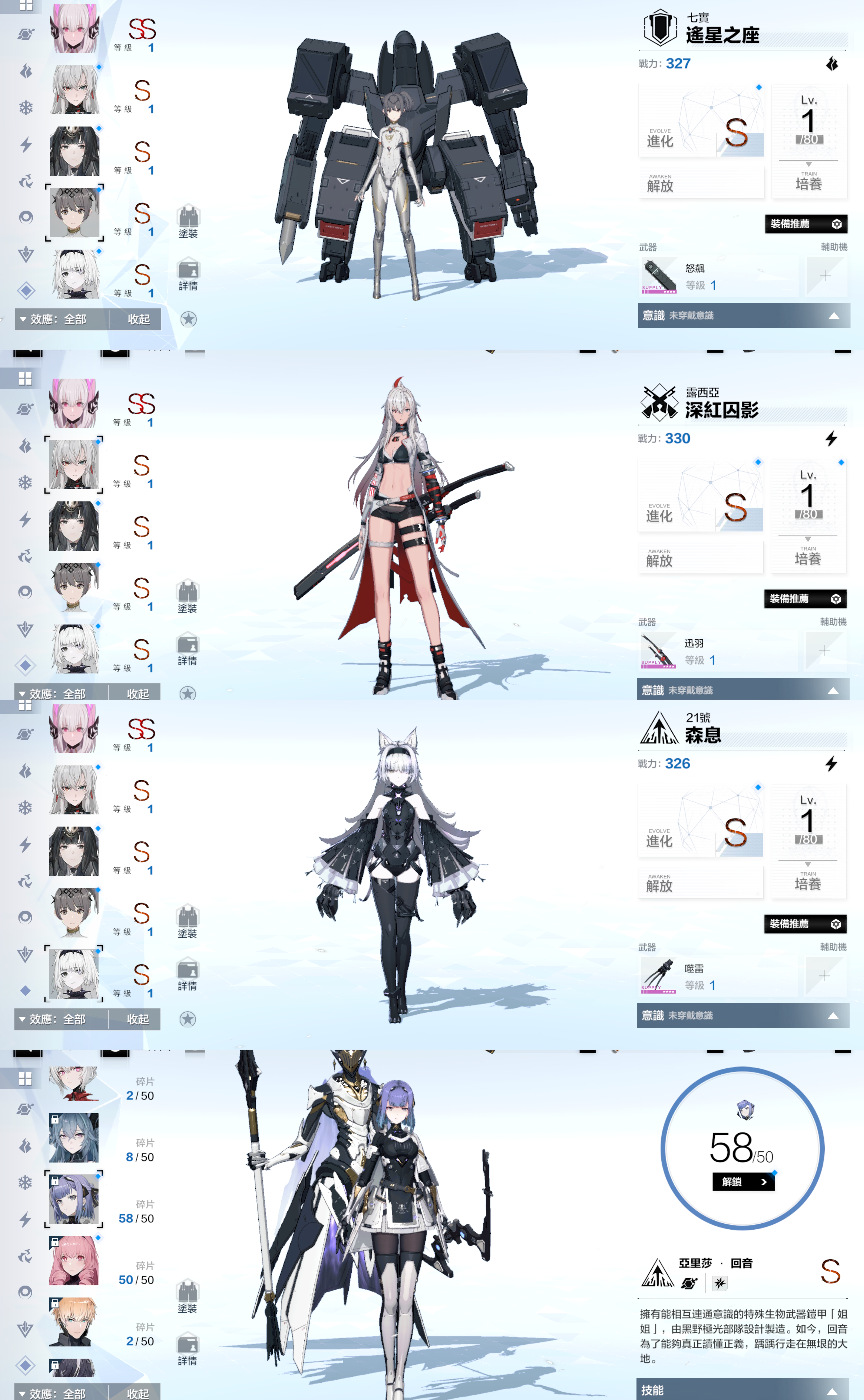 ◆貿易憑據:42709(50652就夠在商店換碎片將莉莉絲謬影升至SSS,暉暮傷害會更高,再等新暗裝甲,目前可用暗A甲21號或新手自選S暗能過渡。)