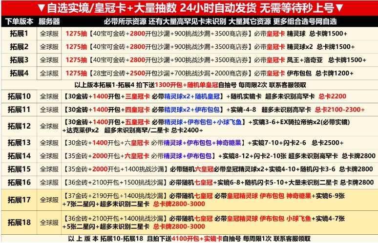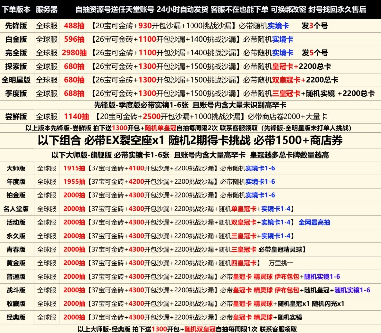 | 永久版 | 37寶可金磚+4300開包沙漏+2200挑戰沙漏+隨機三皇冠卡+實鏡卡1~6 | 800 |
