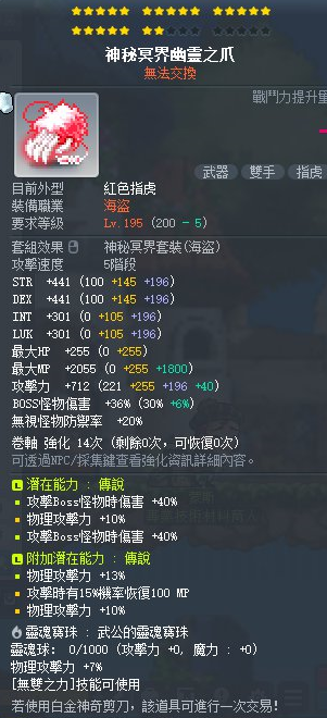 道具 【神秘冥界幽靈之爪】 22星 7%物攻 武公 雙B物 80B10物攻 究極 5白 23物攻 雙傳 雙S
