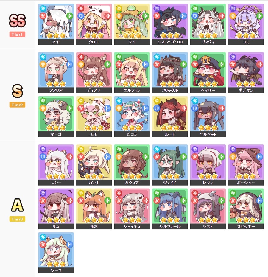 T1角色參考:基狄恩[憂鬱]、桃桃[活潑]、路徳[活潑]、蒂亞娜[狂亂]、艾爾芬[天真]、馬爾[天真]、海莉[天真]、艾蜜莉雅[冷靜]、芙莉可[冷靜]、皮可菈[冷靜]、佩佩[冷靜]