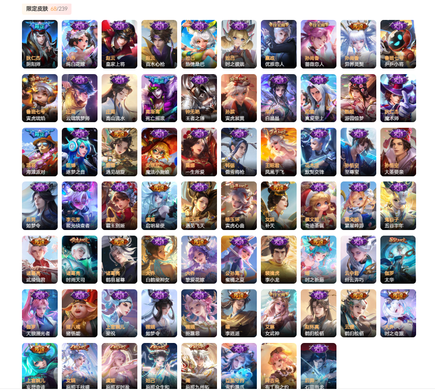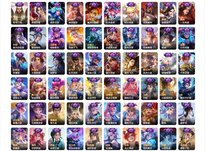 史诗皮肤:妲己魅力维加斯、妲己女仆咖啡、妲己热情桑巴、妲己时之彼端、廉颇地狱岩魂、小乔纯白花嫁、小乔缤纷独角兽、小乔青蛇、赵云未来纪元、赵云皇家上将、赵云百木心枪、墨子金属风暴、墨子龙骑士、嬴政摇滚巨星、嬴政优雅恋人、孙尚香水果甜心、孙尚香蔷薇恋人、孙尚香时之恋人、鲁班七号电玩小子、鲁班七号乒乒小将、庄周云端筑梦师、庄周高山流水、刘禅绅士熊喵、刘禅天才门将、阿轲节奏热浪、钟无艳王者之锤、孙膑寅虎展翼、白起星夜王子、芈月白晶晶、吕布圣诞狂欢、吕布末日机甲、周瑜真爱至上、夏侯惇乘风破浪、甄姬冰雪圆舞曲、甄姬游园惊梦、曹操幽灵船长、宫本武藏鬼剑武藏、李白千年之狐、狄仁杰魔术师、狄仁杰鹰眼统帅、项羽苍穹之光、貂蝉圣诞恋歌、貂蝉逐梦之音、貂蝉唤灵魅影、安琪拉魔法小厨娘、安琪拉心灵骇客、安琪拉时之奇旅、程咬金功夫厨神、露娜紫霞仙子、露娜一生所爱、刘邦德古拉伯爵、韩信傲雪梅枪、王昭君偶像歌手、王昭君凤凰于飞、兰陵王暗隐猎兽者、花木兰水晶猎龙者、花木兰默契交锋、艾琳奇遇舞章、不知火舞魅语、亚瑟心灵战警、孙悟空至尊宝、孙悟空大圣娶亲、后羿如梦令、张飞乱世虎臣、李元芳逐浪之夏、虞姬霸王别姬、杨玉环遇见飞天、杨玉环寅虎心曲、杨玉环银翎春语、杨戬天秀启明、雅典娜冰冠公主、蔡文姬奇迹圣诞、蔡文姬舞动绿茵、蔡文姬繁星吟游、鬼谷子五谷丰年、诸葛亮黄金分割率、大乔猫狗日记、大乔白蛇、大乔白鹤梁神女、铠曙光守护者、公孙离蜜橘之夏、公孙离无限星赏官、裴擒虎李小龙、瑶遇见神鹿、云中君纤云弄巧、伽罗天狼溯光者、孙策猫狗日记、猪八戒猪悟能、上官婉儿梁祝、嫦娥如梦令、嫦娥拒霜思、海月浮梦罗烟、西施诗语江南、李元芳匿光侦查者、赵怀真鹤归松栖、阿轲化蝶舞、狂铁龙之律动、百里守约雪豹霜爪、后羿石田雨龙、雅典娜黎明之约、百里玄策原初追逐者、元歌云间偶戏、蒙犽狂想玩偶喵、明世隐吟游魔法、刘禅鸭鸭历险记、鲁班七号狮舞东方、黄忠火炮绅士、李元芳银河之约、阿轲迷踪丽影、干将莫邪真爱魔法、米莱狄胡桃异想国、典韦蓝屏警告、兰陵王驯魔猎人、嬴政白昼王子、马可波罗暗影游猎、孙膑茶境仙、老夫子航海奇遇记
