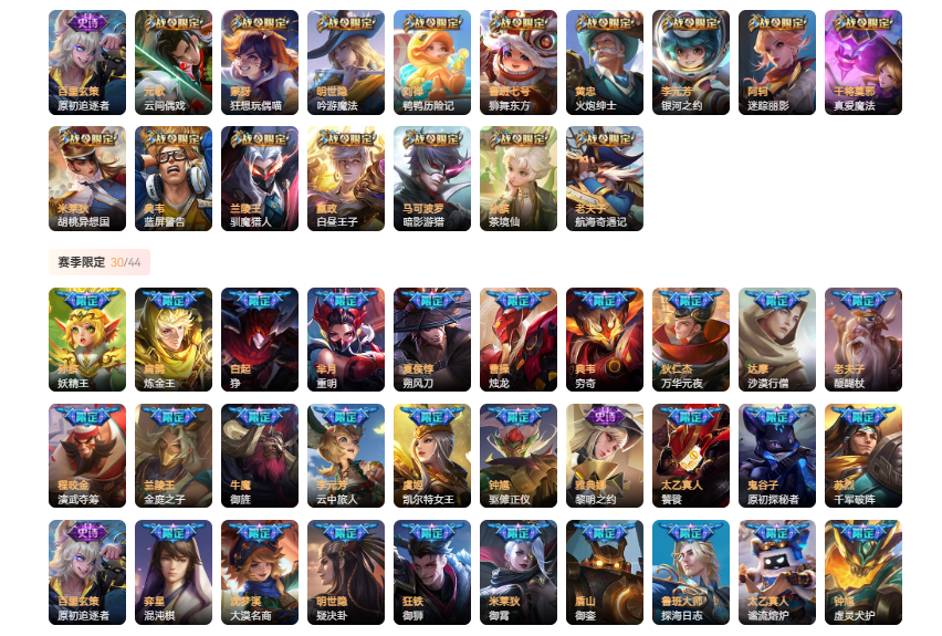赛季限定:孙膑妖精王、扁鹊炼金王、白起狰、芈月重明、夏侯惇朔风刀、曹操烛龙、典韦穷奇、狄仁杰万华元夜、达摩沙漠行僧、老夫子醍醐杖、程咬金演武夺筹、兰陵王金庭之子、牛魔御旌、李元芳云中旅人、虞姬凯尔特女王、钟馗驱傩正仪、雅典娜黎明之约、太乙真人饕餮、鬼谷子原初探秘者、苏烈千军破阵、百里玄策原初追逐者、弈星混沌棋、沈梦溪大漠名商、明世隐疑决卦、狂铁御狮、米莱狄御霄、盾山御銮、鲁班大师探海日志、太乙真人谧流熔炉、钟馗虚灵犬护