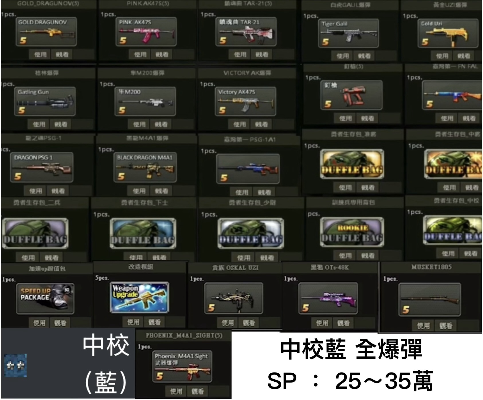 商品代號價格軍階SP槍枝/道具全爆彈軍階包
