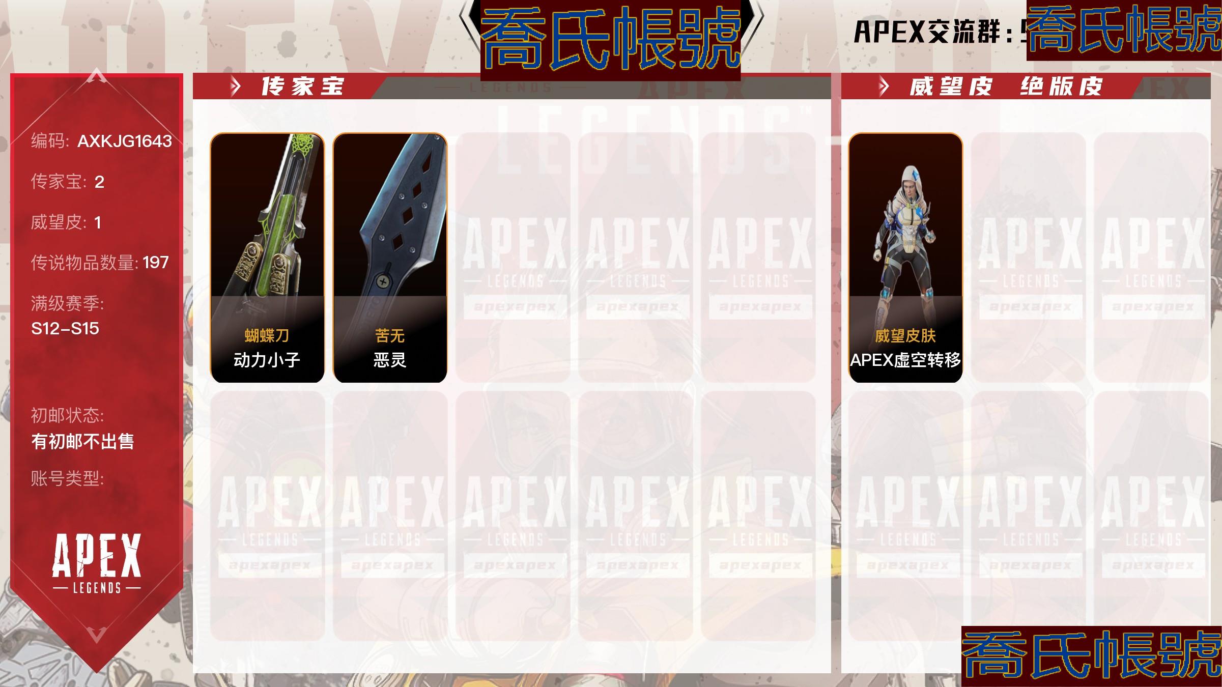 【OBAXKJG164342】2傳家寶,1威望皮, 197金,賽季滿級:S12賽季,S13賽季,S14賽季,S15賽季;傳家寶:動力小子-蝴蝶刀,惡靈-苦無,威望皮:APEX虛空轉移,GK6713/2傳/1威望/動力小子蝴蝶刀/惡靈希望的黃昏/Apex虛空轉移3級/197金皮/【排位】5鑽石徽章/12-15賽季滿通【槍皮】黑曜石之夜/啟示錄/紳士球星/冷冰冰/搜尋救援/子彈瘟疫/外域雪崩/織夢者/粉彩完美/極地校準/正義之詩/嚴冬之魂/縱火狂/瘋狂頻率/賞金獵人/狂野西部/宇宙大炮/冷聲作用/先驅/黃金脊椎/冰點/破壞者/頭條人物/衝動/兵荒馬亂/【皮膚】宇宙執行者/郵購怪物/菲茨羅伊教授/橫行無忌/環繞立體聲/虛空行者/生化危機/生物物理學/生物技術/獵手之心/職業殺手/心跳協調者/王牌高度/貝斯演奏/自由花式/復仇者/違法犯罪/宇宙守護者/實地研究/閃電之魂/此薩利非比薩利/科技魔術師/【詳情看截圖】