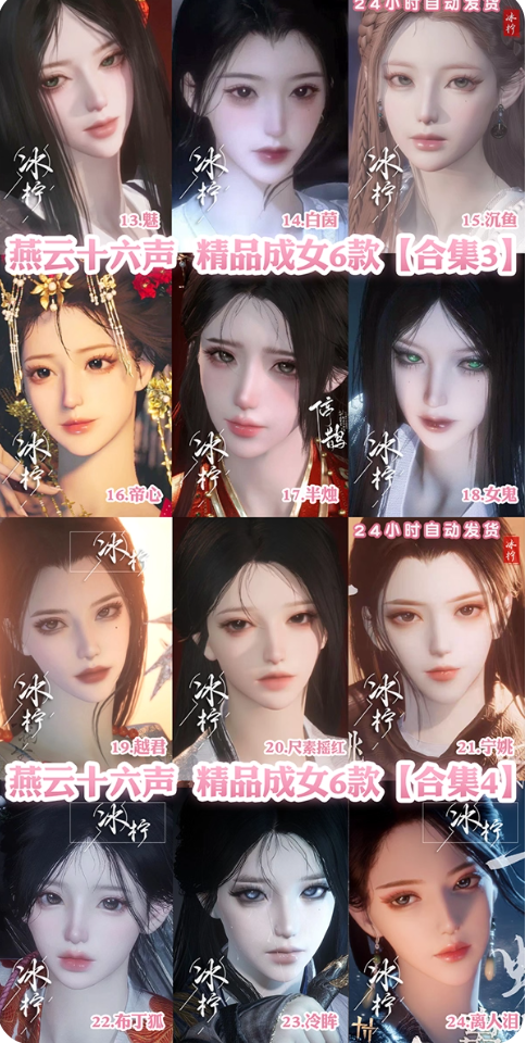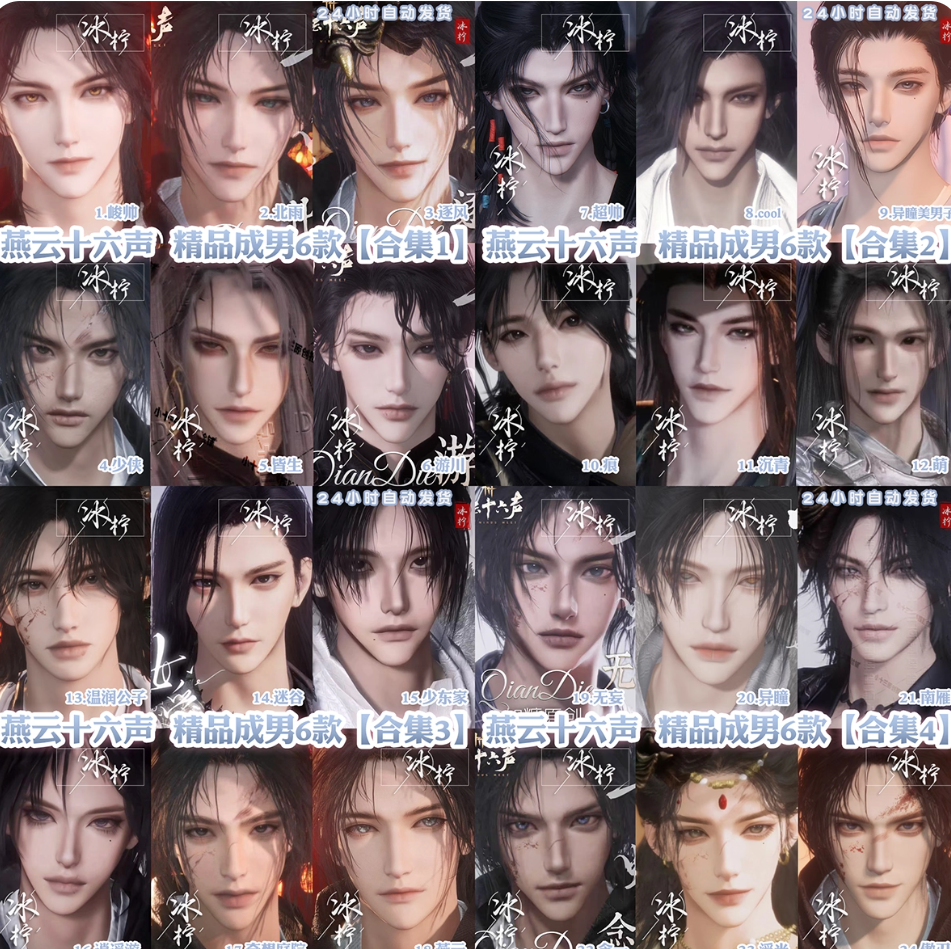套裝:問春何苦/人間仙/烏紗紅漪/無間無相/晏平生/葬花吟/天上白玉京/月中天闕/雪滿川/滄海龍吟/風吟彼岸/樂神師延/青丘千歲/如碎霜天/劍影藏心/卿知吾心/金鱗闕/風花霧/快哉風/青玉案/浣溪沙/鵲踏枝/清音曉/紫薇闕/賀新詞/雁還鄉/紅塵書/霜寒天泉/難問青溪/芳時歇/午風清/南風熏/相思曲/望鄉客/壹心三藏/逐紅花/遙夜行/江湖客/雨停荷/宿露輕盈/花月天真/驪山獵/舞花間/松花玉蘭/上青雲/赤沙/將星入命/爭戈/白龍/封侯/鐵馬金戈/射虎南山/螭骨/暗香/白衣修羅/墨沈丹朱/燃金明/青陽/落花聞詔/瑞鶴仙/青草原/夢尋虎跑/鯉傳尺素/阮郎歸/雪貍兒/雲遙鶴影/蓬萊翎/清河強者/金池鯉/翠羽顧/梨花淚/蠍心蛟影/夜郎幽問/龍鳳纏/西涼鬼嘯/鵲銜夜/蜀戲春/穿雲遊雪/南疆秘語/歲時安/月如銀/九間當鋪/馳走西風/蟬翼未來