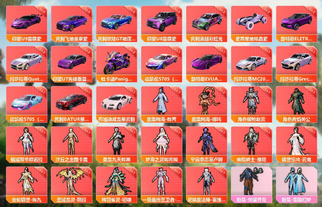 (套餐7):和平精英成品號【套裝100套左右,槍械100套左右,有6粉裝以上】+粉裝包含,車皮,衣服,槍械、粉色稀有,,可充值,可加好友,可排位,可改密碼,可改手機《6400元》
