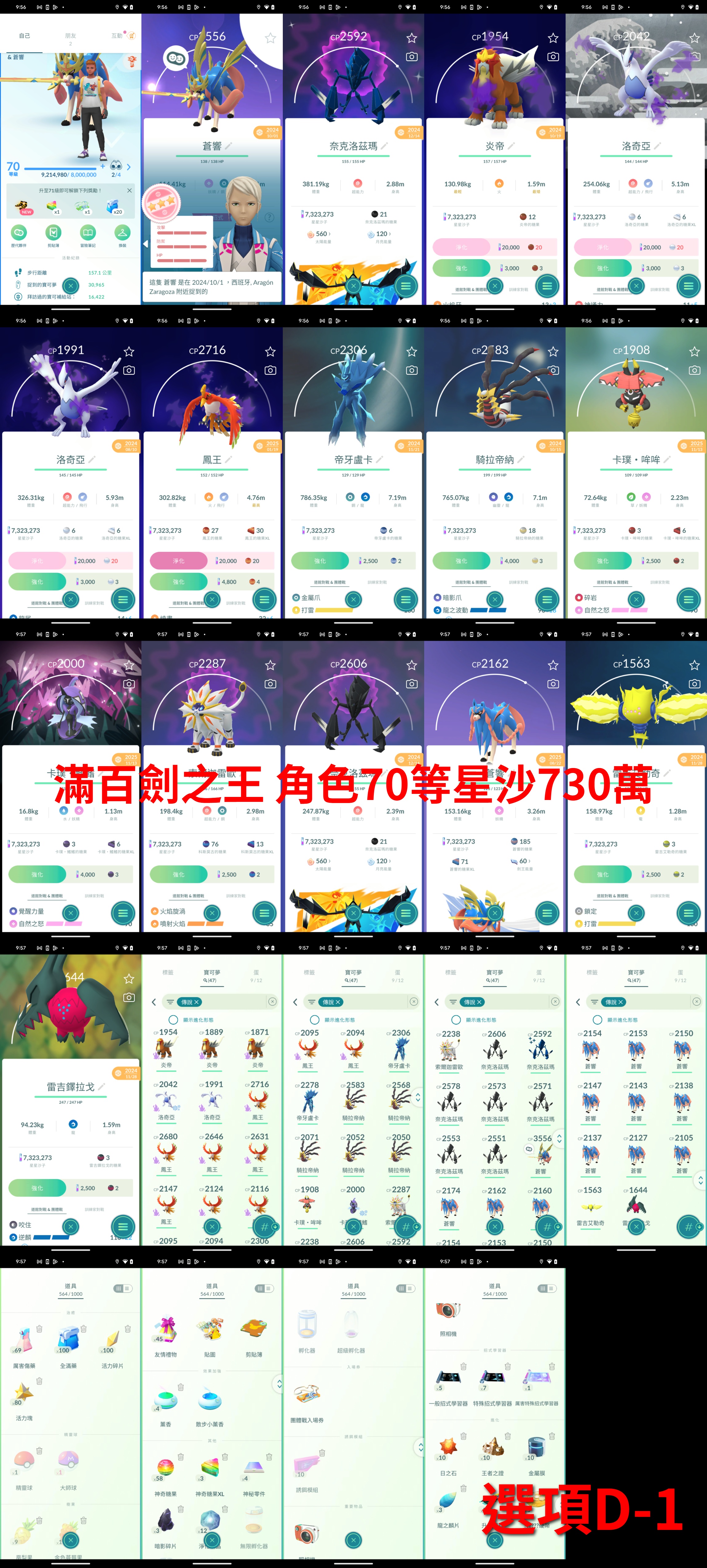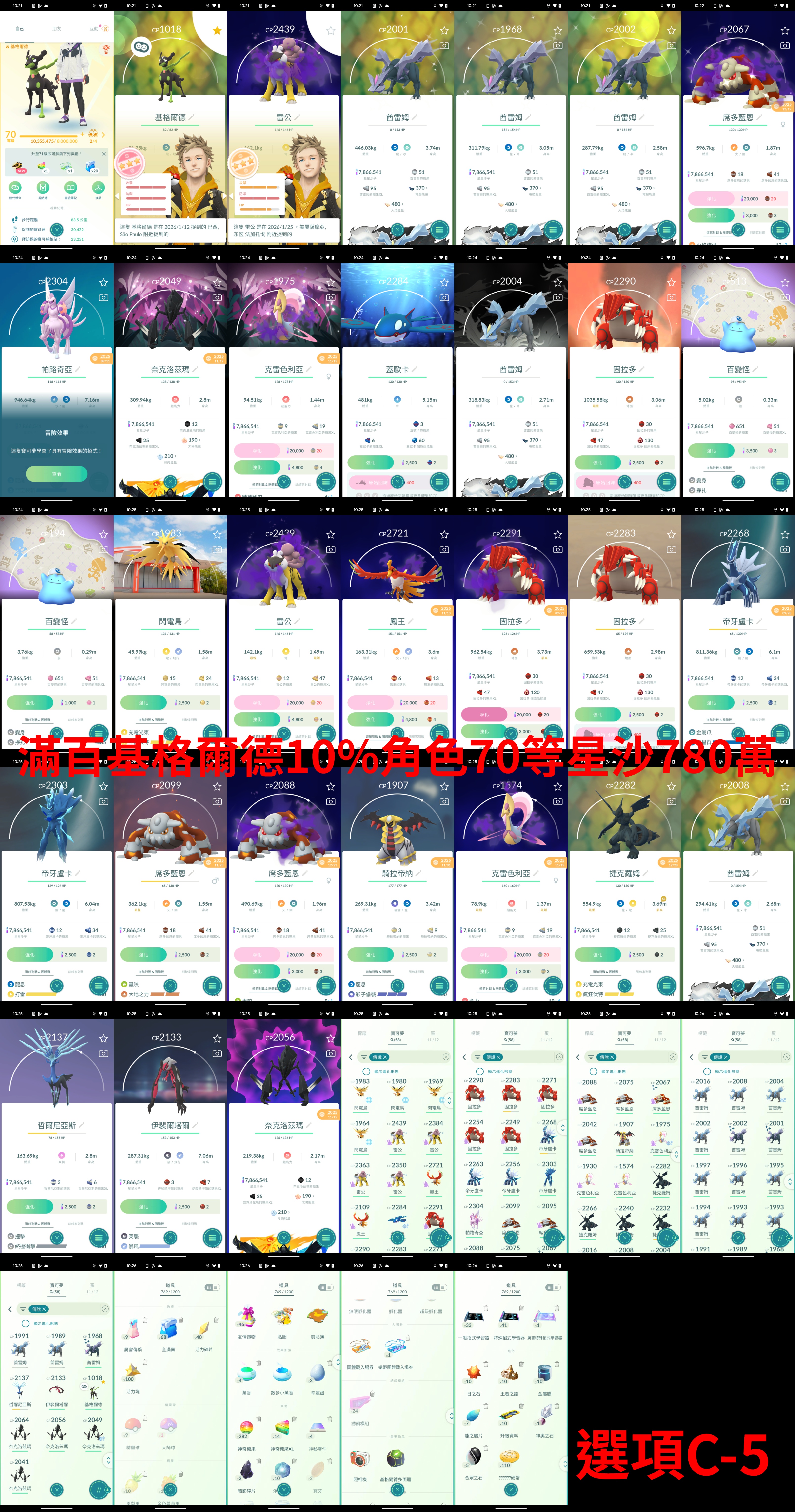 (選項E-9) 角色等級70星沙910萬 滿百基格爾德"完全體"+百超級列空座+百蓋歐卡+百鳳王2隻 列空座隕石未使用*1 異色帝牙盧卡 有特招 異色帕路奇亞 有特招 神獸135隻