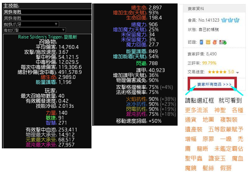 2.我賣的流派(不包含小資)有3大保證 A.滿暴擊滿命中(除了不用暴擊或命中的流派) B.如果有用魔血的話 功能藥劑後綴保證T1詞(暴擊-全抗-攻速施速-閃避護甲-跑速這些等等)+洗好點燃石效果 C.附上POB數據 讓你核對裝備 安心有保障