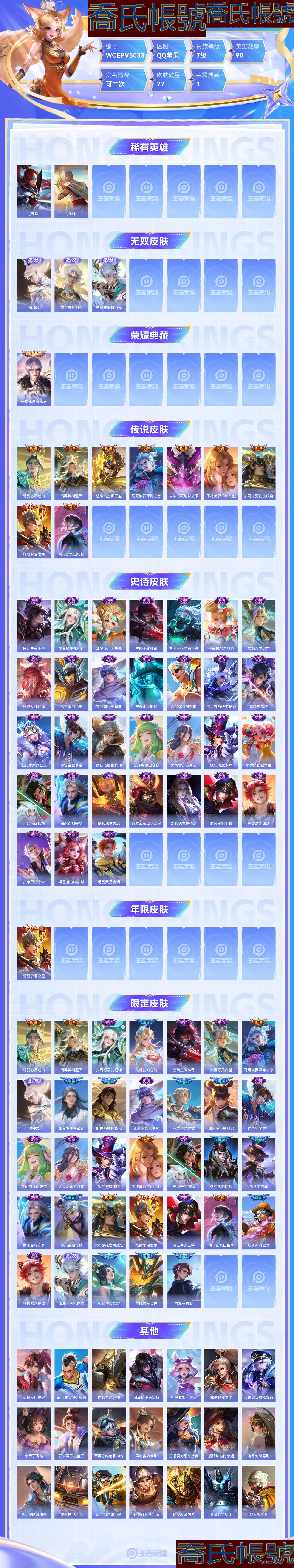 【OBWCEPV503342】 無雙3 典藏1 星元1 傳說9 史詩31 限定33 英雄90 皮膚77 稀有英雄2 貴族7級 總場次1054 皮膚價值:78016 【無雙皮膚3】 鎧神罪 李白碎月劍心 諸葛亮天機白澤 【榮耀典藏1】 諸葛亮星域神啟 【星元皮膚1】 宮本武藏幽冥之眼 【傳說皮膚9】 楊戩縱目遷山 后羿神樹通天 達摩黃金獅子座 馬可波羅深海之息 宮本武藏地獄之眼 干將莫邪千山共赴 大司命死亡執政官 楊戩永曜之星 司馬懿九山相柳 【史詩皮膚31】 白起星夜王子 少司緣巫禮祀神 沈夢溪月團寄思 蘭陵王儺神司 蘭陵王暗隱獵獸者 孫尚香水果甜心 女媧萬靈啟世 妲己女僕咖啡 呂布末日機甲 萊西奧光弋星穹 曹操幽靈船長 夏侯惇乘風破浪 百里守約特工魅影 蒼狼魂孤將 雅典娜冰冠公主 孫悟空至尊寶 狄仁傑鷹眼統帥 公孫離塗山容容 大司命東方月初 狄仁傑魔術師 小喬繽紛獨角獸 元歌雲間偶戲 周瑜百相守夢 廉頗地獄巖魂 宮本武藏鬼劍武藏 劉邦德古拉伯爵 趙雲皇家上將 狂鐵龍之律動 黃忠百相守夢 妲己魅力維加斯 楊戩天秀啟明 【年限皮膚1】 楊戩永曜之星 【限定皮膚33】 楊戩縱目遷山 后羿神樹通天 少司緣巫禮祀神 艾琳鶴鳴心箋 蘭陵王儺神司 女媧萬靈啟世 馬可波羅深海之息 鎧神罪 張良羅小黑戰記 明世隱往憶暉光 萊西奧光弋星穹 亞瑟榮光之誓 哪吒羅小黑戰記 孫悟空至尊寶 公孫離塗山容容 大司命東方月初 狄仁傑魔術師 干將莫邪千山共赴 元歌雲間偶戲 狄仁傑陰陽師 鬼谷子克喵 周瑜百相守夢 孫策百相守夢 大司命死亡執政官 楊戩永曜之星 趙雲皇家上將 司馬懿九山相柳 項羽海灘派對 狂鐵龍之律動 諸葛亮天機白澤 甄姬逆浪荇歌 鍾馗虛靈犬護 白起死霸裝 【其他21】 孫權徑山謀武 馬可波羅激情綠茵 白起白色死神 司馬懿魘語軍師 妲己紫羅蘭之誓 韓信教廷特使 諸葛亮星航指揮官 小喬丁香結 雲中君雲械藍圖 百里守約絕影神槍 桑啟青衿臨川 王昭君幻想奇妙夜 虞姬加勒比小姐 海月幻泉霧影 萊西奧踏浪烽翎 典韋鐵甲之心 后羿阿爾法小隊 狂鐵命運角鬥場 楊戩埃及法老 亞瑟死亡騎士 趙雲忍炎影 【稀有英雄2】 _韓信 _金蟬【手Q139區】【QQ蘋果】【榮耀王者】【國標擁有情況為賣家自主勾選,詳情以真實驗號為準】場次少不到一千2把不到,這個賽季83星想打百星的可以上