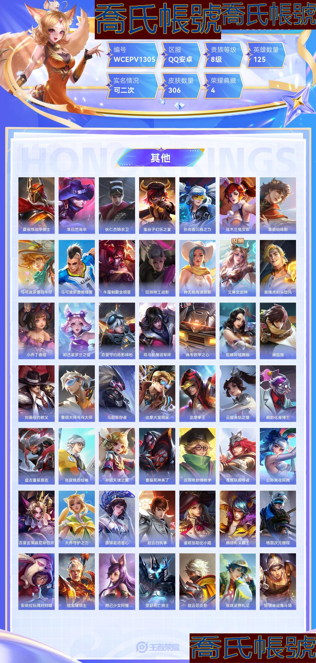【OBWCEPV130542】 典藏4 傳說28 史詩104 限定99 英雄125 皮膚306 稀有英雄9 貴族8級 總場次10529 皮膚價值:309146 【榮耀典藏4】 諸葛亮星域神啟 孫尚香殺手不太冷 李白鳴劍曳影 孫悟空全息碎影 【傳說皮膚28】 桑啟鳴野蒿 孫悟空齊天大聖 橘右京楓霜盡 馬可波羅深海之息 馬超無雙飛將 露娜啟示之音 虞姬啟明星使 孫策末日機甲 關羽武聖 孫尚香異界靈契 伽羅太華 趙雲淬星耀世 鎧絳天戰甲 曜李逍遙 孫尚香末日機甲 劉備時之戀人 李元芳飛鳶探春 宮本武藏地獄之眼 周瑜音你心動 曜雲鷹飛將 李信一念神魔 李白鳳求凰 后羿黃金射手座 鏡熾陽神光 狄仁傑超時空戰士 孫悟空零號赤焰 達摩黃金獅子座 諸葛亮時雨天司 【史詩皮膚104】 公孫離塗山容容 黃忠百相守夢 后羿石田雨龍 阿軻化蝶舞 弈星萬物之道 西施詩語江南 牛魔星界戰將 沈夢溪月團寄思 楊玉環遇見飛天 孫策貓狗日記 蒙犽頑巖魄 蔡文姬舞動綠茵 嬴政搖滾巨星 露娜紫霞仙子 百里玄策超元獵域 高漸離燃音魔法 諸葛亮黃金分割率 蒙恬榮光聖徽 蒙犽百解令 司空震地獄燃心 阿古朵江河有靈 嬴政暗夜貴公子 劉禪紳士熊喵 劉禪電玩爆裂旋風 蒙犽狂想玩偶喵 扁鵲奇幻香蹤 廉頗地獄巖魂 呂布末日機甲 夢奇頑趣 元歌無心 劉邦德古拉伯爵 鬼谷子五穀豐年 劉禪天才門將 狂鐵電玩高手 上官婉兒天狼繪夢者 貂蟬聖誕戀歌 明世隱吟遊魔法 瀾賞金獵手 公孫離玉兔公主 阿軻暗夜貓娘 大喬貓狗日記 甄姬冰雪圓舞曲 露娜一生所愛 雲中君時之祈願 黃忠火炮紳士 程咬金功夫廚神 亞瑟心靈戰警 雅典娜冰冠公主 小喬繽紛獨角獸 百里玄策原初追逐者 韓信傲雪梅槍 雅典娜黎明之約 嫦娥拒霜思 花木蘭水晶獵龍者 百里守約朱雀志 莊周高山流水 干將莫邪真愛魔法 司馬懿暗淵魔法 馬超神威 墨子金屬風暴 裴擒虎李小龍 張飛亂世虎臣 孫悟空孫行者 安琪拉時之奇旅 夏侯惇乘風破浪 韓信逐夢之影 老夫子航海奇遇記 白起星夜王子 妲己女僕咖啡 伽羅天狼溯光者 蒙犽龍鼓爭鳴 呂布聖誕狂歡 百里守約特工魅影 公孫離無限星賞官 伽羅箭羽風息 阿軻節奏熱浪 魯班七號電玩小子 李元芳逐浪之夏 米萊狄胡桃異想國 孫尚香時之戀人 曹操幽靈船長 關羽冰鋒戰神 鎧曙光守護者 馬可波羅逐夢之星 百里玄策熱力迴旋 娜可露露晚螢 橘右京修羅 項羽蒼穹之光 蘭陵王暗隱獵獸者 狄仁傑魔術師 狄仁傑鷹眼統帥 元歌雲間偶戲 安琪拉心靈駭客 孫尚香水果甜心 干將莫邪冰霜戀舞曲 趙雲未來紀元 虞姬霸王別姬 宮本武藏鬼劍武藏 王昭君偶像歌手 花木蘭默契交鋒 趙雲皇家上將 李白千年之狐 妲己魅力維加斯 羋月白晶晶 【年限皮膚4】 百里守約朱雀志 伽羅太華 李白鳳求凰 諸葛亮時雨天司 【內測皮膚3】 弈星萬物之道 高漸離玩趣惡龍 艾琳女武神 【限定皮膚99】 公孫離塗山容容 后羿石田雨龍 蘇烈春野閒蹤 阿軻化蝶舞 弈星萬物之道 太乙真人謐流熔爐 牛魔星界戰將 呂布逐霄戰戟 桑啟鳴野蒿 楊玉環遇見飛天 東皇太一噬滅天穹 蒙犽頑巖魄 姜子牙天穹之誓 周瑜熔金海岸 劉邦劍破天穹 沈夢溪龍舞盛年 百里玄策超元獵域 妲己靈卜魔法 高漸離燃音魔法 嫦娥漠中幻影 鬼谷子天穹祈燈 蒙恬榮光聖徽 蒙犽百解令 司空震地獄燃心 艾琳流音漫舞 阿古朵江河有靈 張良古海尋蹤 魯班大師探海日誌 蒙犽狂想玩偶喵 扁鵲奇幻香蹤 楊戩潮玩騎兵 高漸離玩趣惡龍 裴擒虎擒濤扼浪 孫悟空齊天大聖 桑啟海鹽詩旅 夢奇頑趣 元歌無心 鬼谷子五穀豐年 李元芳雲中旅人 橘右京楓霜盡 狂鐵電玩高手 馬可波羅深海之息 王昭君午後時光 上官婉兒天狼繪夢者 沈夢溪大漠名商 白起夜都怪俠 明世隱吟遊魔法 露娜啟示之音 蘭陵王金庭之子 虞姬啟明星使 公孫離玉兔公主 露娜一生所愛 雲中君時之祈願 黃忠火炮紳士 羋月幻夜卜夢 百里玄策原初追逐者 韓信傲雪梅槍 關羽武聖 達摩沙漠行僧 雅典娜黎明之約 嫦娥拒霜思 孫尚香異界靈契 艾琳女武神 百里守約朱雀志 莊周高山流水 干將莫邪真愛魔法 伽羅太華 馬超神威 后羿聖弓遊俠 裴擒虎李小龍 孫悟空孫行者 蘇烈千軍破陣 韓信逐夢之影 老夫子航海奇遇記 伽羅天狼溯光者 鍾馗驅儺正儀 墨子神蹟守衛 曜李逍遙 李白鳳求凰 米萊狄胡桃異想國 關羽冰鋒戰神 馬可波羅逐夢之星 達摩星際陸戰隊 程咬金演武奪籌 狄仁傑魔術師 元歌雲間偶戲 孫悟空零號赤焰 干將莫邪冰霜戀舞曲 虞姬霸王別姬 亞瑟潮玩騎士王 花木蘭默契交鋒 趙雲皇家上將 項羽海灘派對 諸葛亮時雨天司 狄仁傑陰陽師 狄仁傑萬華元夜 羋月白晶晶 鍾馗虛靈犬護 阿古朵布丁狗之約 【其他133】 程咬金星際陸戰隊 瑤森 明世隱占星師 影魅影綺裳 朵莉亞金色潮汐 萊西奧踏浪烽翎 露娜緋紅之刃 雲中君荷魯斯之眼 高漸離落日絃歌 高漸離金屬狂潮 空空兒戲夢巡演 魯班七號木偶奇遇記 戈婭玫藍誓約 阿軻愛心護理 姜子牙星夢巡禮 典韋鐵骨偃魂 諸葛亮掌控之力 蒼蒼林狼騎 露娜哥特玫瑰 阿古朵熊喵少女 金蟬前塵 張良一千零一夜 關羽龍騰萬里 西施歸虛夢演 鍾無豔生化警戒 大司命暗都幽影 程咬金群星魔術團 李白敏銳之力 弈星踏雪尋梅 鍾無豔春野之旅 廉頗功夫炙烤 桑啟畫中遊 甄姬花好人間 東皇太一東海龍王 后羿完美運算 上官婉兒修竹墨客 姜子牙時尚教父 程咬金無雙福將 劉備漢昭烈帝 曹操超能戰警 明世