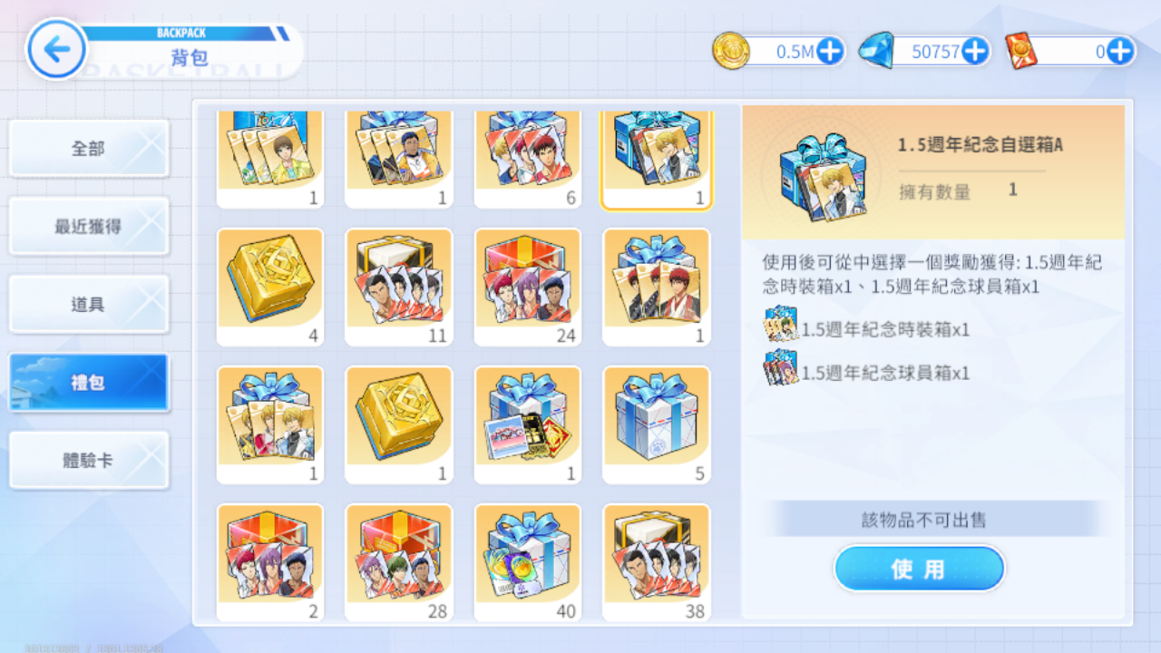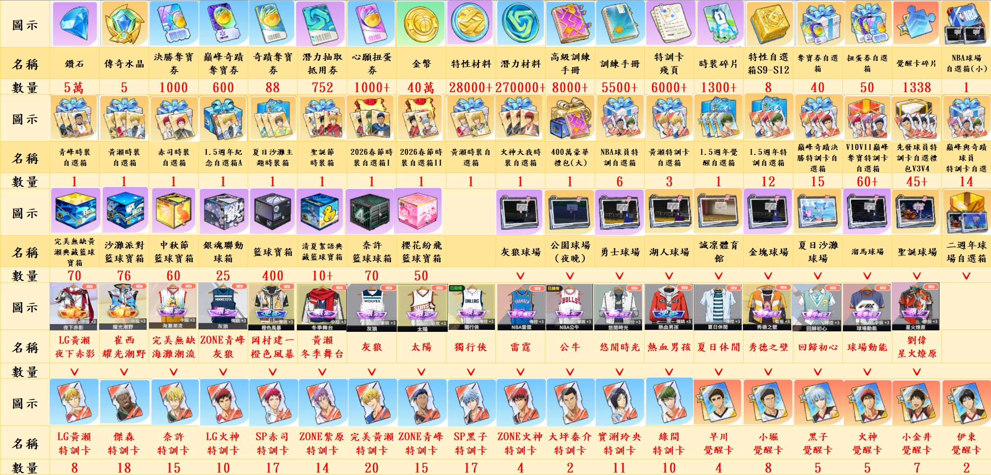 (九)黃瀨時裝自選箱、巔峰與奇蹟覺醒自選箱、青峰時裝自選箱、赤司時裝自選箱、夏日沙灘主題時裝、聖誕節時裝箱、1.5週年紀念自選箱A、2026春節時裝自選箱I、2026春節時裝自選箱II、火神大我時裝自選箱