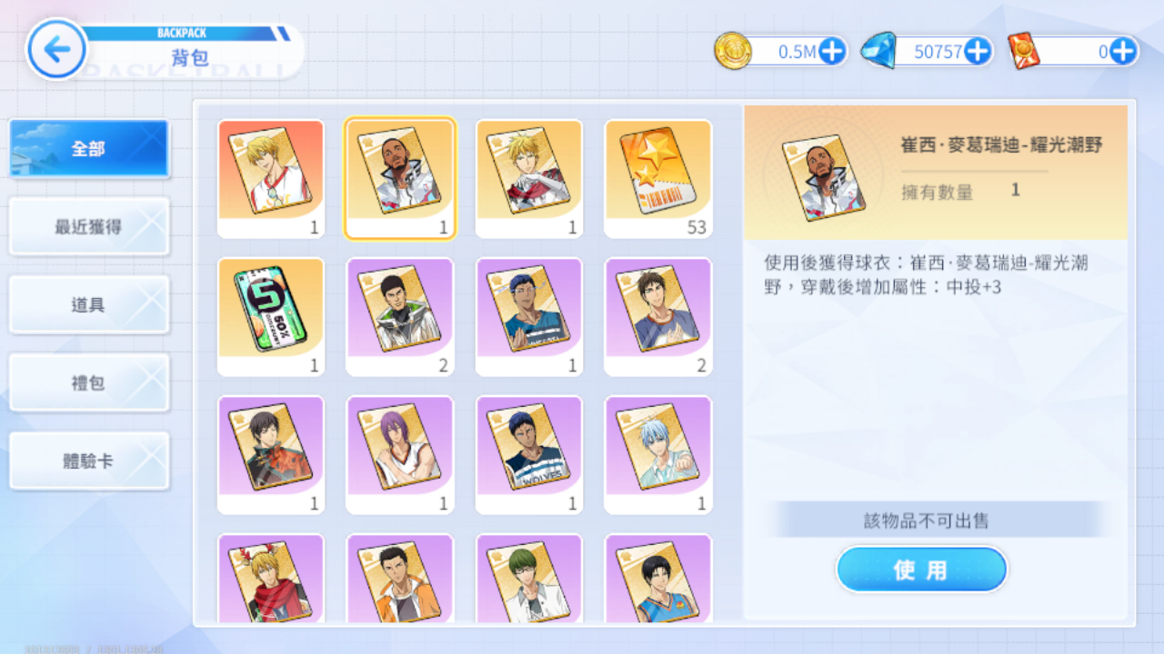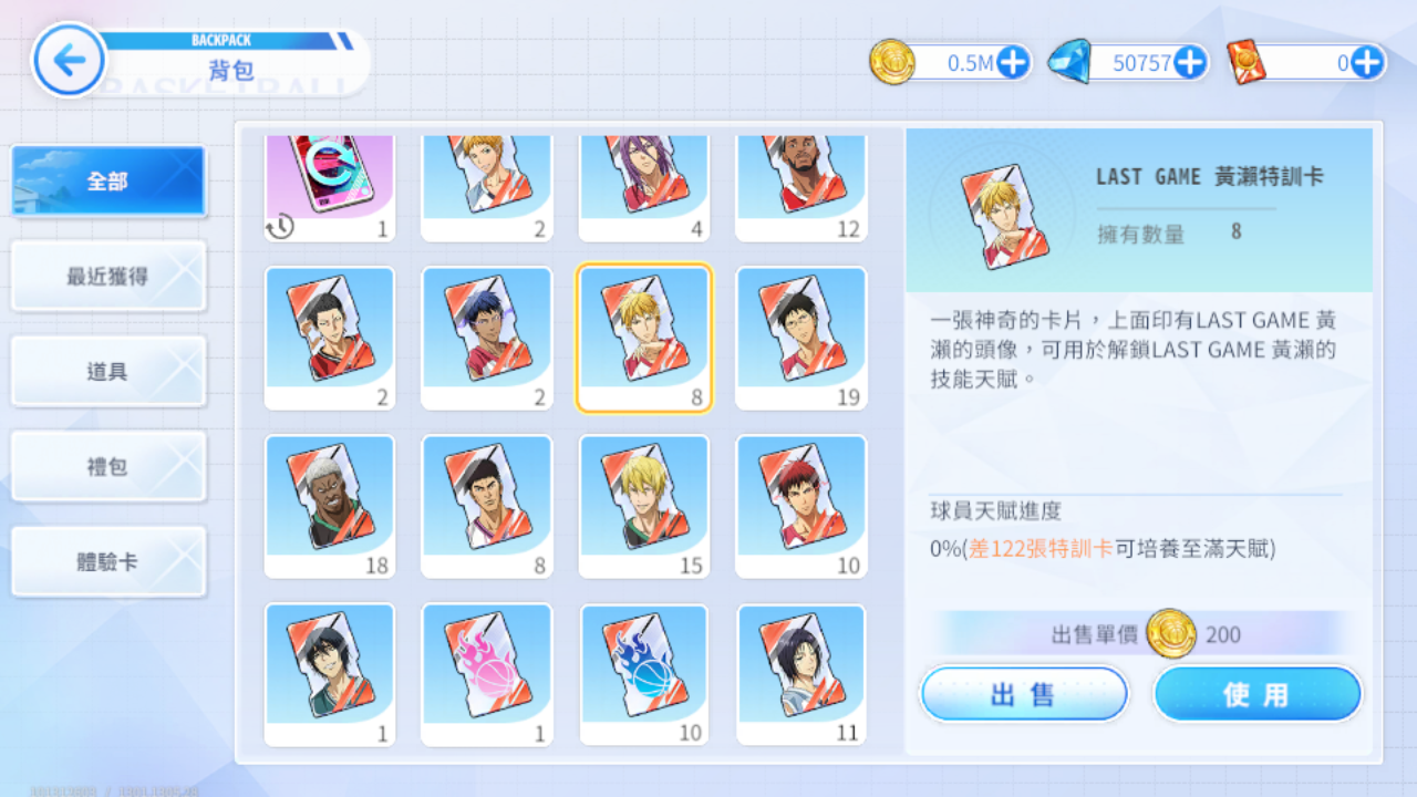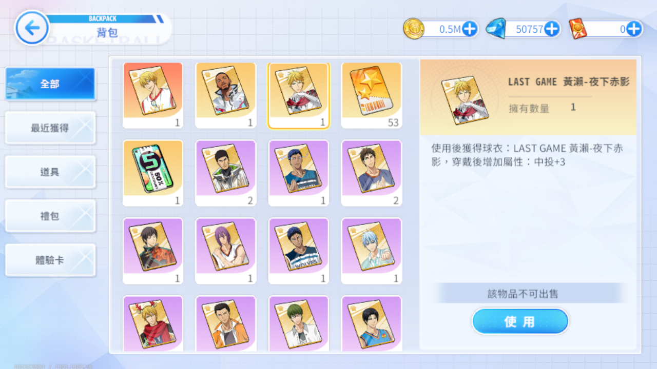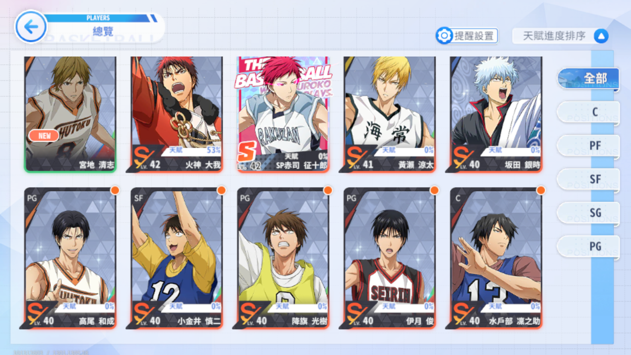 (四)LG黃瀨-夜下赤影/崔西-耀光潮野/完美無缺-海灘湖流/ZONE青峰-灰狼球衣/火神大我-NBA公牛/青峰大輝-NBA灰狼/紫原-NBA太陽/高尾和成-NBA雷霆/火神大我-熱血男孩/大坪-秀德之壁/黑子哲也-夏日襯杉/黑子哲也-回歸初心/黑子哲也-獨行俠/綠間-悠閒時光/木吉鐵平-球場動能/黃瀨涼太-冬季舞台/岡村建一-橙色風暴/