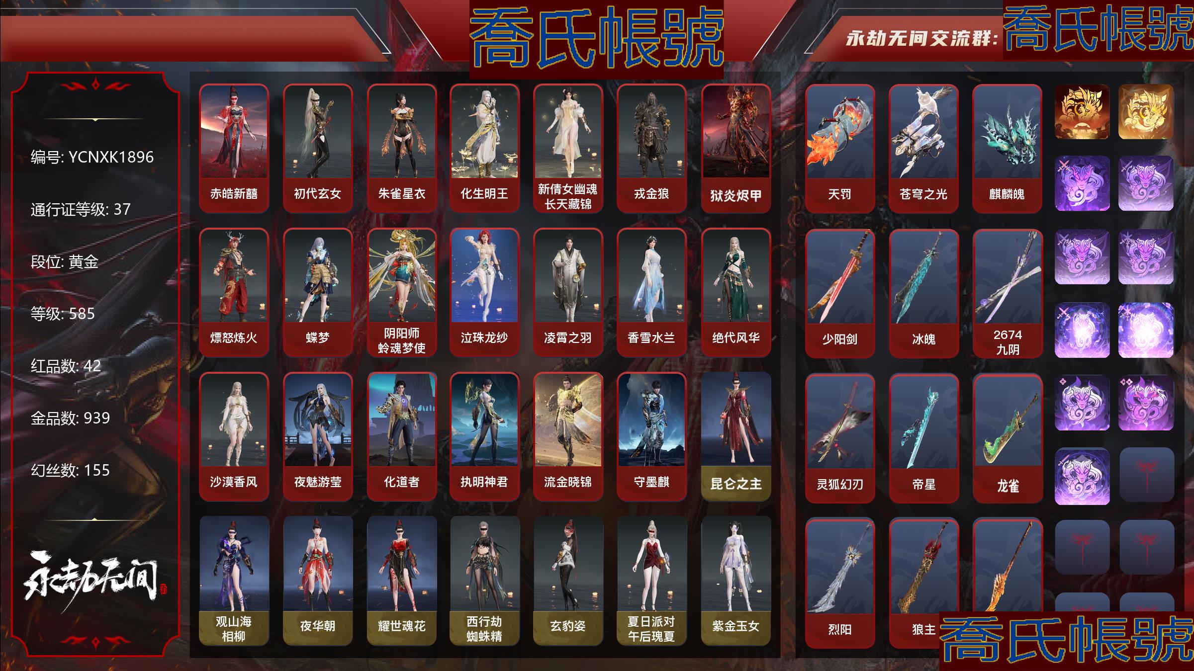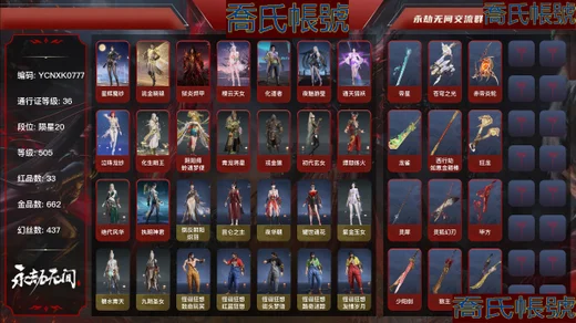 【YJYCNXK189611】42紅939金|等級585|黃金|幻絲155|金磚550|通行證Lv.37 紅色神品:赤皓新囍,初代玄女,朱雀星衣,化生明王,新倩女幽魂·長天藏錦,戎金狼,獄炎燼甲,熛怒煉火,蝶夢,陰陽師·蛉魂夢使,墨離,泣珠龍紗,凌霄之羽,香雪水蘭,絕代風華,沙漠香風,夜魅遊瑩,化道者,執明神君,流金曉錦,守墨麒,天罰,蒼穹之光,麒麟魄,少陽劍,冰魄,2674·九陰,靈狐幻刃,帝星,龍雀,烈陽,狼主,悍虎斬,飛將戟,涯角,靈犀,西行劫·如意金箍棒,天瓊,錦鯉玉扇,狂龍,鳳求凰,驚百里 角色金色皮膚:崑崙之主,觀山海·相柳,夜華朝,耀世魂花,西行劫·蜘蛛精,玄豹姿,夏日派對·午後瑰夏,紫金玉女,紅川仙子,丹青墨意,九陰聖女,P5R·奧村春NOIR,綠野守護·悠竹萌客,夏日派對·初夏緋莓,楚韻九歌·山鬼,武道無窮·詠春,綺雲衫,觀山海·腓腓,西行劫·紫衣仙子,絮雲衣,覺明尊者,冬日綺韻·白熊,武道無窮·少林,若水尊者,梨園傳奇·法海,龍之影·生死局,覺之一念,八寶龍王,裟伽龍王,九州遺珍·福壽仙,甜夜安眠·鵝黃紗夢,鑄神·天祿瑞光,智繪·萍之緣,沐昭,新倩女幽魂·瑤光沐月,新倩女幽魂·流紈裙,怪誕狂想·友情歲月,鬥羅大陸·唐三,噬月天狼,龍之影·龍虎鬥,追獵,不良人·李星雲,長歌詩韻·鷓鴣天,巫師3·傑洛特,巨闕,逆水寒·染煙,2674·街頭烈火,龍心熾焰,庖丁·食神,瑞火麟,龍之影·精武魂,聞道,立天地,遊四海,夏日派對·高校水著,春桃笑,龍之道·至純,天鈿女命,御宅羅夢,清雅少女,貴胄少女,陰陽師·灼舞桃節,決戰平安京·朔夜遊方,決戰平安京·神罰之光,妖刀姬,甜夜安眠·琉璃香檳,汐淚,庖丁·餚嬋,綠野守護·暗沼摩羅,阿娜希塔,楚韻九歌·湘夫人,巨鯨客,探海裙,赤霧煙霞,夏日派對·弄潮逐浪,蟄龍吟,掌珠仙子,怒浪,鎮海龍,煦陽漫敘,倒反陰陽·鐵面,長歌詩韻·戍關將,複製體·尼爾,常勝袍,百戰·破荊者,弘毅袍,龍之影·過江龍,守誓者,驍騎,黃庭道,梨園傳奇·柳生,封神錄·申公豹,司天命,幽篁山鬼,靈鹿巫者,朝聞道,未濟袍,金羽客,祿運玉霄,紫微星命,封神錄·龍吉公主,赤丹朱湛,寒英素雪,禍津素盞,擊浪,麟鹿大鎧,花之傾奇,蒼雷丸,倒反陰陽·凜冬,巔峰極速·蕾雅,千秋匠心·玉葉景,長歌詩韻·胡旋女,觀山海·青鳥,神鷹之女,火羅聖女,浣煙紗,龍之道·求真,福瑞天澤,葫蘆兄弟·蛤蟆頭領,千秋匠心·杜虎符,街頭狂歡·不敗擂主,觀山海·秋神蓐收,西行劫·悟空,行空裘,冬無歸,熾火照夜,夏日派對·盛夏白陽,干將莫邪,護世四法·持國天王,百戰·斷鏈,觀山海·冬神玄冥,春不斂,夏日派對·赤夏悠漾,封神錄·妲己,春日序曲·赤羽,護世四法·廣目天王,日影花陰,黃昏巫主,楚韻九歌·雲中君,夜綢袍,長歌詩韻·念奴嬌,壽竹雲春,觀山海·文鰩,虹貓藍兔七俠傳·虹貓,金財聚輝,封神錄·姜子牙,雲間影,赤焰戰靈,綠野守護·山漠獰影,天虹詠,開闢鴻蒙·日月明,暖冬茶馨,雪鈴綺歌,長歌詩韻·如夢令,不良人·袁天罡 髮型金色皮膚:(挑染)泠川發,縹緲發,簪纓發,(挑染)雲霞發,落霜發,百靈發,韶光發,綠野守護·嬌憨發,(挑染)千絲發,P5R·NOIR髮型發,(挑染)自在發,緣覺發,子菀發,(挑染)白芷發,蘇木發,紫芙發,伏苓發,(挑染)暮落髮,甜夜安眠·暖絨發,九州遺珍·春桃發,(挑染)騰煙發,逆水寒·江海發,(挑染)熛怒發,巫師3·白狼發,不良人·三聖涅發,(挑染)水仙發,月丹發,月下香發,木棉發,(挑染)沸海發,碎浪發,激浪發,浩渺發,安瀾發,鯨海發,赤滔發,綠野守護·冷傲發,甜夜安眠·夜歌發,皰丁·沸涓發,倒反陰陽·銘誓發,(挑染)萬仞山發,(挑染)清威發,竹律發,九梁發,冰凌發,封神錄·紅鸞星發,排霜發,(挑染)忠嘉發,閻摩發,朝顏發,翔鸞發,玉兒發,夕鷹發,觀山海·青鸞發,千秋匠心·琳琅發,觀山海·天刑發,(挑染)桀驁發,千秋匠心·疏狂發,(挑染)戾君發,(挑染)宵燭發,百戰·漆刃發,觀山海·冥泉發,流螢發,繾綣發,幽焰發,鶴髮,古溪發,封神錄·籠煙芍藥發,春日序曲·玄瑛發,驚雀發,(挑染)獅鬃發,秀逸發,長歌詩韻·豪傑發,(挑染)玄冥發,封神錄·仙風發,(挑染)逐影發,鶴姿發,蜜語發,(挑染)璀璨發,長歌詩韻·沉醉發,(挑染)牽雲霞發 武器金色皮膚:驚火弦,御氣弩,穿雲燕,咕咕,天牛翼,鎮海,平濤,狂嘯,朱雀,沉默審判,戲祥雲,綠野守護·雨幕,引冰落,金蠍,玉飛梭,螢火,獵獁銃,出淵蛟,石中火,天心玉,雪國禮炮,兔華籠,鑽山,觀山海·嘉果花,西行劫·陰陽二氣瓶,造景,墨雙戟-不歸,火羅衛,竹霹靂,吞海鮫,龍嘯,丹鶴,凝冰魄,赤霞,虎踞,鸚鵡螺,爐中火,星追月,心魔,月虹弦角,烏木弓,豹胎易筋弓,轉輪弓,風馳弓,青花,春水,日輝,狻猊吼,腥紅之月,蓮心劍雨,炎魔,不良人·華陽針,玄銅飛軍,翠影,詭刃八岐,醒獅,無相印,綠野守護·毛乎乎,天狐,2674·超越型,不良人·龍泉劍,虹貓藍兔七俠傳·長虹劍,虹貓藍兔七俠傳·冰魄劍,財神劍,巫師3·湖女之劍,琴心,亢龍,隱鋒,監星尺,複製體·月光與黑暗,西行劫·紫金寶劍,俠骨·清光引,劫燼·煉,赤霄,燭神令,鎮魔尺,華夏神兵·永樂寶劍,壺中日月,含光承影,陰陽師·傘劍,殘陽,黑繩,金玉一文字,櫻華,數珠丸,倒反陰陽·盡春鋒,雷厲,白鹿,盜墓筆記·黑金古刀,燭淚,無韻,塑夢鑰匙,青石猊,破天,龍蟠,陰陽師·魂夢殘響,山君怒,決戰平安京·朔方之刃,雷王鋸,陰陽師·妖刀,千鈞羽,斷月影,夏日派對·甜筒兔,麒麟牙,劫濤·潮,觀山海·朱明,西行劫·三尖兩刃刀,白菜刀,光威之矛,鎮山河,仙彩,靈木角,鬥羅大陸·海神三叉戟,觀山海·金神鉞,劫垢·堀,焦鈺,長虹,雪夜·