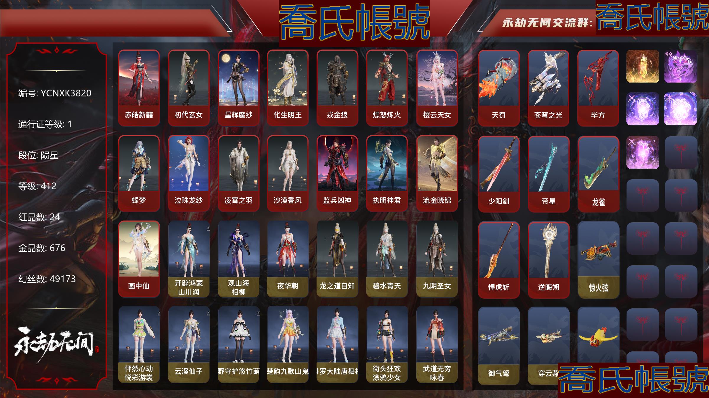 【YJYCNXK382011】24紅676金|等級412|隕星|幻絲49173|金磚288|通行證Lv.1 紅色神品:赤皓新囍,初代玄女,星輝魔紗,化生明王,戎金狼,熛怒煉火,櫻雲天女,蝶夢,泣珠龍紗,凌霄之羽,沙漠香風,監兵凶神,執明神君,流金曉錦,畫中仙,天罰,蒼穹之光,畢方,少陽劍,帝星,龍雀,悍虎斬,逆晦朔,初櫻綺夢發 角色金色皮膚:開闢鴻蒙·山川潤,觀山海·相柳,夜華朝,龍之道·自知,碧水青天,九陰聖女,怦然心動·悅彩遊裳,云溪仙子,綠野守護·悠竹萌客,楚韻九歌·山鬼,鬥羅大陸·唐舞桐,街頭狂歡·塗鴉少女,武道無窮·詠春,綺雲衫,觀山海·腓腓,2674·千機喵,覺明尊者,冬日綺韻·白熊,武道無窮·少林,八寶龍王,九州遺珍·福壽仙,甜夜安眠·鵝黃紗夢,鑄神·天祿瑞光,智繪·萍之緣,新倩女幽魂·瑤光沐月,怪誕狂想·致命玩笑,怪誕狂想·紅藍狂想,怪誕狂想·友情歲月,護世四法·多聞天王,鬥羅大陸·唐三,不良人·李星雲,長歌詩韻·鷓鴣天,巨闕,龍之影·精武魂,遊四海,洛天依·星空投影,巔峰極速·小可,三麗鷗家族·凱蒂貓,怦然心動·軟暖甜夢,拳皇·雅典娜,青燈,鬥羅大陸·小舞,長歌詩韻·遣唐使,新魔傑·辟邪帝姬,春日序曲·晨風,日道神子,夏日派對·高校水著,山吹茶,輝燁少女,春桃笑,龍之道·至純,天鈿女命,御宅羅夢,御宅花織,陰陽姬,清雅少女,貴胄少女,流火映真,陰陽師·赤影妖刀姬,妖刀姬,庖丁·餚嬋,綠野守護·暗沼摩羅,封神錄·敖丙,阿娜希塔,楚韻九歌·湘夫人,觀山海·文鰩,龍之道·無拘,倒反陰陽·鐵面,開闢鴻蒙·金戈止,常勝袍,華夏寶甲·漢光,龍之影·過江龍,P5R·雨宮蓮JOKER,黃庭道,封神錄·申公豹,武道無窮·太極,司天命,朝聞道,通玄,春日序曲·寒芷,祿運玉霄,封神錄·龍吉公主,夏日派對·仲夏霜華,赤丹朱湛,禍津素盞,麟鹿大鎧,拳皇·不知火舞,千秋匠心·玉葉景,浣煙紗,福瑞天澤,葫蘆兄弟·蛤蟆頭領,街頭狂歡·不敗擂主,封神錄·哪吒,夏日派對·盛夏白陽,干將莫邪,春不斂,封神錄·妲己,日影花陰,黃昏巫主,楚韻九歌·雲中君,天工奧妙,夜綢袍,長歌詩韻·念奴嬌,壽竹雲春,怦然心動·熱力節拍,正法袍,金財聚輝,封神錄·姜子牙,赤焰戰靈,綠野守護·山漠獰影,開闢鴻蒙·日月明,暖冬茶馨,雪鈴綺歌,長歌詩韻·如夢令,彩雲衣 髮型金色皮膚:(挑染)泠川發,簪纓發,(挑染)鬥羅大陸·龍蝶發,觀山海·忘憂發,韶光發,楚韻九歌·爛漫發,綠野守護·嬌憨發,怦然心動·靈麗發,星謎發,(挑染)暮落髮,鑄神·降香發,甜夜安眠·暖絨發,九州遺珍·春桃發,鬥羅大陸·海神發,(挑染)騰煙發,逆水寒·江海發,(挑染)熛怒發,巫師3·白狼發,不良人·三聖涅發,月丹發,(挑染)櫻舞發,木棉發,長歌詩韻·星橋發,鬥羅大陸·雀變發,怦然心動·戀歌發,洛天依·洛紀元發,凱蒂貓·丸子頭髮,赤滔發,碎浪發,觀山海·夜遊發,綠野守護·冷傲發,皰丁·沸涓發,(挑染)萬仞山發,倒反陰陽·銘誓發,P5R·JOKER髮型發,靈兒發,封神錄·紅鸞星發,排霜發,拳皇·女忍發,千秋匠心·琳琅發,(挑染)戾君發,繾綣發,幽焰發,流螢發,傲寒發,鶴髮,(挑染)狐緋發,古溪發,封神錄·籠煙芍藥發,驚雀發,秀逸發,颯爽發,長歌詩韻·豪傑發,肅颯發,(挑染)風吹雪發,封神錄·仙風發,(挑染)逐影發,蜜語發,(挑染)牽雲霞發,長歌詩韻·沉醉發,曉夢發 武器金色皮膚:驚火弦,御氣弩,穿雲燕,咕咕,天牛翼,沉默審判,戲祥雲,綠野守護·雨幕,引冰落,石中火,雪國禮炮,兔華籠,雷落,鑽山,造景,貔貅吞寶,龍嘯,丹鶴,凝冰魄,赤霞,鸚鵡螺,月虹弦角,烏木弓,誅神,豹胎易筋弓,逆逢,轉輪弓,腥紅之月,蓮心劍雨,炎魔,玄銅飛軍,翠影,蒼雷破,綠野守護·毛乎乎,熾意炎拳,天狐,2674·原型,不良人·龍泉劍,琴心,玉霜龍,亢龍,隱鋒,監星尺,赤霄,福祿雙至,含光承影,殘陽,拂雪絨,毅魂守,邪尾,劫燼·燎,念珠丸,陰陽師·鬼切,倒反陰陽·盡春鋒,白鹿,燭淚,無韻,暴擊甜心,青石猊,破天,赤雲之刃,聽濤,星輝環月,斷月影,麒麟牙,劫濤·潮,鬥羅大陸·昊天,神龍刀,鎮山河,仙彩,靈木角,藤魂,鬥羅大陸·海神三叉戟,焦鈺,建木,寶月琉璃,糖果棍,護世四法·降魔,武道無窮·封魔,學宮之杖,打狗棒,梅花簪,判官筆,曼提柯爾之牙,橈尺刀,雪殘梅,仙舞,華夏神兵·馬首刀,青峰疊扇,拳皇·舞扇,騰雲歌,耀夜流華,千堆雪,逍遙,咯咯,槐棘,夔牛槌,傲骨,月瞳,精武,朧夜狐影,空寒,古墓麗影·登山鎬,蛋仔派對·鹹魚,綺浪,怨憎,武道無窮·雙蝶,破重雲,光影裁決,隱天淵,旁通,護世四法·螭龍,劫鑄·鋒 飾品金色皮膚:真的抱歉,甜蜜心動,玄陶俑面·女,目瞪馬呆·女,雁落笠,染紅紗,崑崙龍神冠,競無間·女,暖冬帽·女,美團·團上頭了,植物大戰殭屍2·腦子給我,粽香遠,P5R·NOIR的帽子,綠野守護·絨絨貓,鬥羅大陸·冬蝶,系雲瀾,2674·北海巨喵,2674·心尾,冬日綺韻·熊熊頭,玄陶俑面·男,目瞪馬呆·男,競無間·男,暖冬帽·男,甜夜安眠·絨熊奶泡,瓦貓,鑄神·靈瑞尾,燼焚之尊,甲辰龍,福虎帽,洛天依·資料耳機,凱蒂貓·蕾絲髮箍,狐靈面,幻狸,靈狐耳,陰陽靈狐,長歌詩韻·五方獅,飛鼠,冰鏈,毒刺,安歌帽,鮫人角,雪鹿雌角,封神錄·驍雄,鮫人尾,倒反陰陽·鑑心冠,銀雪,癸卯兔,虎絨耳,葫蘆兄弟·蛤蟆頭,街頭狂歡·制勝之道,臥龍·呂布鐵面,封神錄·傾城,醉狐銀,夢棠,季中賽2025·瀚沙,衛律冠,玄天冠,虹貓藍兔七俠傳·虹光,安樂冠,玉蓮冠,盜墓筆記·防風帽,鹿鈴角,神愈之冕,虹貓藍兔七俠傳·寒月,虹貓藍兔七俠傳·落花,團雀帽 變身器:2674·初代機,神烏造像,璃光·洛天依·音愈律階