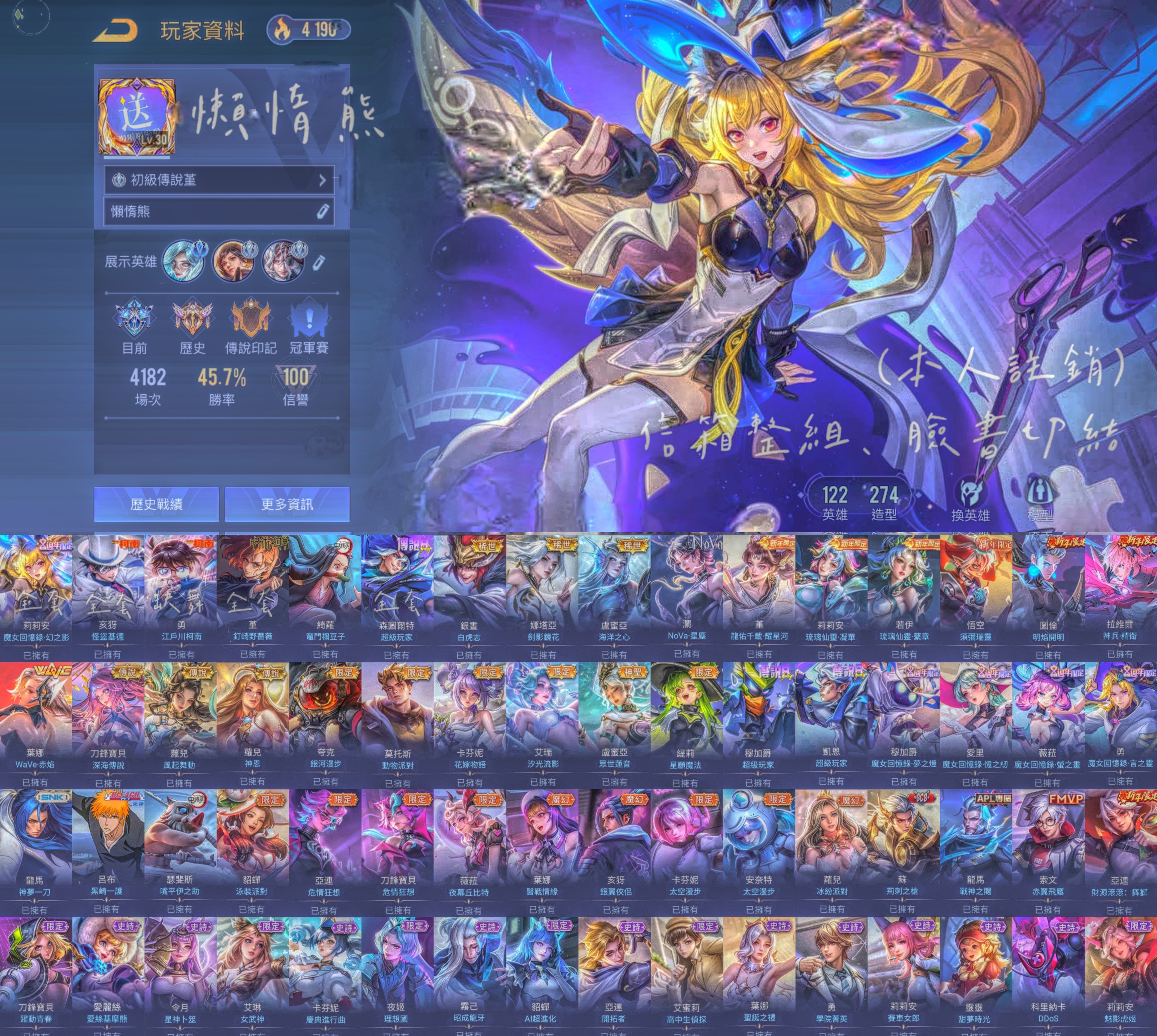 帳號 【G帳手機信箱可改、鑽石、V9、122英、224造】 莉莉安魔女、基德、柯南、釘崎、彌豆子、超級玩家、女團、龍年、須彌、劍影、白虎