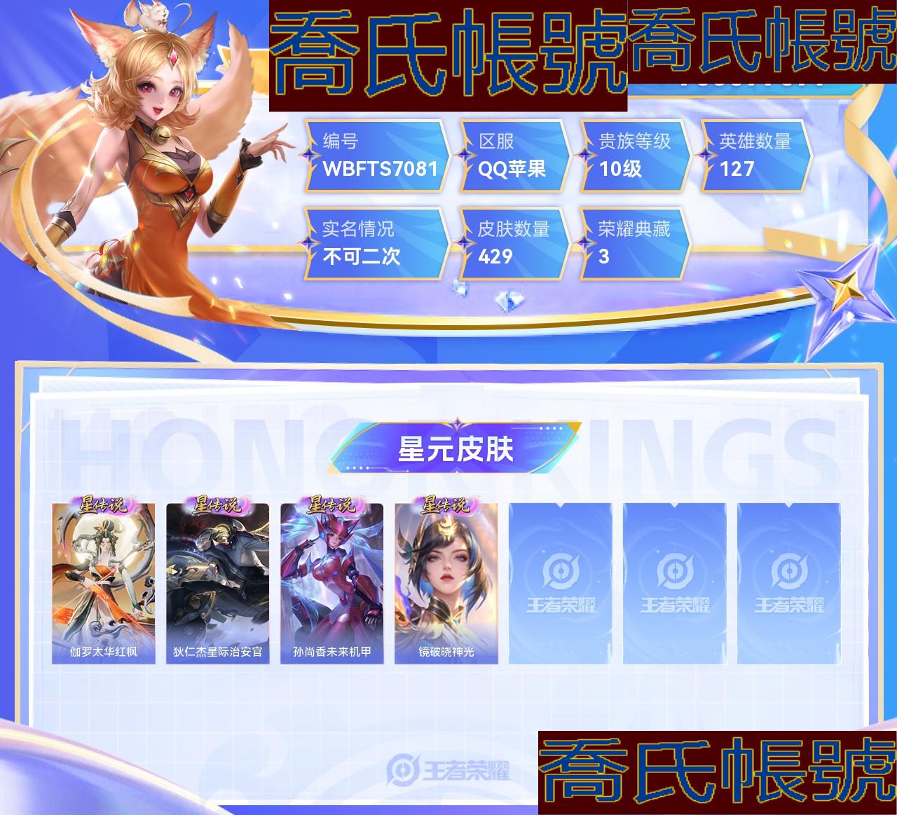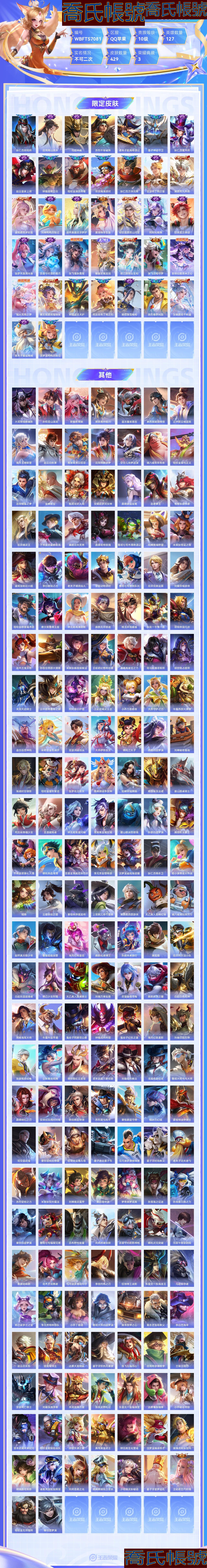 【OBWBFTS708142】 珍品傳說6 無雙3 典藏3 星元4 傳說55 史詩125 限定142 英雄127 皮膚429 稀有英雄10 貴族10級 總場次4871 皮膚價值:381116 【珍品傳說6】 宮本武藏黑崎一護 魯班七號江戶川柯南 馬可波羅怪盜基德 張飛兔猻蓬尾 安琪拉酷洛米之心 瑤大耳狗之夢 【無雙皮膚3】 鎧神罪 小喬時之魔女 曜器靈螭龍劍 【榮耀典藏3】 虞姬神鑑啟示錄 貂蟬幻闕歌 孫尚香殺手不太冷 【星元皮膚4】 伽羅太華紅楓 狄仁傑星際治安官 孫尚香未來機甲 鏡破曉神光 【傳說皮膚55】 楊戩縱目遷山 張良黃金白羊座 大司命死亡執政官 司馬懿九山相柳 鎧絳天戰甲 瀾電玩雷克斯 艾琳覓芳蹤 馬可波羅妄想實況 達摩黃金獅子座 裴擒虎祥瑞亨通 馬超無雙飛將 典韋戰鼓燎原 露娜霜月吟 瀾逐花歸海 桑啟鳴野蒿 莊周牧神詩旅 李信一念神魔 伽羅太華 狄仁傑超時空戰士 孫策乘龍淬吳鉤 趙雲乘龍銘鐘鼎 孫尚香乘龍問璇璣 西施游龍清影 李元芳飛鳶探春 關羽武聖 諸葛亮鶴羽星尊 花木蘭燃星之曲 孫悟空齊天大聖 虞姬啟明星使 孫尚香末日機甲 宮本武藏地獄之眼 曜山海蒼雷引 虞姬雲霓雀翎 呂布怒海麟威 諸葛亮時雨天司 孫策末日機甲 鏡熾陽神光 馬可波羅深海之息 后羿無盡星芒 花木蘭冠軍飛將 趙雲淬星耀世 瀾願照九州拓 虞姬願照歲時盈 夏洛特浮生妄 司空震願照山河定 東皇太一灼幽烈陽 公孫離雲諾千山 后羿黃金射手座 妲己願照眾生和 張飛百相守夢 孫尚香音你閃耀 蔡文姬願照福祿聚 干將莫邪久勝戰神 王昭君乞巧織情 女媧願照千秋盛 【史詩皮膚125】 諸葛亮黃金分割率 干將莫邪冰霜戀舞曲 少司緣巫禮祀神 萊西奧光弋星穹 甄姬遊園驚夢 公孫離塗山容容 黃忠百相守夢 孫尚香薔薇戀人 周瑜百相守夢 朵莉亞幻珠鮫人 雲纓贊萌露比 鍾無豔戍鼓銘心 瀾賞金獵手 瑤遇見神鹿 后羿石田雨龍 牛魔小牛鴨 姬小滿飛車小橘子 白起蒼鱗隱世 嬴政暗夜貴公子 裴擒虎李小龍 呂布聖誕狂歡 廉頗撼地雄心 亞連破空之劍 亞瑟心靈戰警 貂蟬聖誕戀歌 墨子龍騎士 李白謫仙醉月 劉禪紳士熊喵 大喬白蛇 韓信飛衡 伽羅箭羽風息 魯班七號蔬鄉物語 嬴政搖滾巨星 魯班七號電玩小子 張飛亂世虎臣 大喬乘龍憶丹青 娜可露露晚螢 露娜紫霞仙子 不知火舞魅語 曹操夜都魔契 白起星夜王子 項羽蒼穹之光 王昭君偶像歌手 蔡文姬奇蹟聖誕 孫尚香水果甜心 黃忠烈魂 小喬繽紛獨角獸 程咬金功夫廚神 鍾馗樂園奇幻夜 安琪拉乘龍聚寶船 姬小滿妄想食味 夏洛特永晝 呂布末日機甲 公孫離無限星賞官 嫦娥拒霜思 司空震地獄燃心 廉頗地獄巖魂 阿古朵江河有靈 甄姬冰雪圓舞曲 李元芳匿光偵查者 趙懷真鶴歸松棲 百里玄策原初追逐者 戈婭馭風魔法 呂布御風驍將 劉禪電玩爆裂旋風 劉邦德古拉伯爵 扁鵲奇幻香蹤 張飛虎魄 暃星界遊俠 妲己女僕咖啡 后羿輝光之辰 夢奇頑趣 李元芳逐浪之夏 孫策貓狗日記 阿軻節奏熱浪 元歌無心 鍾無豔超時空戰士 安琪拉心靈駭客 鬼谷子五穀豐年 魯班大師匿光啟智者 狂鐵電玩高手 百里守約朱雀志 蘇烈玄武志 鏡匿光追影者 百里守約特工魅影 哪吒雪上飛焰 宮本武藏鬼劍武藏 廉頗寅虎御盾 后羿如夢令 曹操幽靈船長 劉禪天才門將 狄仁傑鷹眼統帥 墨子金屬風暴 莊周高山流水 雅典娜冰冠公主 馬超神威 李白千年之狐 老夫子航海奇遇記 狄仁傑魔術師 孫尚香時之戀人 橘右京修羅 鎧曙光守護者 趙雲皇家上將 蘭陵王暗隱獵獸者 趙雲未來紀元 妲己魅力維加斯 米萊狄完美假期 亞瑟布丁狗之誓 蔡文姬舞動綠茵 劉禪鴨鴨歷險記 趙懷真器靈浮夢爐 楊戩天秀啟明 貂蟬喚靈魅影 阿軻化蝶舞 狂鐵龍之律動 安琪拉時之奇旅 伽羅天狼溯光者 百里守約雪豹霜爪 花木蘭水晶獵龍者 韓信傲雪梅槍 小喬青蛇 阿古朵頑趣 老夫子藏狐褐絨 狄仁傑綺世丹青 夏侯惇乘風破浪 【年限皮膚20】 伽羅太華 韓信飛衡 孫策乘龍淬吳鉤 大喬乘龍憶丹青 趙雲乘龍銘鐘鼎 孫尚香乘龍問璇璣 安琪拉乘龍聚寶船 呂布御風驍將 后羿輝光之辰 曜山海蒼雷引 諸葛亮時雨天司 百里守約朱雀志 蘇烈玄武志 廉頗寅虎御盾 瀾願照九州拓 虞姬願照歲時盈 司空震願照山河定 妲己願照眾生和 蔡文姬願照福祿聚 女媧願照千秋盛 【內測皮膚3】 孫尚香薔薇戀人 姬小滿妄想食味 高漸離玩趣惡龍 【限定皮膚142】 虞姬夏日便利店 楊戩縱目遷山 鎧神罪 干將莫邪冰霜戀舞曲 少司緣巫禮祀神 艾琳鶴鳴心箋 萊西奧光弋星穹 明世隱往憶暉光 甄姬遊園驚夢 亞瑟榮光之誓 哪吒羅小黑戰記 公孫離塗山容容 鬼谷子克喵 大司命死亡執政官 司馬懿九山相柳 項羽蒼威無極 孫尚香薔薇戀人 孫策百相守夢 周瑜百相守夢 朵莉亞幻珠鮫人 甄姬逆浪荇歌 雲纓贊萌露比 宮本武藏黑崎一護 雅典娜單詞大作戰 艾琳覓芳蹤 馬可波羅妄想實況 姬小滿小滿鴨 白起死霸裝 后羿石田雨龍 牛魔小牛鴨 老夫子百相守夢 魯班七號江戶川柯南 馬可波羅怪盜基德 呂布逐霄戰戟 裴擒虎李小龍 桑啟鳴野蒿 廉頗撼地雄心 孫悟空神蹟守衛 亞連破空之劍 沈夢溪龍舞盛年 東皇太一噬滅天穹 李白謫仙醉月 伽羅太華 韓信飛衡 劉邦劍破天穹 魯班七號蔬鄉物語 李元芳蔬鄉物語 孫策乘龍淬吳鉤 大喬乘龍憶丹青 趙雲乘龍銘鐘鼎 孫尚香乘龍問璇璣 曹操夜都魔契 妲己靈卜魔法 蔡文姬奇蹟聖誕 黃忠烈魂 安琪拉乘龍聚寶船 姬小滿妄想食味 鬼谷