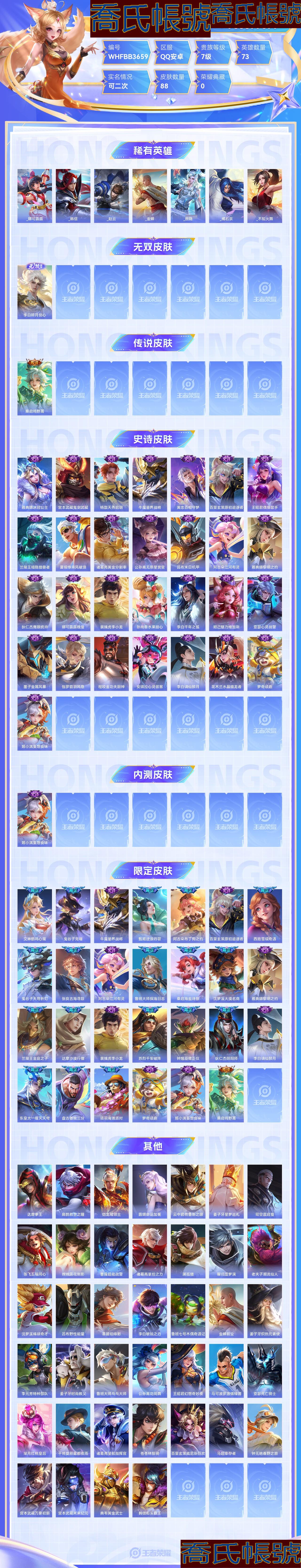 【OBWHFBB365942】 無雙1 傳說1 史詩29 限定27 英雄73 皮膚88 稀有英雄7 大國標1 小國標1 貴族7級 總場次3291 皮膚價值:52448 【大國標1】 大國標李白 【小國標1】 國服馬可波羅 【無雙皮膚1】 李白碎月劍心 【傳說皮膚1】 桑啟鳴野蒿 【史詩皮膚29】 雅典娜冰冠公主 宮本武藏鬼劍武藏 楊戩天秀啟明 牛魔星界戰將 黃忠百相守夢 百里玄策原初追逐者 王昭君偶像歌手 蘭陵王暗隱獵獸者 夏侯惇乘風破浪 諸葛亮黃金分割率 公孫離無限星賞官 呂布末日機甲 阿古朵江河有靈 雅典娜黎明之約 狄仁傑鷹眼統帥 娜可露露晚螢 裴擒虎李小龍 孫尚香水果甜心 李白千年之狐 妲己魅力維加斯 亞瑟心靈戰警 墨子金屬風暴 伽羅箭羽風息 程咬金功夫廚神 安琪拉心靈駭客 李白謫仙醉月 花木蘭水晶獵龍者 夢奇頑趣 姬小滿妄想食味 【內測皮膚1】 姬小滿妄想食味 【限定皮膚27】 艾琳鶴鳴心箋 鬼谷子克喵 牛魔星界戰將 甄姬逆浪荇歌 阿古朵布丁狗之約 百里玄策原初追逐者 西施雪境奇遇 鬼谷子天穹祈燈 張良古海尋蹤 阿古朵江河有靈 魯班大師探海日誌 桑啟海鹽詩旅 沈夢溪大漠名商 雅典娜黎明之約 蘭陵王金庭之子 達摩沙漠行僧 裴擒虎李小龍 蘇烈千軍破陣 鍾馗驅儺正儀 狄仁傑陰陽師 李白謫仙醉月 東皇太一噬滅天穹 盤古敬我三分 項羽海灘派對 夢奇頑趣 姬小滿妄想食味 桑啟鳴野蒿 【其他39】 達摩拳王 扁鵲救世之瞳 鎧龍域領主 露娜命運加冕 雲中君荷魯斯之眼 姜子牙星夢巡禮 司空震啟蟄 張飛五福同心 嫦娥露花倒影 曹操超能戰警 諸葛亮掌控之力 瀾孤獵 曜歸虛夢演 老夫子潮流仙人 沈夢溪棒球奇才 呂布野性能量 暃碧珀緋影 李白敏銳之力 魯班七號木偶奇遇記 金蟬前塵 姜子牙熾熱元素使 李元芳特種部隊 姜子牙時尚教父 魯班大師乓乓大師 公孫離花間舞 王昭君幻想奇妙夜 馬可波羅激情綠茵 亞瑟死亡騎士 羋月紅桃皇后 干將莫邪霧都夜雨 諸葛亮星航指揮官 蒼蒼林狼騎 百里玄策威尼斯狂歡 馬超倖存者 鍾無豔春野之旅 宮本武藏永珍初新 宮本武藏未來紀元 典韋黃金武士 韓信街頭霸王 【稀有英雄7】 _娜可露露 _韓信 _趙雲 _金蟬 _敖隱 _橘右京 _不知火舞【手Q509區】【至尊星耀】【國標擁有情況為賣家自主勾選,詳情以真實驗號為準】1.91w大國標李白一萬五小國馬可有魔方總場次3000+超低場次超高勝率評分