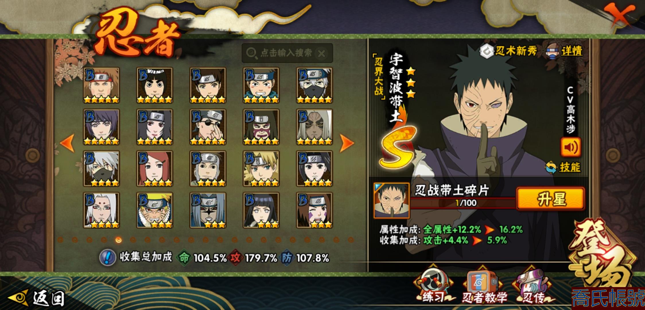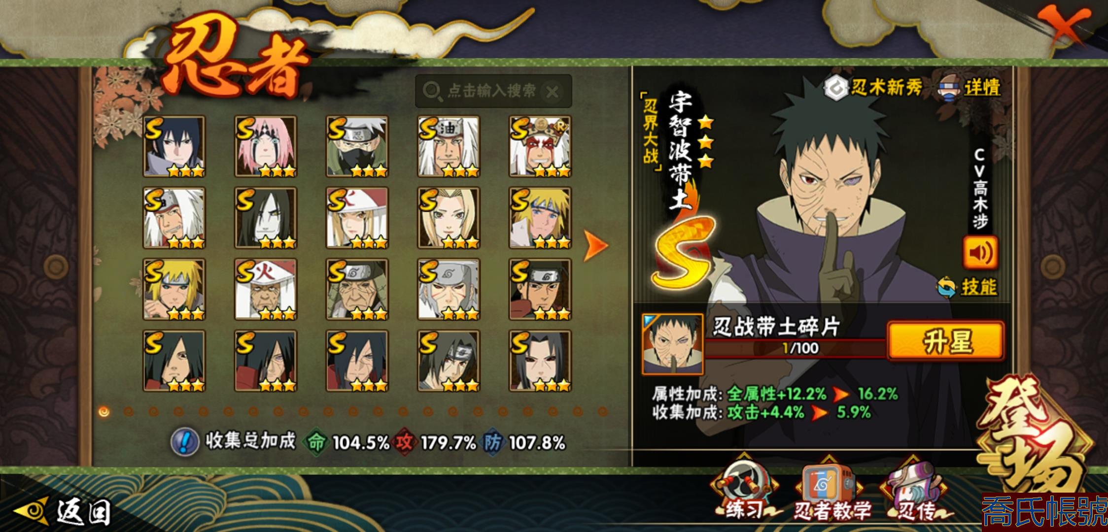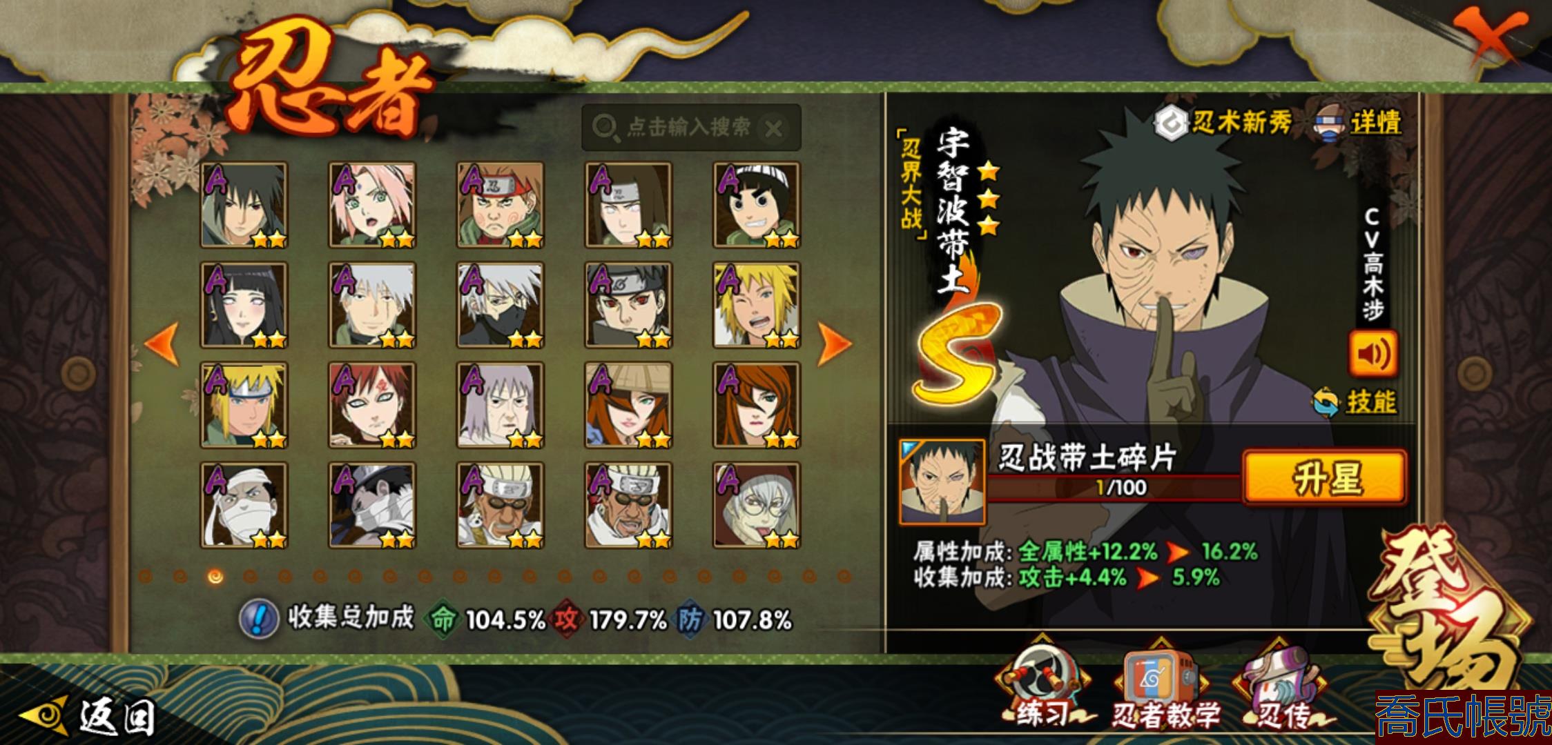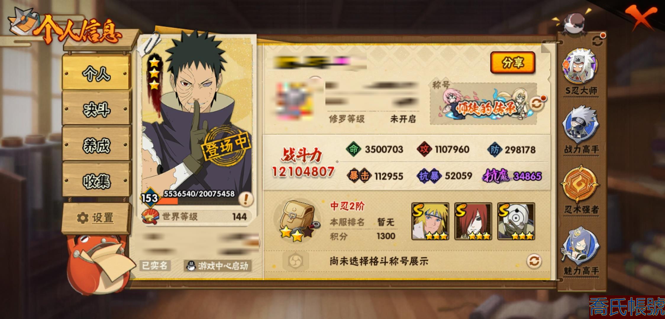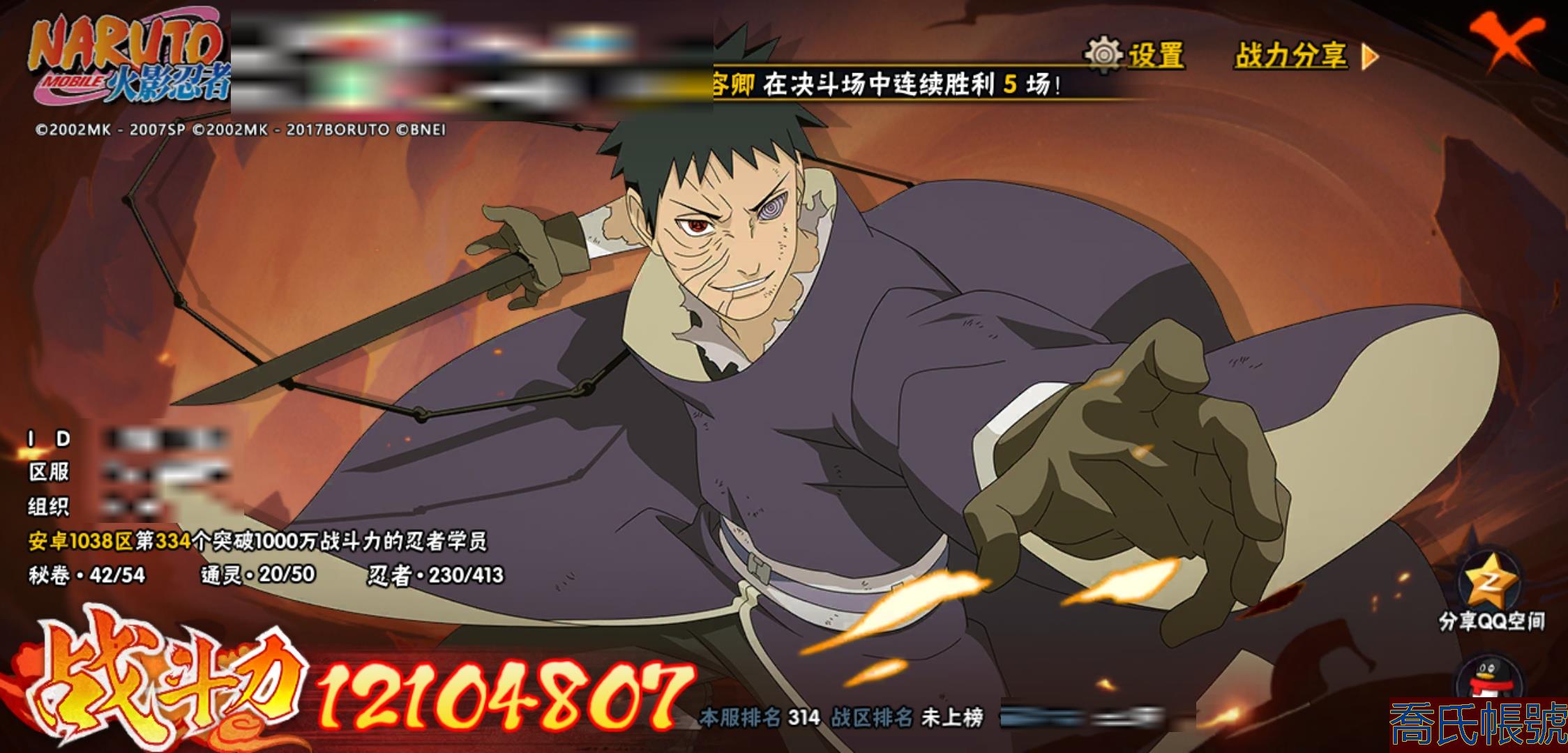 【OBHLLHW829042】戰鬥力:1210W+;段位:中忍2階;本服排名:314;戰區排名:未上榜;VIP11級;S忍29個;A忍47個;通靈獸20個;S忍:永恆萬花筒宇智波佐助,忍界大戰春野櫻,須佐能乎旗木卡卡西,自來也,舞之豪傑自來也,傳說中的三忍自來也,大蛇丸,百豪綱手,綱手,波風水門,穢土轉生波風水門,猿飛日斬,穢土轉生猿飛日斬,穢土轉生千手扉間,千手柱間,宇智波斑,穢土轉生宇智波斑,穢土轉生解宇智波斑,須佐能乎宇智波鼬,穢土轉生宇智波鼬,白面具宇智波斑,忍界大戰宇智波帶土,忍界大戰艾,穢土轉生金角銀角,穢土轉生半藏,二代目土影無,天道佩恩,穢土轉生長門,仙人模式藥師兜;A忍:邁特凱(5星),猿飛阿斯瑪(5星),幹柿鬼鮫(5星),疾風傳我愛羅(4星),飛段(4星),蠍(3星),死司憑血飛段(3星),仙人模式漩渦鳴人,九尾查克拉漩渦鳴人,萬花筒寫輪眼宇智波佐助,須佐能乎宇智波佐助,宇智波泉奈,百豪春野櫻,忍界大戰秋道丁次,忍界大戰日向寧次,忍界大戰李洛克,最終章日向雛田,幻之真容旗木卡卡西,萬花筒寫輪眼旗木卡卡西,宇智波止水,新春限定波風水門,青年波風水門,忍界大戰我愛羅,近松十人衛千代,俠隱江湖照美冥,五代目水影照美冥,漂泊武士桃地再不斬,穢土轉生桃地再不斬,忍界大戰奇拉比,奇拉比,半蛇斗篷藥師兜,不緣,小南,夏日泳裝小南,漂泊浪客小南,曉創生角都,穢土轉生角都,曉大蛇丸,緋流琥蠍,宇智波鼬,新春限定宇智波鼬,迪達拉,穢土轉生迪達拉,猿飛木葉丸,桃式顯現漩渦博人,六代目水影長十郎,四代目土影黑土;通靈獸:忍犬,藍蛇,蛤蟆吉,忍龜,鐮鼬,猿魔,山椒魚,蜃,蛤蟆仙人,鮫鯊,蛤蟆健,烏鴉,蛞蝓,蛤蟆龍,砂之守鶴,蛤蟆廣,熊貓,夢貘,辛牙;時裝:百戰佩恩天道,百戰宇智波鼬須佐能乎,百戰波風水門,蜀面豪傑舞之豪傑自來也,太極靈韻日向花火武當宗師,血霧怪人幹柿鬼鮫,熊貓少女天天峨眉宗師,火之意志綱手百豪,編織虛實宇智波鼬,可愛睡衣漩渦鳴人,緋櫻綻放春野櫻百豪;【1038】