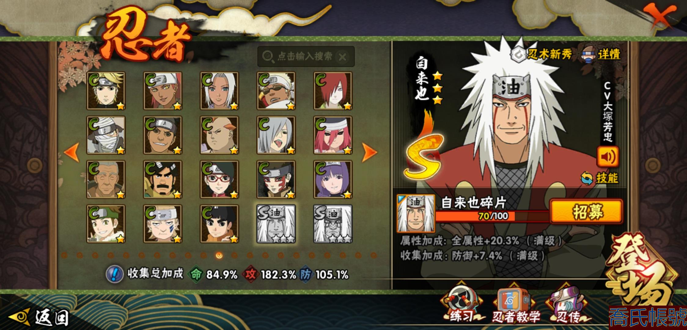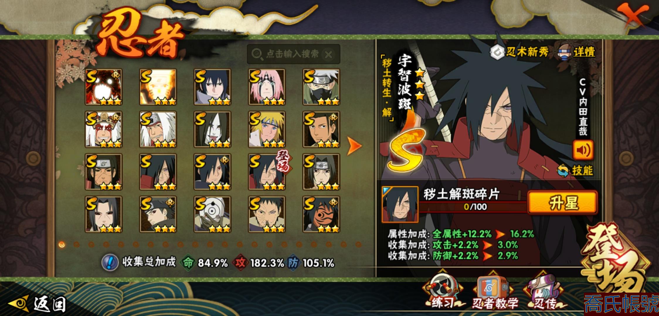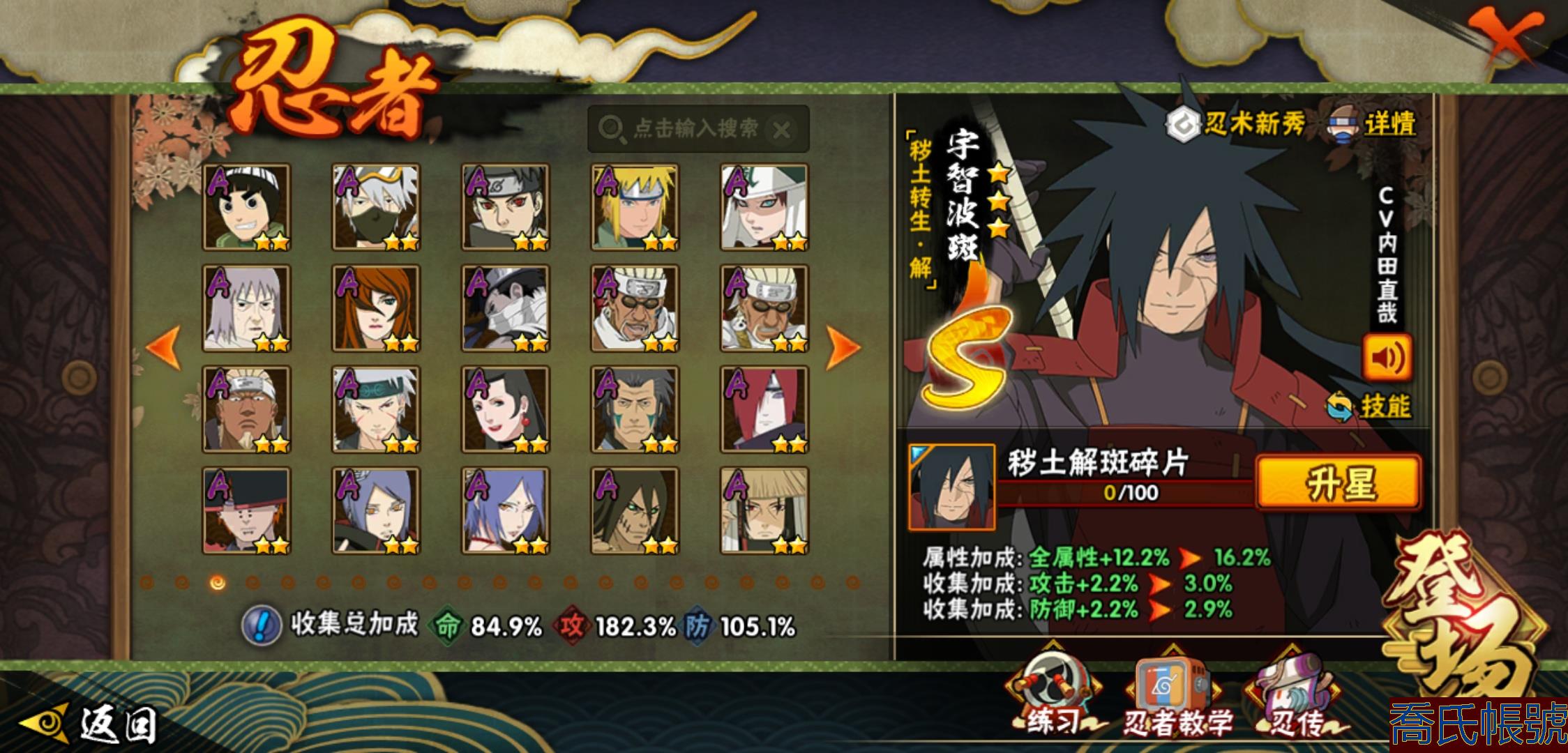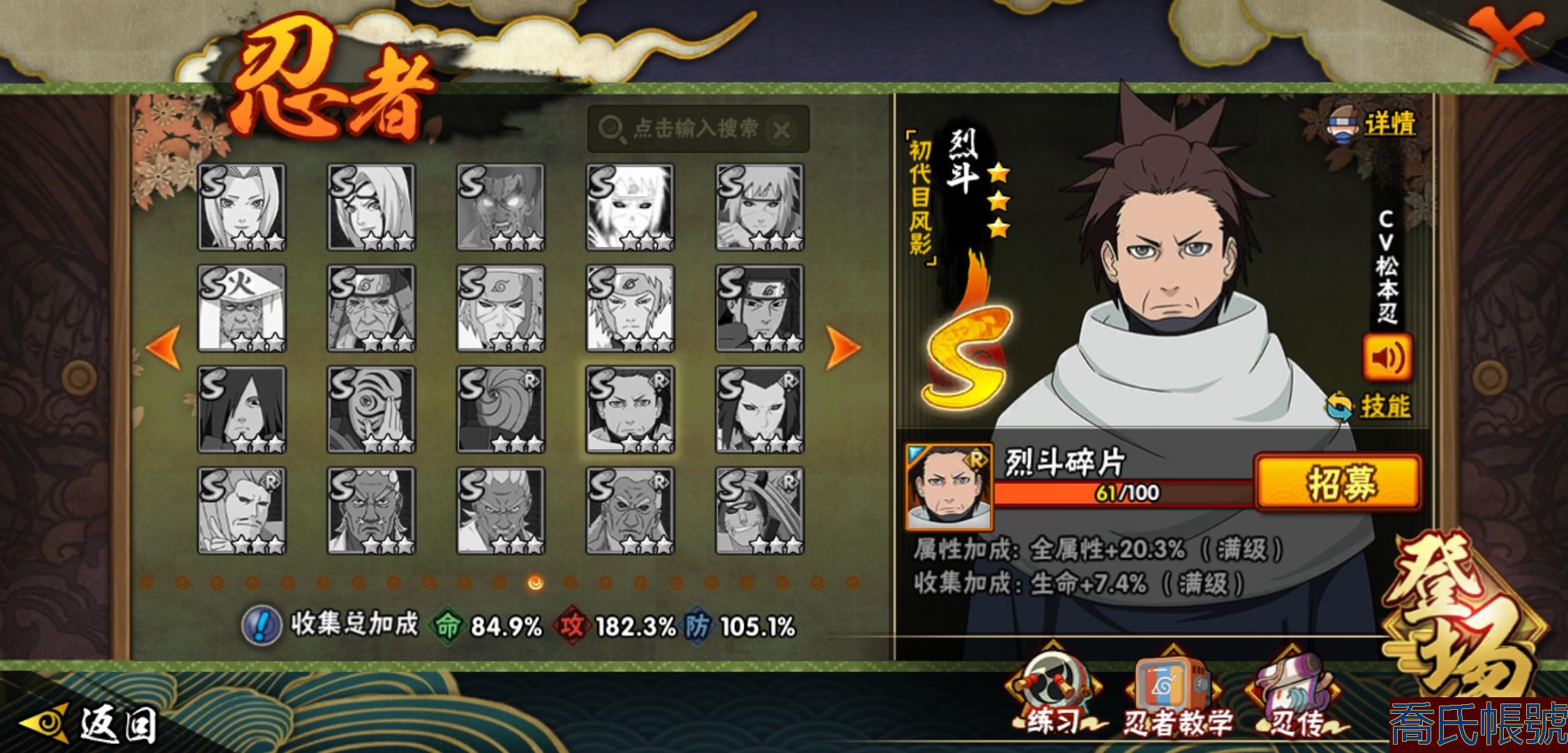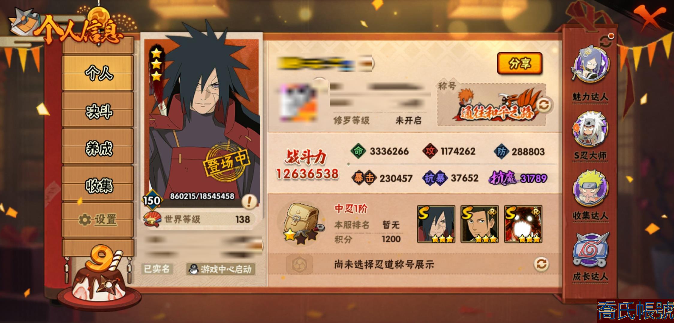 【OBHLLHW998042】戰鬥力:1263W+;段位:中忍1階;本服排名:105;戰區排名:未上榜;VIP11級;S忍28個;A忍42個;通靈獸20個;S忍:暴怒第六尾漩渦鳴人,九喇嘛連結漩渦鳴人,永恆萬花筒宇智波佐助,忍界大戰春野櫻,須佐能乎旗木卡卡西,舞之豪傑自來也,傳說中的三忍自來也,大蛇丸,波風水門,木葉創立千手柱間,穢土轉生千手柱間,穢土轉生宇智波斑,木葉創立宇智波斑,穢土轉生解宇智波斑,須佐能乎宇智波鼬,穢土轉生宇智波鼬,須佐能乎宇智波止水,白面具宇智波斑,忍界大戰宇智波帶土,紅夜之刃神秘面具男,四代目風影羅砂,忍界大戰大野木,天道佩恩,超佩恩天道,仙人模式藥師兜,最終章大筒木舍人,大筒木桃式,大筒木金式;A忍:邁特凱(5星),猿飛阿斯瑪(5星),幹柿鬼鮫(5星),疾風傳我愛羅(4星),蠍(4星),緋流琥蠍(3星),飛段(3星),死司憑血飛段(3星),須佐能乎宇智波佐助,宇智波泉奈,忍界大戰秋道丁次,忍界大戰日向寧次,忍界大戰李洛克,元氣夏日旗木卡卡西,宇智波止水,青年波風水門,忍界大戰我愛羅,近松十人衛千代,五代目水影照美冥,穢土轉生桃地再不斬,奇拉比,忍界大戰奇拉比,青年艾,漂泊武士千手扉間,不緣,不動,青年長門,漂泊浪客佩恩六道,小南,漂泊浪客小南,穢土轉生角都,宇智波鼬,迪達拉,穢土轉生迪達拉,漂泊浪客宇智波帶土,俠隱江湖大野木,火之意志繼承者卑留呼,羈絆神農,五代目雷影達魯伊,六代目水影長十郎,桃式顯現漩渦博人,四代目土影黑土;通靈獸:忍犬,藍蛇,砂之守鶴,蛤蟆吉,忍龜,鐮鼬,猿魔,山椒魚,蜃,蛤蟆仙人,鮫鯊,蛤蟆健,蛞蝓,烏鴉,蛤蟆龍,蛤蟆廣,熊貓,夢貘,鷹;時裝:百戰大蛇丸,百戰佩恩天道,桀驁之刃猿飛阿斯瑪,蜀面豪傑舞之豪傑自來也,百戰波風水門,百戰宇智波鼬須佐能乎,太極靈韻日向花火武當宗師,熊貓少女天天峨眉宗師,烈土霓裳黑土四代目土影,風之守護我愛羅忍界大戰,傳說的光芒波風水門,睿勇新星千手扉間少年,血霧怪人幹柿鬼鮫,緋櫻綻放春野櫻百豪,龍的傳人李洛克截拳宗師,編織虛實宇智波鼬,剎那的藝術迪達拉,夏日衝浪旗木卡卡西元氣夏日;【2474】28s 42a