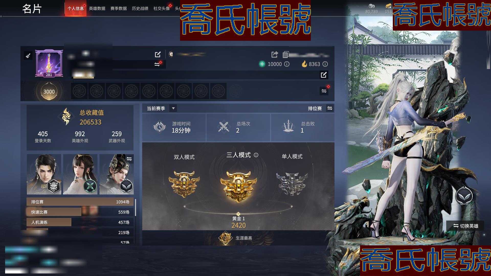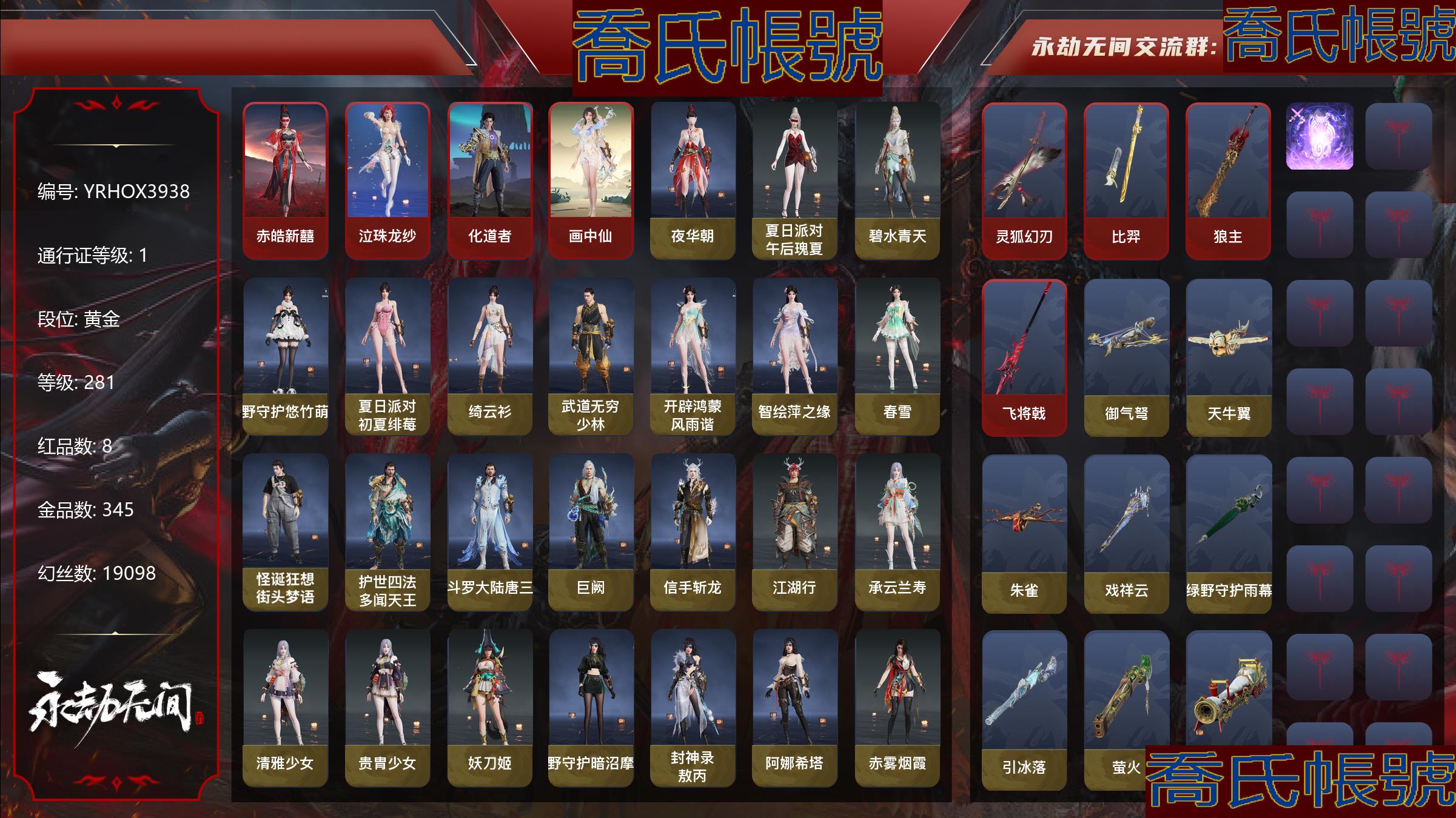【YJYRHOX393811】8紅345金|等級281|黃金|幻絲19098|金磚153|通行證Lv.1 紅色神品:赤皓新囍,泣珠龍紗,化道者,畫中仙,靈狐幻刃,比羿,狼主,飛將戟 角色金色皮膚:夜華朝,夏日派對·午後瑰夏,碧水青天,綠野守護·悠竹萌客,夏日派對·初夏緋莓,綺雲衫,武道無窮·少林,開闢鴻蒙·風雨諧,智繪·萍之緣,春雪,怪誕狂想·街頭夢語,護世四法·多聞天王,鬥羅大陸·唐三,巨闕,信手斬龍,江湖行,承雲蘭壽,清雅少女,貴胄少女,妖刀姬,綠野守護·暗沼摩羅,封神錄·敖丙,阿娜希塔,赤霧煙霞,怒浪,開闢鴻蒙·金戈止,長歌詩韻·戍關將,弘毅袍,龍之影·過江龍,神武,黃庭道,梨園傳奇·柳生,封神錄·申公豹,司天命,朝聞道,祿運玉霄,紫微星命,封神錄·龍吉公主,夏日派對·仲夏霜華,赤丹朱湛,姑射真人,麟鹿大鎧,千秋匠心·玉葉景,龍門·飛天,浣煙紗,福瑞天澤,葫蘆兄弟·蛤蟆頭領,封神錄·哪吒,干將莫邪,封神錄·妲己,日影花陰,黃昏巫主,楚韻九歌·雲中君,夜綢袍,夏日派對·半夏晚風,逆水寒·極夜天曦,封神錄·姜子牙,雲間影,綠野守護·山漠獰影,暖冬茶馨,雪鈴綺歌 髮型金色皮膚:(挑染)泠川發,簪纓發,(挑染)雲霞發,韶光發,綠野守護·嬌憨發,(挑染)暮落髮,伏苓發,鬥羅大陸·海神發,逆水寒·江海發,月丹發,(挑染)櫻舞發,綠野守護·冷傲發,靈兒發,封神錄·紅鸞星發,排霜發,(挑染)鳳姿發,千秋匠心·琳琅發,繾綣發,幽焰發,流螢發,古溪發,封神錄·籠煙芍藥發,秀逸發,(挑染)獅鬃發,逆水寒·極夜發,封神錄·仙風發,(挑染)風吹雪發,(挑染)逐影發,蜜語發 武器金色皮膚:御氣弩,天牛翼,朱雀,戲祥雲,綠野守護·雨幕,引冰落,螢火,雪國禮炮,雷落,鑽山,造景,竹霹靂,丹鶴,凝冰魄,長歌詩韻·夜觀燈,鸚鵡螺,月虹弦角,烏木弓,豹胎易筋弓,轉輪弓,無相印,綠野守護·毛乎乎,熾意炎拳,天狐,2674·超越型,財神劍,琴心,亢龍,隱鋒,監星尺,赤霄,含光承影,黑繩,雷賜,白鹿,燭淚,青石猊,破天,闊刀-陰陽師·赤影妖刀,麒麟牙,劫濤·潮,靈木角,焦鈺,長虹,建木,糖果棍,冰輝,武道無窮·封魔,打狗棒,判官筆,仙舞,華夏神兵·馬首刀,殘霄,青峰疊扇,騰雲歌,耀夜流華,櫻落,逍遙,夔牛槌,月瞳,嘶風,精武,空寒,古墓麗影·登山鎬,蛋仔派對·鹹魚,怨憎,禍忌,新月,破重雲 飾品金色皮膚:真的抱歉,雁落笠,競無間·女,暖冬帽·女,美團·團上頭了,植物大戰殭屍2·腦子給我,粽香遠,綠野守護·絨絨貓,夏日派對·兔兔髮箍,系雲瀾,暖冬帽·男,甲辰龍,福虎帽,陰陽靈狐,冰鏈,安歌帽,雪鹿雌角,開闢鴻蒙·簪金纓,凱旋盔,銀雪,癸卯兔,上侍帽,虎絨耳,葫蘆兄弟·蛤蟆頭,街頭狂歡·制勝之道,晝隱,封神錄·傾城,醉狐銀,夢棠,盜墓筆記·防風帽,鹿鈴角,羽之華,虹貓藍兔七俠傳·寒月 變身器:珥冰,西行劫·神君印 【代幣或期限道具請以實際驗號為準】【Steam】【國服】