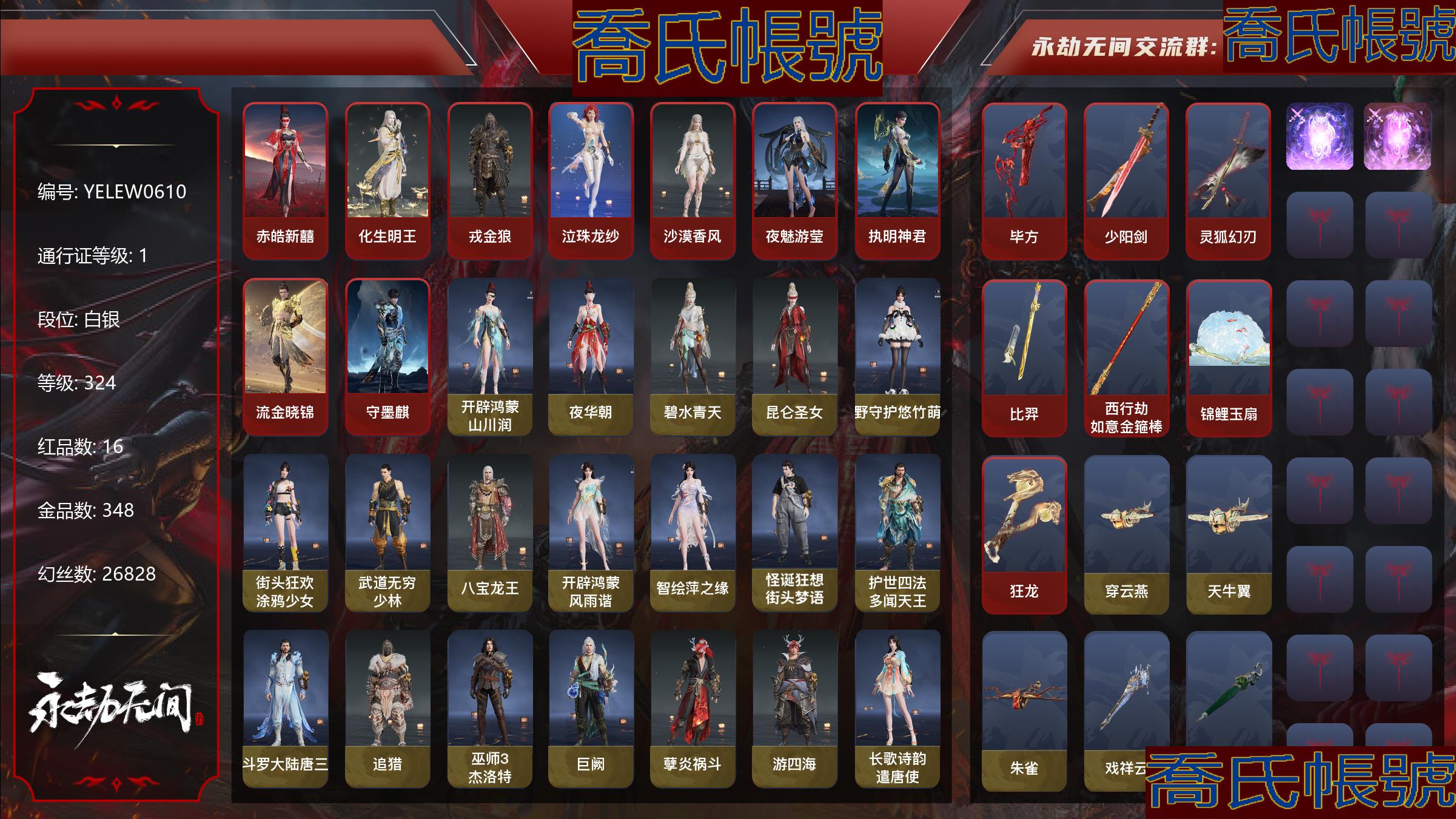 【OBYELEW061042】16紅348金|等級324|白銀|幻絲26828|金磚170|通行證Lv.1 紅色神品:赤皓新囍,化生明王,戎金狼,泣珠龍紗,沙漠香風,夜魅遊瑩,執明神君,流金曉錦,守墨麒,畢方,少陽劍,靈狐幻刃,比羿,西行劫·如意金箍棒,錦鯉玉扇,狂龍 角色金色皮膚:開闢鴻蒙·山川潤,夜華朝,碧水青天,崑崙聖女,綠野守護·悠竹萌客,街頭狂歡·塗鴉少女,武道無窮·少林,八寶龍王,開闢鴻蒙·風雨諧,智繪·萍之緣,怪誕狂想·街頭夢語,護世四法·多聞天王,鬥羅大陸·唐三,追獵,巫師3·傑洛特,巨闕,孽炎禍鬥,遊四海,長歌詩韻·遣唐使,夏日派對·高校水著,貴胄少女,妖刀姬,綠野守護·暗沼摩羅,阿娜希塔,赤霧煙霞,西行劫·楊戩,常勝袍,弘毅袍,龍之影·過江龍,封神錄·申公豹,朝聞道,祿運玉霄,紫微星命,封神錄·龍吉公主,寒煙素,赤丹朱湛,姑射真人,楓狩,麟鹿大鎧,千秋匠心·玉葉景,浣煙紗,瀚海蒼鷹,福瑞天澤,西行劫·悟空,干將莫邪,護世四法·持國天王,封神錄·妲己,夜綢袍,觀山海·文鰩,封神錄·姜子牙,綠野守護·山漠獰影,雪鈴綺歌 髮型金色皮膚:(挑染)泠川發,簪纓發,(挑染)雲霞發,綠野守護·嬌憨發,P5R·NOIR髮型發,鬥羅大陸·海神發,逆水寒·江海發,巫師3·白狼發,月丹發,(挑染)填海發,綠野守護·冷傲發,(挑染)萬仞山發,(挑染)清威發,霜天發,封神錄·紅鸞星發,排霜發,千秋匠心·琳琅發,幽焰發,繾綣發,封神錄·籠煙芍藥發,秀逸發,(挑染)玄冥發,封神錄·仙風發,(挑染)逐影發,蜜語發 武器金色皮膚:穿雲燕,天牛翼,朱雀,戲祥雲,綠野守護·雨幕,引冰落,螢火,雪國禮炮,鑽山,造景,竹霹靂,丹鶴,凝冰魄,赤霞,心魔,月虹弦角,烏木弓,豹胎易筋弓,狻猊吼,腥紅之月,蓮心劍雨,炎魔,詭刃八岐,綠野守護·毛乎乎,天狐,2674·原型,巫師3·湖女之劍,玉霜龍,亢龍,隱鋒,赤霄,壺中日月,含光承影,毅魂守,雷賜,白鹿,燭淚,青石猊,破天,雷王鋸,麒麟牙,劫濤·潮,西行劫·三尖兩刃刀,護雲狩,靈木角,鬥羅大陸·海神三叉戟,焦鈺,長虹,建木,糖果棍,護世四法·降魔,武道無窮·封魔,學宮之杖,判官筆,曼提柯爾之牙,橈尺刀,仙舞,華夏神兵·馬首刀,青峰疊扇,拳皇·舞扇,騰雲歌,耀夜流華,夔牛槌,嘶風,精武,空寒,古墓麗影·登山鎬,怨憎,武道無窮·雙蝶,光影裁決,護世四法·螭龍 飾品金色皮膚:雁落笠,染紅紗,競無間·女,暖冬帽·女,美團·團上頭了,植物大戰殭屍2·腦子給我,粽香遠,西行劫·蛛絲墜,輝晶星辰,綠野守護·絨絨貓,炎流雲禪笠,暖冬帽·男,巫師3·驢耳朵,甲辰龍,狐靈面,冰鏈,毒刺,安歌帽,鮫人角,雪鹿雌角,銀雪,兔尾,虎絨耳,西行劫·緊箍兒,觀山海·冬稜,封神錄·傾城,夢棠,烏金帶,玄天冠,虹貓藍兔七俠傳·虹光,安樂冠,金瑛冠,夜露帽,盜墓筆記·防風帽,鹿鈴角,虹貓藍兔七俠傳·寒月 變身器:珥冰,剪紙·彩刀,西行劫·神君印 【代幣或期限道具請以實際驗號為準】【Steam】【國服】