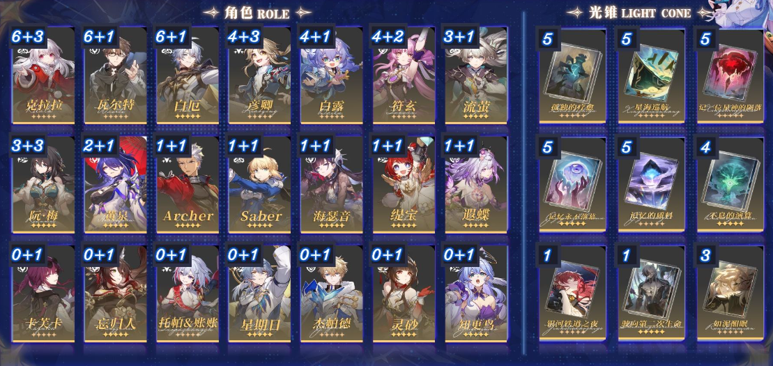 限定:6+3刃 6+1黃泉 6+1花火 6+5希兒 6+1銀狼 2+1龍尊 2+1羅剎 2+1知更鳥 4+1阮梅 2+1靜流 2+1符玄 0+1景元 銀枝 焦叔 星期日
