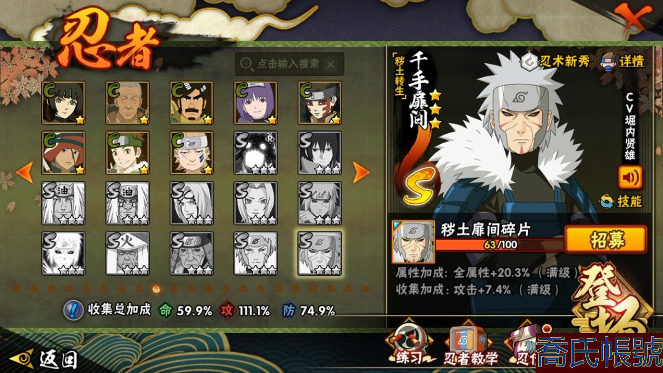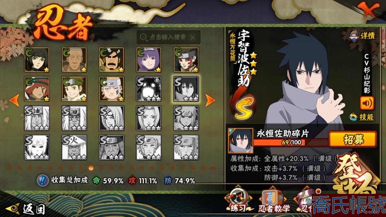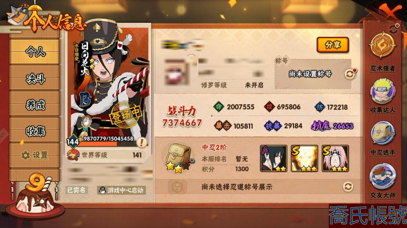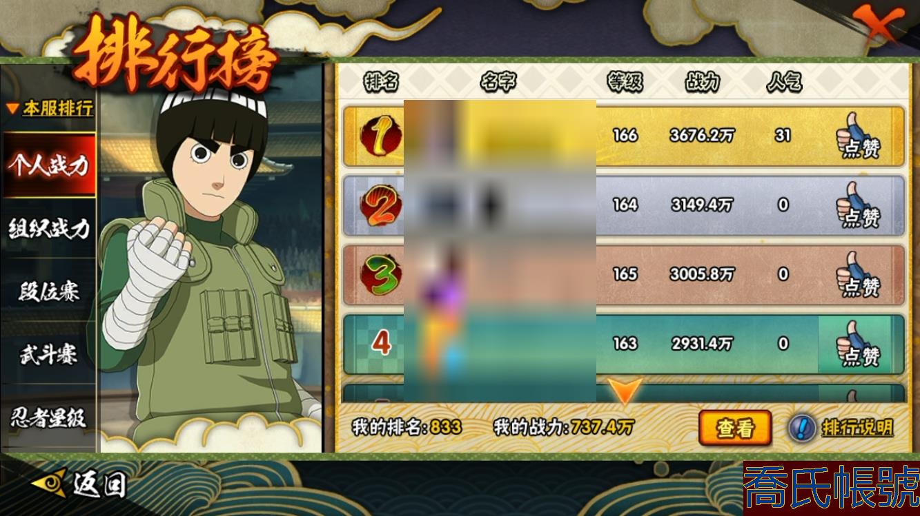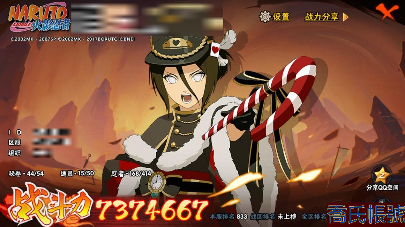 【OBHLLXQ847942】戰鬥力:737W+;段位:中忍2階;本服排名:833;戰區排名:未上榜;VIP12級;S忍18個;A忍31個;通靈獸15個;S忍:大蛇丸,大筒木桃式,白面具宇智波斑,忍界大戰宇智波帶土,死門邁特凱,須佐能乎宇智波止水,忍界大戰春野櫻,天道佩恩,傳說中的三忍自來也,九喇嘛連結漩渦鳴人,穢土轉生解宇智波斑,波風水門,須佐能乎宇智波鼬,木葉創立千手柱間,忍界大戰艾,最終章大筒木舍人,舞之豪傑自來也,須佐能乎旗木卡卡西;A忍:幹柿鬼鮫,猿飛阿斯瑪,疾風傳我愛羅,九尾查克拉漩渦鳴人,須佐能乎宇智波佐助,俠隱江湖宇智波佐助,宇智波泉奈,忍界大戰秋道丁次,忍界大戰日向寧次,忍界大戰李洛克,最終章日向雛田,青年波風水門,漂泊武士桃地再不斬,奇拉比,青年艾,俠隱江湖藥師兜,青年長門,漂泊浪客小南,穢土轉生角都,曉大蛇丸,緋流琥蠍,蠍,新春限定宇智波鼬,飛段,死司憑血飛段,漂泊浪客宇智波帶土,俠隱江湖大野木,羈絆神農,六代目水影長十郎,桃式顯現漩渦博人,四代目土影黑土;通靈獸:忍犬,藍蛇,砂之守鶴,蛤蟆吉,忍龜,鐮鼬,猿魔,山椒魚,蜃,蛤蟆仙人,鮫鯊,蛤蟆健,烏鴉,熊貓,蛤蟆龍;時裝:百戰波風水門,百戰大蛇丸,百戰佩恩天道,百戰宇智波鼬須佐能乎,燼影絕蹤宇智波佐助俠隱江湖,終焉剎寂宇智波帶土漂泊浪客,血霧怪人幹柿鬼鮫,龍的傳人李洛克截拳宗師,烈土霓裳黑土四代目土影,緋櫻綻放春野櫻百豪,傳說的光芒波風水門,命定之戰宇智波佐助疾風傳,熊貓少女天天峨眉宗師;【529】【蘋果QQ】