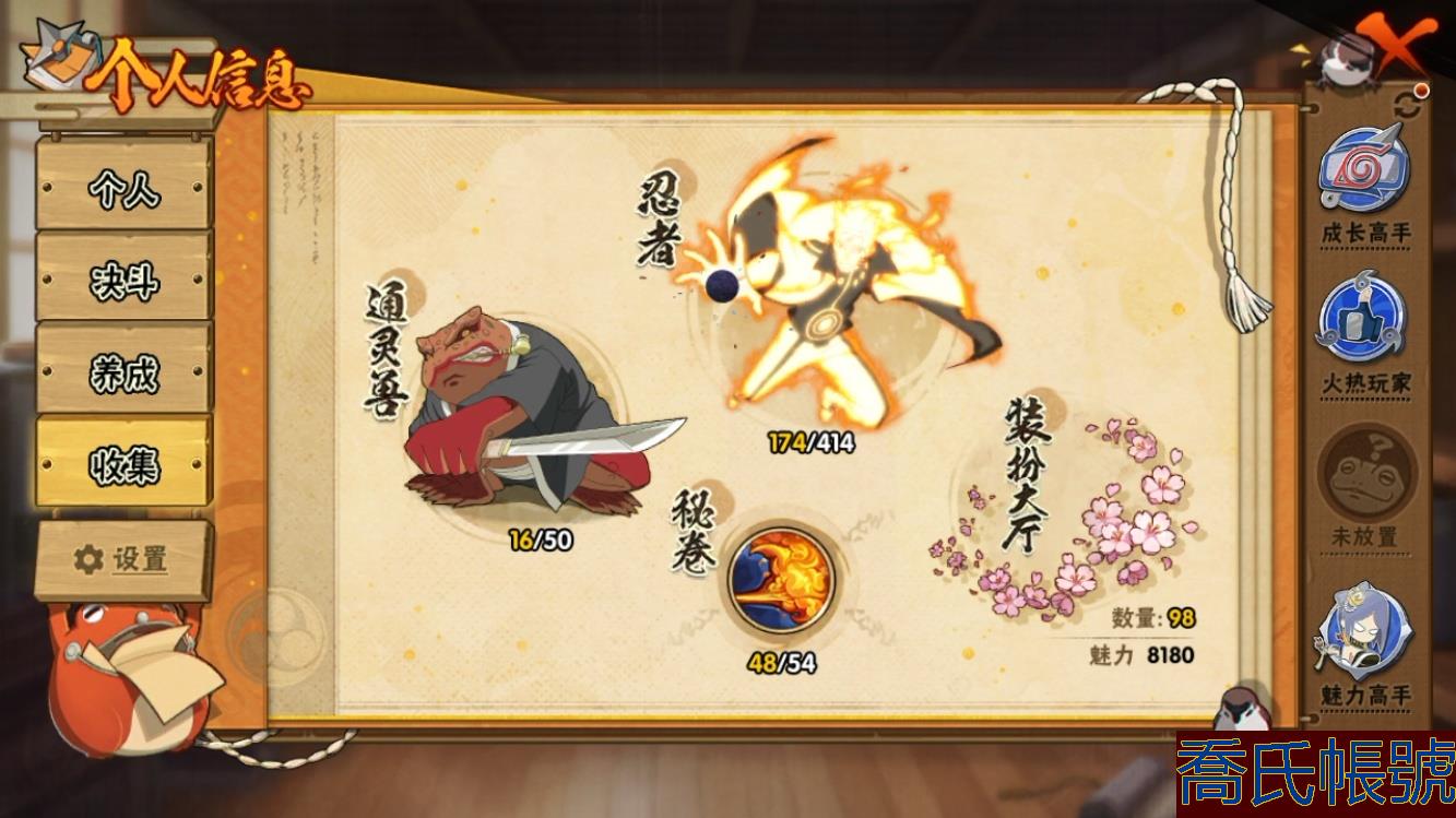 【OBHLLXQ282442】戰鬥力:851W+;段位:見習1階;本服排名:681;戰區排名:未上榜;VIP11級;S忍19個;A忍35個;通靈獸16個;S忍:須佐能乎旗木卡卡西,須佐能乎宇智波止水,白面具宇智波斑,忍界大戰艾,舞之豪傑自來也,傳說中的三忍自來也,須佐能乎宇智波鼬,穢土轉生解宇智波斑,最終章大筒木舍人,永恆萬花筒宇智波佐助,大筒木桃式,穢土轉生長門,木葉創立千手柱間,忍界大戰春野櫻,波風水門,九喇嘛連結漩渦鳴人,暴怒第六尾漩渦鳴人,大筒木金式,天道佩恩;A忍:猿飛阿斯瑪,幹柿鬼鮫,疾風傳我愛羅,蠍,九尾查克拉漩渦鳴人,萬花筒寫輪眼宇智波佐助,宇智波泉奈,忍界大戰秋道丁次,忍界大戰日向寧次,忍界大戰李洛克,幻之真容旗木卡卡西,元氣夏日旗木卡卡西,穢土轉生猿飛阿斯瑪,新春限定波風水門,青年波風水門,忍界大戰勘九郎,近松十人衛千代,五代目水影照美冥,穢土轉生桃地再不斬,青年艾,不緣,不動,青年長門,漂泊浪客佩恩六道,新春限定小南,穢土轉生角都,緋流琥蠍,宇智波鼬,迪達拉,飛段,死司憑血飛段,羈絆神農,六代目水影長十郎,桃式顯現漩渦博人,四代目土影黑土;通靈獸:忍犬,藍蛇,蛤蟆吉,砂之守鶴,忍龜,鐮鼬,猿魔,山椒魚,蜃,蛤蟆仙人,鮫鯊,蛤蟆健,蛞蝓,烏鴉,蛤蟆龍,蛤蟆廣;時裝:百戰宇智波鼬須佐能乎,百戰波風水門,百戰佩恩天道,太極靈韻日向花火武當宗師,龍的傳人李洛克截拳宗師,命定之戰宇智波佐助疾風傳,夏日衝浪旗木卡卡西元氣夏日,血霧怪人幹柿鬼鮫,熊貓少女天天峨眉宗師,烈土霓裳黑土四代目土影,緋櫻綻放春野櫻百豪,傳說的光芒波風水門;【646】【蘋果QQ】27000金幣
