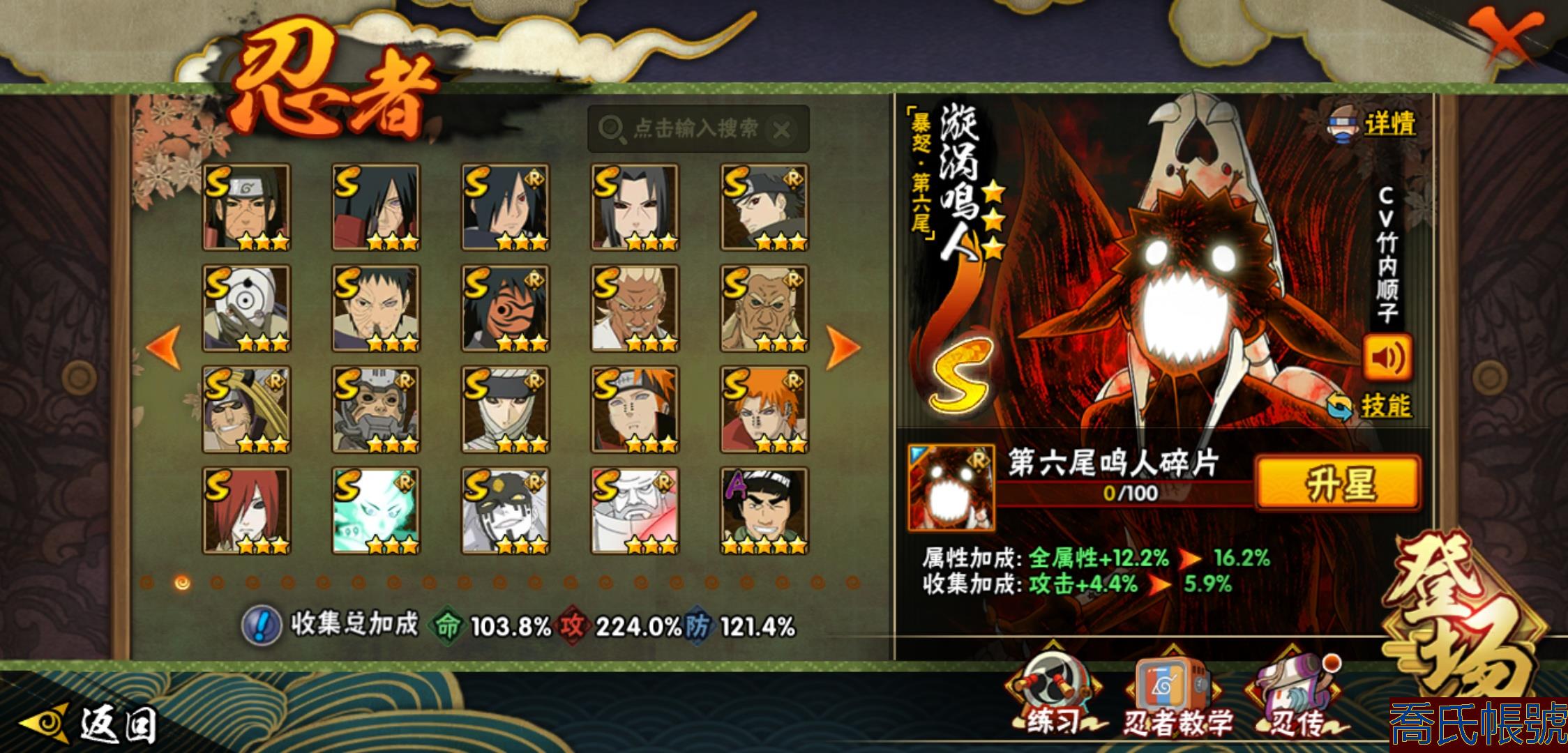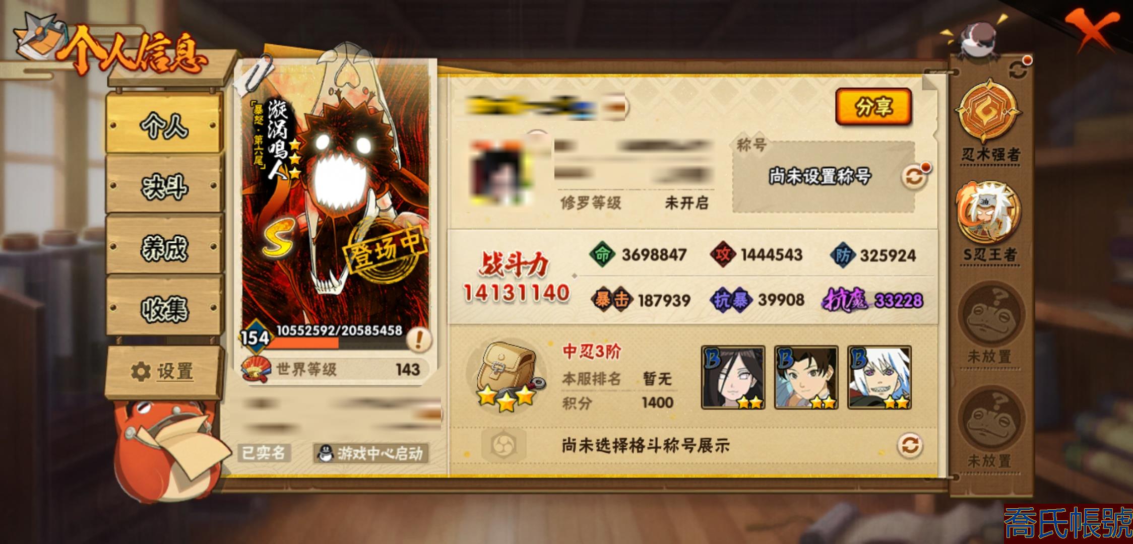 【OBHJPNG075042】戰鬥力:1413W+;段位:中忍3階;本服排名:170;戰區排名:未上榜;VIP13級;S忍39個;A忍48個;通靈獸20個;S忍:須佐能乎宇智波鼬(4星),暴怒第六尾漩渦鳴人,九喇嘛連結漩渦鳴人,永恆萬花筒宇智波佐助,忍界大戰春野櫻,須佐能乎旗木卡卡西,自來也,舞之豪傑自來也,傳說中的三忍自來也,大蛇丸,百豪綱手,綱手,死門邁特凱,波風水門,穢土轉生波風水門,猿飛日斬,穢土轉生猿飛日斬,千手扉間,穢土轉生千手扉間,千手柱間,穢土轉生千手柱間,穢土轉生宇智波斑,木葉創立宇智波斑,穢土轉生宇智波鼬,須佐能乎宇智波止水,白面具宇智波斑,忍界大戰宇智波帶土,紅夜之刃神秘面具男,忍界大戰艾,三代目雷影艾,穢土轉生金角銀角,穢土轉生半藏,二代目土影無,天道佩恩,超佩恩天道,穢土轉生長門,最終章大筒木舍人,大筒木桃式,大筒木金式;A忍:猿飛阿斯瑪(5星),蠍(5星),幹柿鬼鮫(5星),疾風傳我愛羅(4星),飛段(4星),死司憑血飛段(3星),仙人模式漩渦鳴人,九尾查克拉漩渦鳴人,萬花筒寫輪眼宇智波佐助,須佐能乎宇智波佐助,宇智波泉奈,百豪春野櫻,忍界大戰秋道丁次,忍界大戰李洛克,最終章日向雛田,萬花筒寫輪眼旗木卡卡西,宇智波止水,火影繼承人猿飛日斬,新春限定波風水門,青年波風水門,忍界大戰我愛羅,近松十人衛千代,五代目水影照美冥,穢土轉生桃地再不斬,漂泊武士桃地再不斬,奇拉比,忍界大戰奇拉比,青年艾,漂泊武士千手扉間,俠隱江湖藥師兜,半蛇斗篷藥師兜,不緣,小南,穢土轉生角都,曉大蛇丸,緋流琥蠍,宇智波鼬,新春限定宇智波鼬,迪達拉,穢土轉生迪達拉,漂泊浪客宇智波帶土,羈絆神農,猿飛木葉丸,桃式顯現漩渦博人,五代目雷影達魯伊,六代目水影長十郎,四代目土影黑土,夏日限定黑土;通靈獸:忍犬,藍蛇,蛤蟆吉,忍龜,鐮鼬,猿魔,蛞蝓,山椒魚,熊貓,蜃,蛤蟆仙人,鮫鯊,蛤蟆健,烏鴉,,蛤蟆龍,砂之守鶴,蛤蟆廣,夢貘,鷹;時裝:百戰波風水門,百戰宇智波鼬須佐能乎,蜀面豪傑舞之豪傑自來也,百戰佩恩天道,狂野鮫鯊幹柿鬼鮫,百戰大蛇丸,太極靈韻日向花火武當宗師,緋櫻綻放春野櫻百豪,飛瀑流泉長十郎六代目水影,烈土霓裳黑土四代目土影,水之妖姬照美冥五代目水影,剎那的藝術迪達拉,初代目火影千手柱間,編織虛實宇智波鼬,可愛睡衣漩渦鳴人,龍的傳人李洛克截拳宗師,命定之戰宇智波佐助疾風傳,純白之心白;【1235】