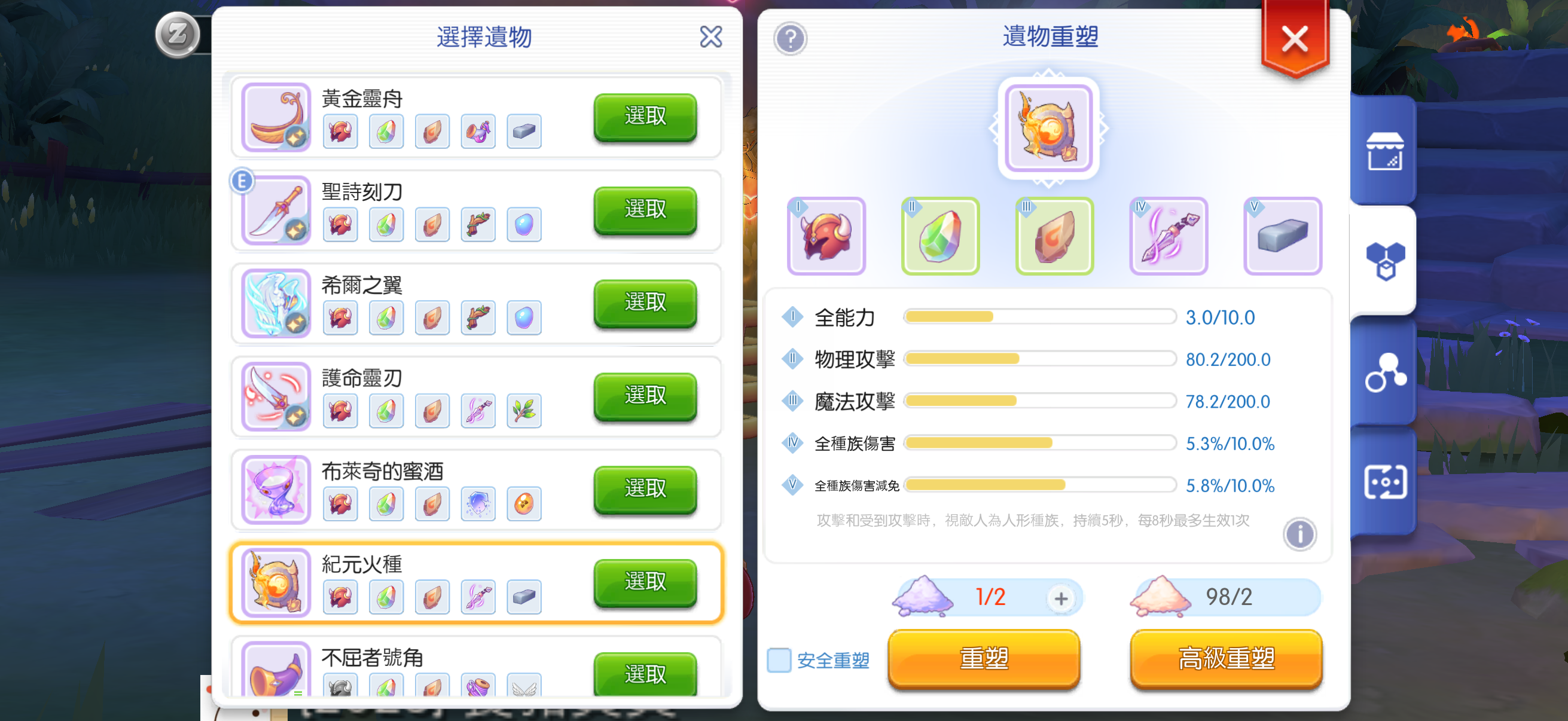 遺物:防轉、生命流失、風抗、命中、紀元火種(需要粉塵洗)