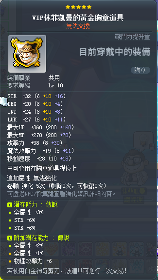 道具 【VIP休菲凱曼的黃金胸章道具】 漂流退谷 %力VIP休菲凱曼的黃金胸章道具均6攻