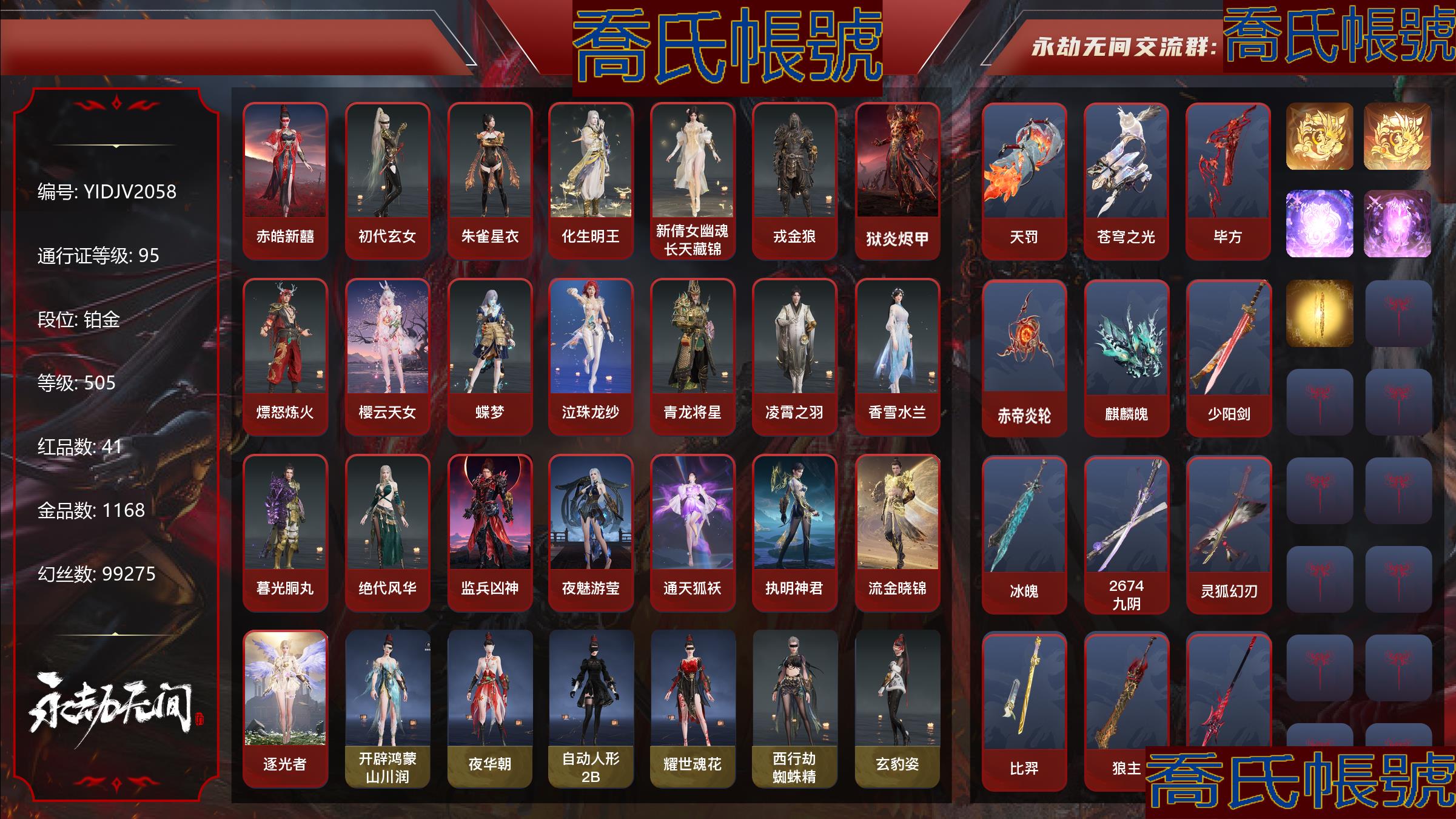 【OBYIDJV205842】41紅1168金|等級505|鉑金|幻絲99275|金磚1562|通行證Lv.95 紅色神品:赤皓新囍,初代玄女,朱雀星衣,化生明王,新倩女幽魂·長天藏錦,戎金狼,獄炎燼甲,熛怒煉火,櫻雲天女,蝶夢,泣珠龍紗,青龍將星,凌霄之羽,香雪水蘭,暮光胴丸,絕代風華,監兵凶神,夜魅遊瑩,通天狐襖,執明神君,流金曉錦,逐光者,天罰,蒼穹之光,畢方,赤帝炎輪,麒麟魄,少陽劍,冰魄,2674·九陰,靈狐幻刃,比羿,狼主,飛將戟,靈犀,西行劫·如意金箍棒,天瓊,逆晦朔,狂龍,鳳求凰,驚百里 角色金色皮膚:開闢鴻蒙·山川潤,夜華朝,自動人形·2B,耀世魂花,西行劫·蜘蛛精,玄豹姿,夏日派對·午後瑰夏,梨園傳奇·素貞,紫金玉女,紅川仙子,龍之道·自知,霜天紅葉,碧水青天,九陰聖女,P5R·奧村春NOIR,云溪仙子,綠野守護·悠竹萌客,夏日派對·初夏緋莓,楚韻九歌·山鬼,鬥羅大陸·唐舞桐,街頭狂歡·塗鴉少女,武道無窮·詠春,綺雲衫,觀山海·腓腓,西行劫·紫衣仙子,2674·千機喵,絮雲衣,絕倫袍,武道無窮·少林,西行劫·悟淨,若水尊者,梨園傳奇·法海,龍之影·生死局,八寶龍王,甜夜安眠·鵝黃紗夢,開闢鴻蒙·風雨諧,白族·雲雪染,夏日派對·長夏清瀾,鑄神·天祿瑞光,智繪·萍之緣,觀山海·春神句芒,蘭庭月,沐昭,春雪,新倩女幽魂·瑤光沐月,新倩女幽魂·花間影,新倩女幽魂·流紈裙,怪誕狂想·紅藍狂想,怪誕狂想·路奇迷蹤,護世四法·多聞天王,鬥羅大陸·唐三,銀狼裘,噬月天狼,龍之影·龍虎鬥,沙狼之怒,追獵,長歌詩韻·鷓鴣天,巨闕,逆水寒·染煙,觀山海·夏神祝融,2674·街頭烈火,龍心熾焰,庖丁·食神,夏日派對·椰風夕照,瑞火麟,龍之影·精武魂,遊四海,道詭異仙·李歲,洛天依·星空投影,P5R·芳澤霞VIOLET,巔峰極速·小可,三麗鷗家族·凱蒂貓,怦然心動·軟暖甜夢,拳皇·雅典娜,青燈,鬥羅大陸·小舞,長歌詩韻·遣唐使,新魔傑·辟邪帝姬,春日序曲·晨風,夏日派對·高校水著,山吹茶,輝燁少女,承雲蘭壽,春桃笑,龍之道·至純,天鈿女命,御宅羅夢,御宅花織,陰陽姬,清雅少女,貴胄少女,狩獵都市·暗夜利刃,決戰平安京·戀念私語,千秋匠心·青枝瓷,陰陽師·灼舞桃節,決戰平安京·朔夜遊方,決戰平安京·熱海白珊,陰陽師·櫻雨刀舞,決戰平安京·御神之刃,妖刀姬,庖丁·餚嬋,巫師3·葉奈法,綠野守護·暗沼摩羅,封神錄·敖丙,阿娜希塔,楚韻九歌·湘夫人,逆水寒·鳶紗,觀山海·文鰩,巨鯨客,探海裙,赤霧煙霞,夏日派對·弄潮逐浪,蟄龍吟,伏波龍女,龍之道·無拘,怒浪,倒反陰陽·鐵面,開闢鴻蒙·金戈止,長歌詩韻·戍關將,複製體·尼爾,新魔傑·斬魔天將,西行劫·楊戩,百戰·破荊者,弘毅袍,華夏寶甲·漢光,龍之影·過江龍,P5R·雨宮蓮JOKER,封神錄·申公豹,司天命,自動人形·9S,幽篁山鬼,靈鹿巫者,朝聞道,未濟袍,若谷,春日序曲·寒芷,祿運玉霄,紫微星命,封神錄·龍吉公主,寒煙素,自動人形·A2,富春山居·遠山影,西行劫·玄霜仙兔,西行劫·玉兔精,藏雨閣主,畲族·鳳凰裝,2674·霜凝雪,金襦玉衫,夏日派對·仲夏霜華,梨園傳奇·小青,赤丹朱湛,寒英素雪,姑射真人,玄青鬱離,禍津素盞,麟鹿大鎧,花之傾奇,蒼雷丸,拳皇·不知火舞,古墓麗影·勞拉,千秋匠心·玉葉景,長歌詩韻·胡旋女,觀山海·青鳥,西行劫·白骨夫人,夜吻,神鷹之女,夏日派對·昭夏流金,火羅聖女,龍門·飛天,驚雲羽,浣煙紗,龍之道·求真,花無痕,蜃樓魅影,璨銀魔梟,瀚海蒼鷹,福瑞天澤,葫蘆兄弟·蛤蟆頭領,街頭狂歡·不敗擂主,觀山海·秋神蓐收,西行劫·悟空,行空裘,斑斕衣,狩獵都市·黯縛巫偶,冬無歸,P5R·高卷杏PANTHER,春日序曲·夜汐,怦然心動·音律織光,羽影,封神錄·哪吒,夏日派對·盛夏白陽,代號·絲蓴,干將莫邪,護世四法·持國天王,武道無窮·八極,百戰·斷鏈,觀山海·冬神玄冥,無常白袍,道詭異仙·白靈淼,赤陽天狐,墨行衣,夏日派對·赤夏悠漾,封神錄·妲己,春日序曲·赤羽,護世四法·廣目天王,日影花陰,武道無窮·形意,黃昏巫主,複製體·凱妮,玄綬羅衣,楚韻九歌·雲中君,天工奧妙,夜綢袍,長歌詩韻·念奴嬌,怦然心動·熱力節拍,巫師3·希裡,百戰·執金,夏日派對·半夏晚風,代號·玉膾,湛盧,逆水寒·極夜天曦,虹貓藍兔七俠傳·虹貓,金財聚輝,封神錄·姜子牙,雲間影,赤焰戰靈,綠野守護·山漠獰影,夏日派對·極光夏夜,天虹詠,開闢鴻蒙·日月明,雪鈴綺歌,巫師3·特莉絲,啟明之輝,龍之道·靈心,虹貓藍兔七俠傳·藍兔,長歌詩韻·如夢令,彩雲衣,狩獵都市·雷行獵手,驚世袍 髮型金色皮膚:(挑染)泠川發,縹緲發,月白髮,紅綃發,簪纓發,西行劫·蛛緣發,(挑染)雲霞發,觀山海·哀汛天發,百靈發,天南發,觀山海·忘憂發,街頭狂歡·撞色藝術發,楚韻九歌·爛漫發,韶光發,綠野守護·嬌憨發,(挑染)千絲發,(挑染)鬥羅大陸·龍蝶發,景雲發,P5R·NOIR髮型發,緣覺發,(挑染)自在發,子菀發,(挑染)暮落髮,蘇木發,紫芙發,鑄神·降香發,伏苓發,甜夜安眠·暖絨發,蒼狼宗主發,鬥羅大陸·海神發,逆水寒·江海發,逆水寒·染髮,烈火發,庖丁·炮煉發,巫師3·白狼發,(挑染)水仙發,(挑染)櫻舞發,月丹發,鬥羅大陸·雀變發,月下香發,長歌詩韻·星橋發,木棉發,怦然心動·戀歌發,洛天依·洛紀元發,P5R·VIOLET髮型發,道詭異仙·太歲發,碎浪發,弄潮發,激浪發,安瀾發,鯨海發,觀山海·夜遊發,逆水寒·鳶發,綠野守護·冷傲發,楚韻九歌·潺湲發,皰丁·沸涓發,巫師3·術士發,(挑染)覓封侯發,(挑染)萬仞山發,倒反陰陽·銘誓發,立靖仇驗發,(挑染)清威發,逍遙發,