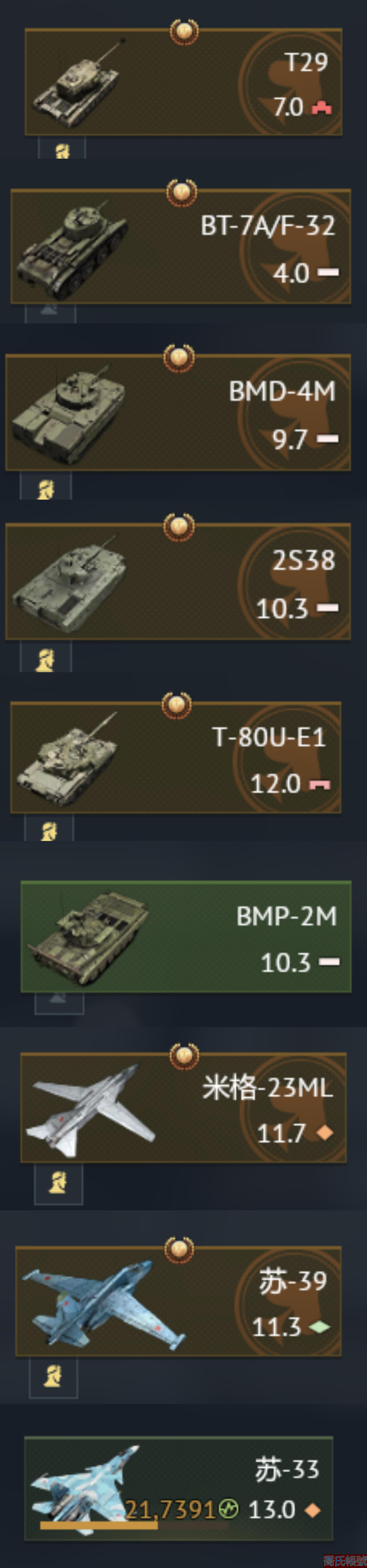 【OBZOFEZ832042】按載具:t80ue1,米格23ml,2s38,哈立德| 阜南號,t80ue1,2s38,bmd4m,su39,mig23ml,紫色雷霆,英國哈立德,t29,bt7a,蘇系開到了90m,沒賣出去之前我在慢慢開t80bvm