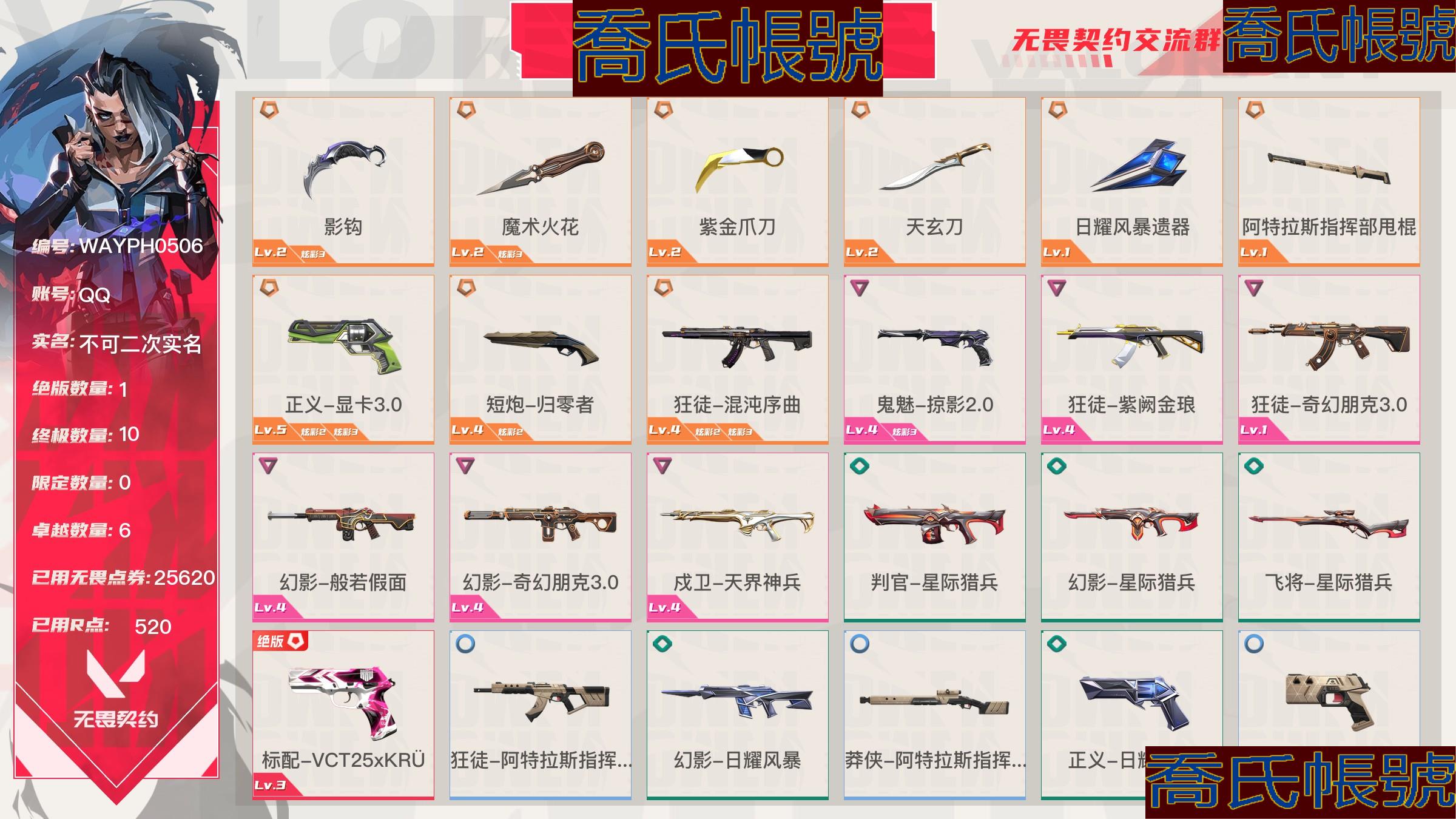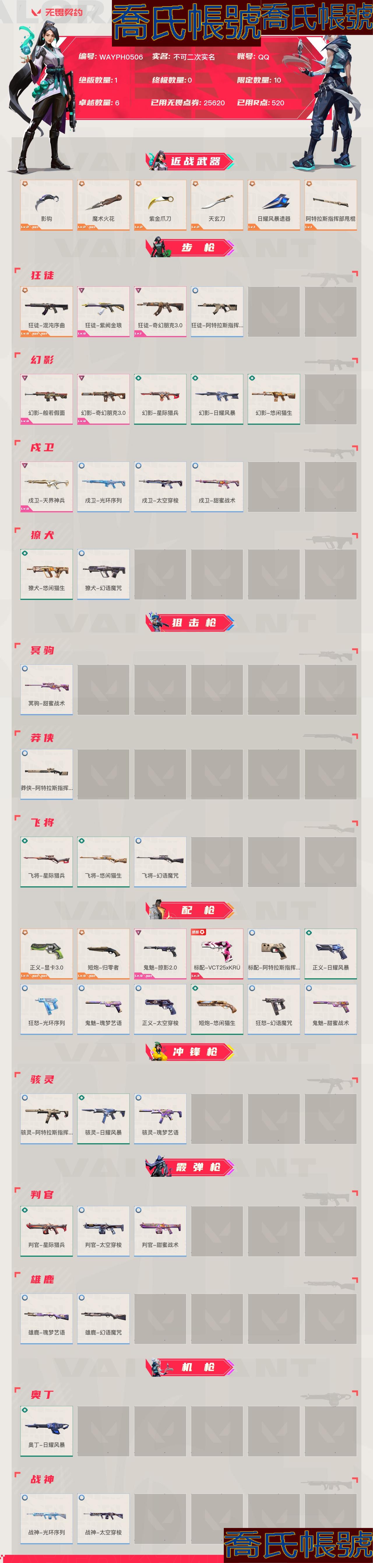 【OBWAYPH050642】Lv66|鑽石III, 刀皮數量6,槍皮數量43(絕版1限定10終極0卓越6);皮膚資產價值25620,已用R點520;【刀皮】:近戰武器-影鉤,近戰武器-魔術火花,近戰武器-紫金爪刀,近戰武器-天玄刀,近戰武器-日耀風暴遺器,近戰武器-阿特拉斯指揮部甩棍; 【槍皮】:正義-顯示卡3.0,短炮-歸零者,狂徒-混沌序曲,鬼魅-掠影2.0,狂徒-紫闕金琅,狂徒-奇幻朋克3.0,幻影-般若假面,幻影-奇幻朋克3.0,戍衛-天界神兵,判官-星際獵兵,幻影-星際獵兵,飛將-星際獵兵,標配-VCT25xKRÜ,狂徒-阿特拉斯指揮部,幻影-日耀風暴,莽俠-阿特拉斯指揮部,正義-日耀風暴,標配-阿特拉斯指揮部,駭靈-阿特拉斯指揮部,駭靈-日耀風暴,奧丁-日耀風暴,幻影-悠閒貓生,戍衛-光環序列,戍衛-太空穿梭,戍衛-甜蜜戰術,獠犬-悠閒貓生,獠犬-幻語魔咒,冥駒-甜蜜戰術,飛將-悠閒貓生,飛將-幻語魔咒,正義-太空穿梭,鬼魅-瑰夢藝語,鬼魅-甜蜜戰術,短炮-悠閒貓生,狂怒-光環序列,狂怒-幻語魔咒,駭靈-瑰夢藝語,判官-太空穿梭,判官-甜蜜戰術,雄鹿-瑰夢藝語,雄鹿-幻語魔咒,戰神-光環序列,戰神-太空穿梭;【熱門卡面】:VCT25xKRÜ卡面,雙城之戰金克絲卡面;【熱門掛飾】:VCTxKRÜ掛飾,魚骨頭掛飾,薰衣草之心掛飾,子彈掛飾;【熱門噴漆】:VCTxKRÜ噴漆,捷風跳PEEK噴漆;【皮膚可能含有某些特權皮膚,具體以遊戲內實際擁有為準】【英雄】:幻稜,煉獄,維斯,暮蝶,壹決,捷風,不死鳥,賢者,獵梟,芮娜,奇樂,尚勃勒,K/O,蓋可 【近戰 武器】:近戰武器-魔術火花,近戰武器-影鉤,近戰武器-紫金爪刀,近戰武器-天玄刀,近戰武器-日耀風暴 遺器,近戰武器-阿特拉斯指揮部 甩棍,近戰武器-魔術火花 【狂徒】:狂徒-混沌序曲,狂徒-紫闕金琅,狂徒-奇幻朋克//3.0 【幻影】:幻影-般若假面,幻影-奇幻朋克//3.0 【戍衛】