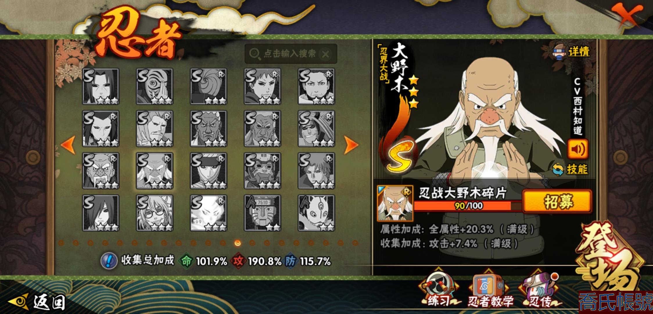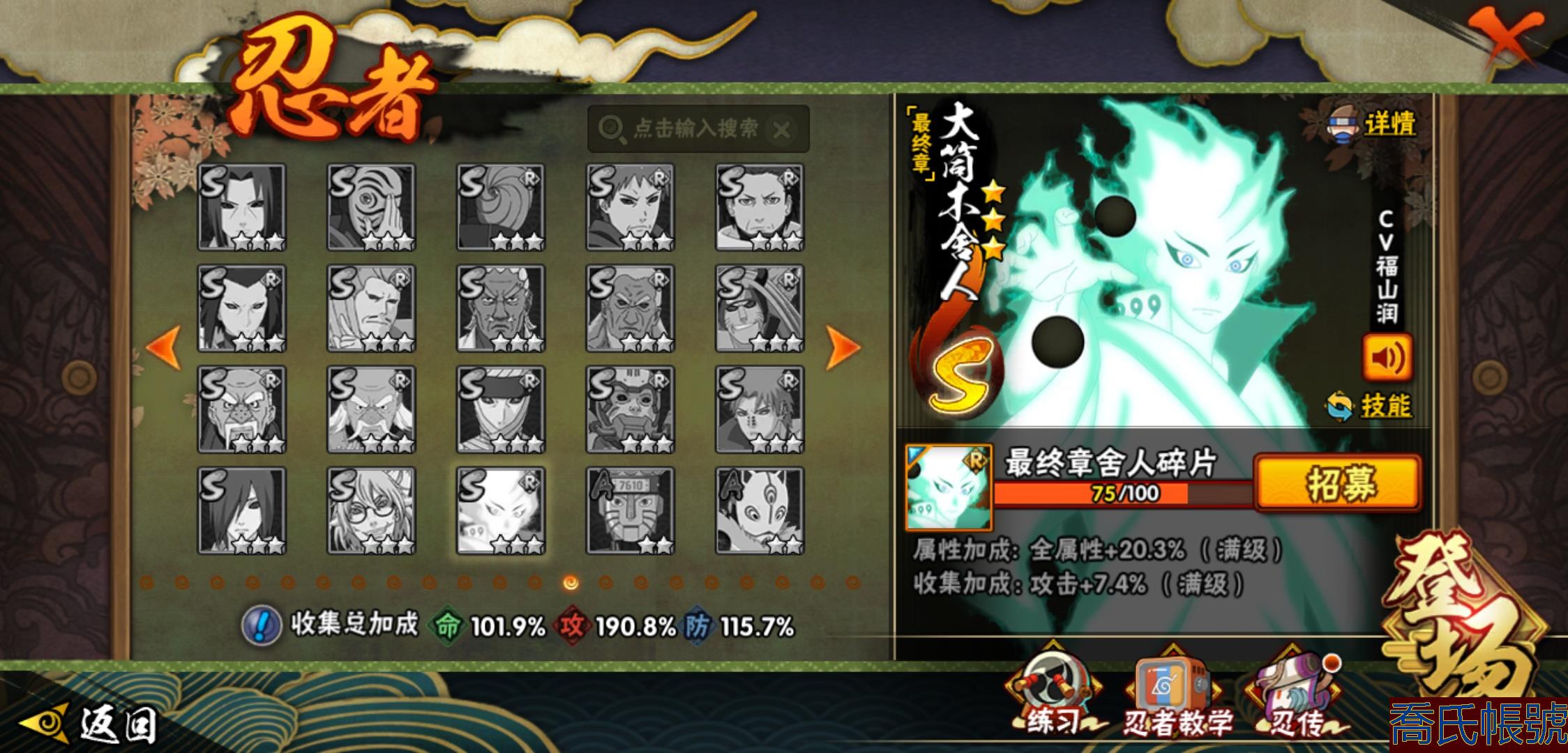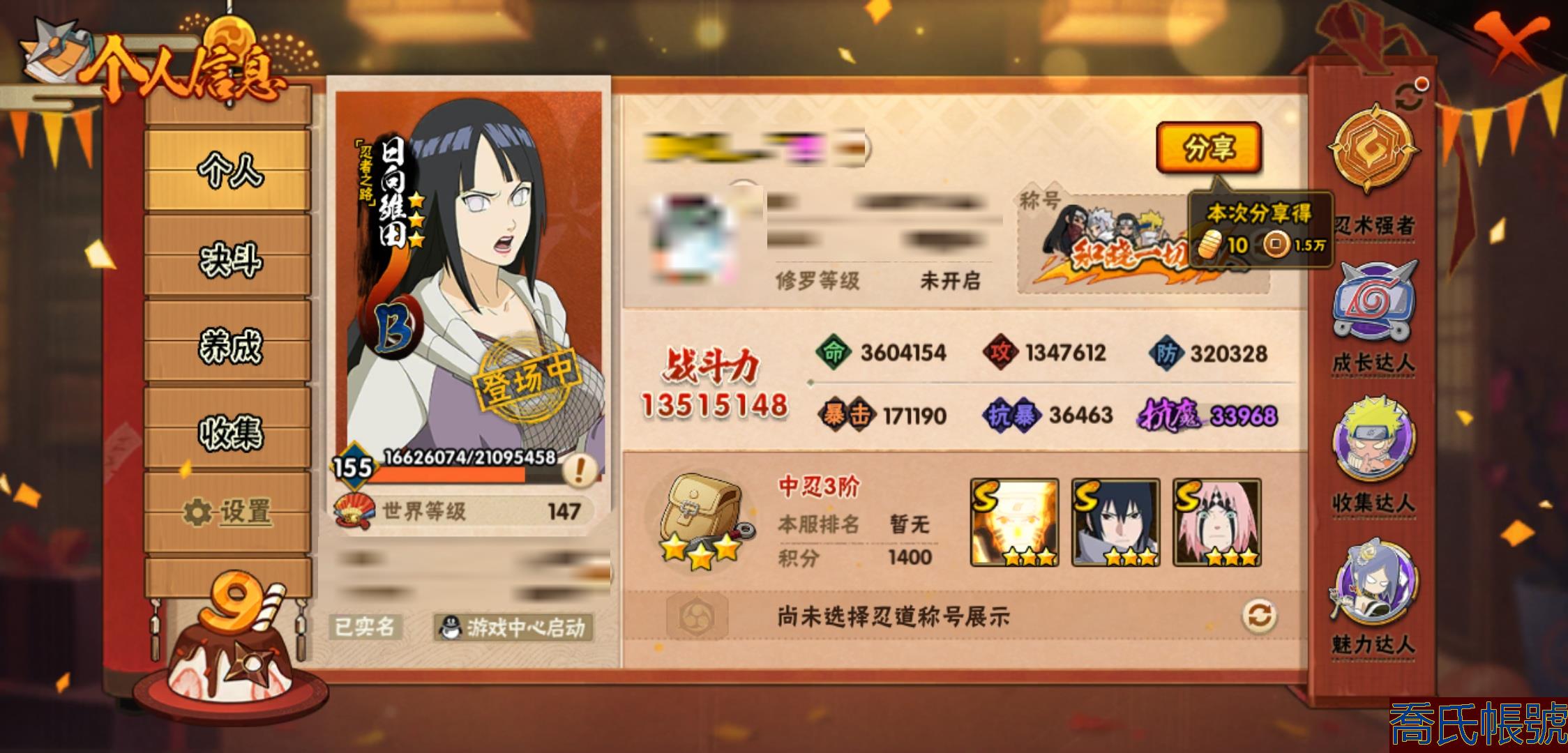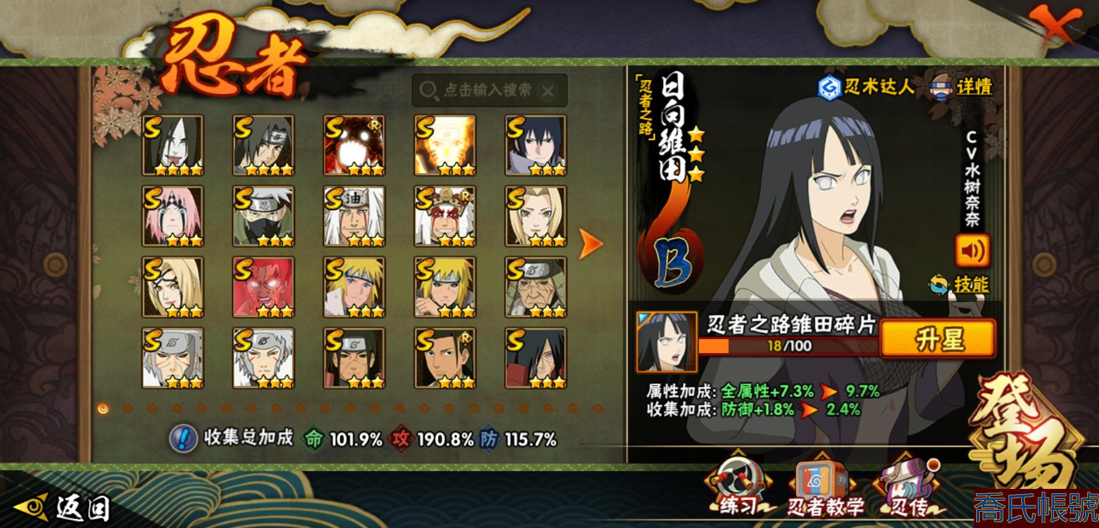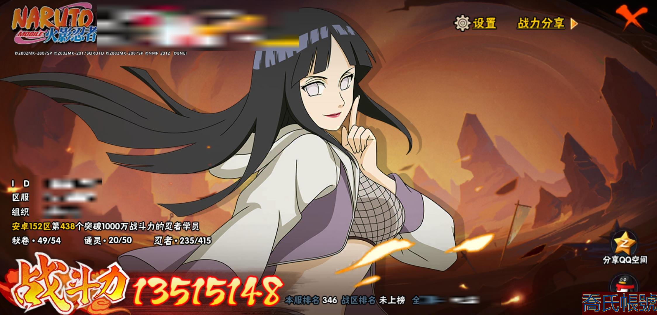【OBHXDNK206742】戰鬥力:1351W+;段位:中忍3階;本服排名:346;戰區排名:未上榜;VIP11級;S忍31個;A忍53個;通靈獸20個;S忍:大蛇丸(4星),須佐能乎宇智波鼬(4星),暴怒第六尾漩渦鳴人,九喇嘛連結漩渦鳴人,永恆萬花筒宇智波佐助,忍界大戰春野櫻,須佐能乎旗木卡卡西,自來也,舞之豪傑自來也,綱手,百豪綱手,死門邁特凱,波風水門,穢土轉生波風水門,穢土轉生猿飛日斬,穢土轉生千手扉間,千手扉間,穢土轉生千手柱間,木葉創立千手柱間,穢土轉生宇智波斑,宇智波斑,木葉創立宇智波斑,穢土轉生解宇智波斑,須佐能乎宇智波止水,白面具宇智波斑,忍界大戰宇智波帶土,紅夜之刃神秘面具男,忍界大戰艾,天道佩恩,大筒木桃式,大筒木金式;A忍:邁特凱(5星),猿飛阿斯瑪(5星),幹柿鬼鮫(5星),疾風傳我愛羅(4星),蠍(4星),飛段(3星),仙人模式漩渦鳴人,九尾查克拉漩渦鳴人,萬花筒寫輪眼宇智波佐助,須佐能乎宇智波佐助,宇智波泉奈,百豪春野櫻,忍界大戰秋道丁次,忍界大戰日向寧次,忍界大戰李洛克,最終章日向雛田,幻之真容旗木卡卡西,萬花筒寫輪眼旗木卡卡西,宇智波止水,青年波風水門,忍界大戰我愛羅,近松十人衛千代,俠隱江湖照美冥,五代目水影照美冥,桃地再不斬,穢土轉生桃地再不斬,忍界大戰奇拉比,奇拉比,青年艾,漂泊武士千手扉間,半蛇斗篷藥師兜,不風,不緣,青年長門,小南,夏日泳裝小南,漂泊浪客小南,角都,地怨虞角都,穢土轉生角都,曉大蛇丸,緋流琥蠍,宇智波鼬,新春限定宇智波鼬,迪達拉,穢土轉生迪達拉,死司憑血飛段,羈絆神農,猿飛木葉丸,五代目雷影達魯伊,桃式顯現漩渦博人,六代目水影長十郎,四代目土影黑土;通靈獸:忍犬,藍蛇,蛤蟆吉,忍龜,鐮鼬,猿魔,山椒魚,蜃,蛞蝓,蛤蟆仙人,鮫鯊,蛤蟆健,烏鴉,砂之守鶴,蛤蟆龍,蛤蟆廣,夢貘,熊貓,辛牙,鷹;時裝:百戰大蛇丸,百戰宇智波鼬須佐能乎,百戰波風水門,百戰佩恩天道,蜀面豪傑舞之豪傑自來也,太極靈韻日向花火武當宗師,龍的傳人李洛克截拳宗師,緋櫻綻放春野櫻百豪,剎那的藝術迪達拉,可愛睡衣漩渦鳴人,傳說的光芒波風水門,風之守護我愛羅忍界大戰,血霧怪人幹柿鬼鮫,熊貓少女天天峨眉宗師,紅月映雪宇智波鼬新春限定;【152】
