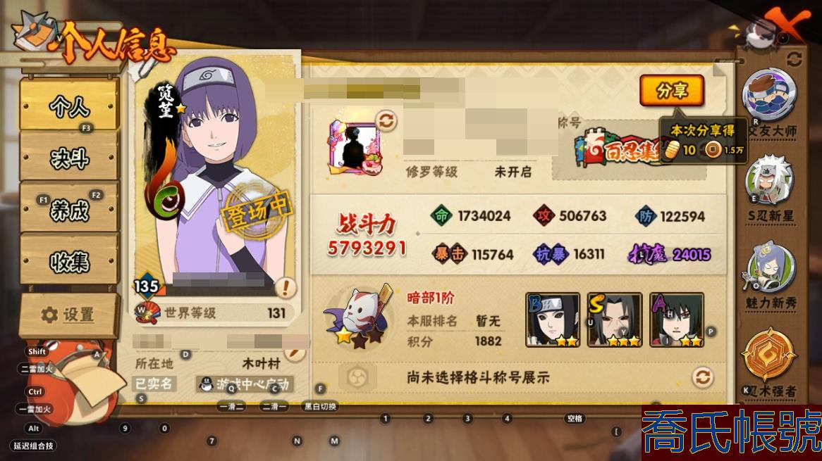 【OBHAWYM425742】VIPV8級;S忍9個;A忍16個;通靈獸14個;S忍:天道佩恩,須佐能乎旗木卡卡西,須佐能乎宇智波止水,穢土轉生宇智波鼬,忍界大戰艾,舞之豪傑自來也,須佐能乎宇智波鼬,大筒木桃式,波風水門;A忍:幻之真容旗木卡卡西,忍界大戰李洛克,九尾查克拉漩渦鳴人,萬花筒寫輪眼宇智波佐助,死司憑血飛段,疾風傳我愛羅,桃式顯現漩渦博人,緋流琥蠍,宇智波泉奈,迪達拉,飛段,邁特凱,幹柿鬼鮫,蠍,猿飛阿斯瑪,初始形態機械鳴人;永久通靈獸:砂之守鶴,藍蛇,蛤蟆吉,忍龜,鐮鼬,猿魔,山椒魚,蜃,蛤蟆仙人,蛤蟆健,蛤蟆龍,蛤蟆廣,忍犬,鮫鯊;V8/須卡/死鼬/須佐止水/忍戰艾/桃式