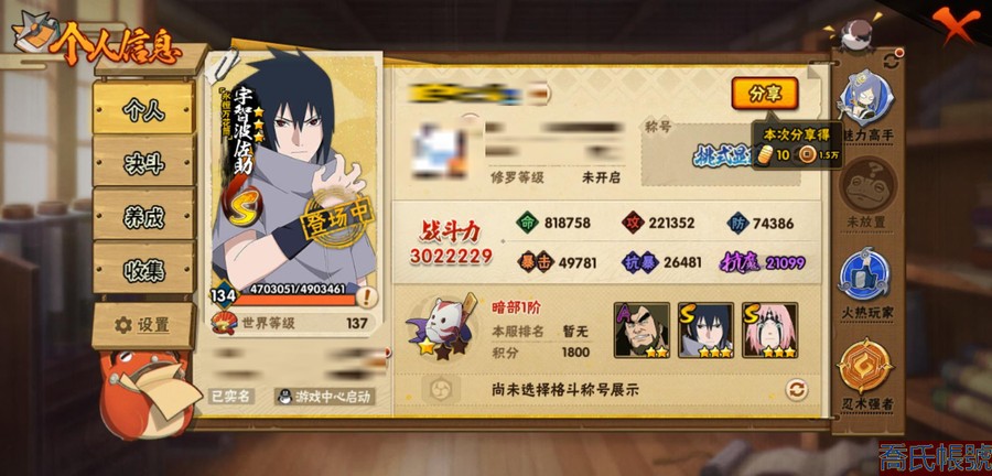 【OBHAWYM944842】戰鬥力:302W+;段位:暗部1階;本服排名:2480;戰區排名:未上榜;VIP11級;S忍7個;A忍24個;通靈獸13個;S忍:永恆萬花筒宇智波佐助,忍界大戰春野櫻,舞之豪傑自來也,波風水門,須佐能乎宇智波鼬,紅夜之刃神秘面具男,天道佩恩;A忍:忍者之路神秘面具男,須佐能乎宇智波佐助,疾風傳咒印宇智波佐助,宇智波泉奈,忍界大戰秋道丁次,忍界大戰日向寧次,忍界大戰天天,猿飛阿斯瑪,新春限定波風水門,青年波風水門,疾風傳我愛羅,青年三船,俠隱江湖綱手,青年長門,曉大蛇丸,蠍,幹柿鬼鮫,死司憑血飛段,暴怒宇智波帶土,俠隱江湖大野木,羈絆神農,桃式顯現漩渦博人,六代目水影長十郎,五代目雷影達魯伊;通靈獸:忍犬,藍蛇,蛤蟆吉,忍龜,砂之守鶴,鐮鼬,猿魔,山椒魚,蛞蝓,蜃,蛤蟆仙人,鮫鯊,蛤蟆健;時裝:百戰波風水門,蜀面豪傑舞之豪傑自來也,百戰宇智波鼬須佐能乎,百戰佩恩天道,冷玉豪情綱手俠隱江湖,太極靈韻日向花火武當宗師,血霧怪人幹柿鬼鮫,緋櫻綻放春野櫻百豪,龍的傳人李洛克截拳宗師,熊貓少女天天峨眉宗師;【628】連體號,三角洲,端瓦,端聯盟,端CF,手瓦,手聯盟,王者,熱門遊戲都有
