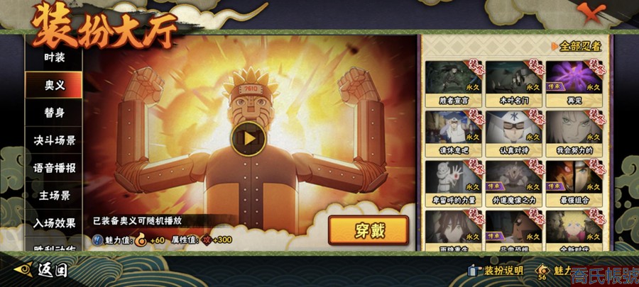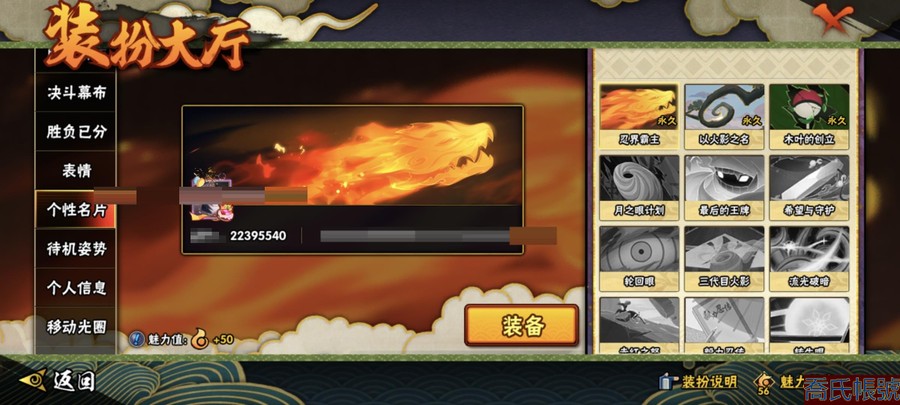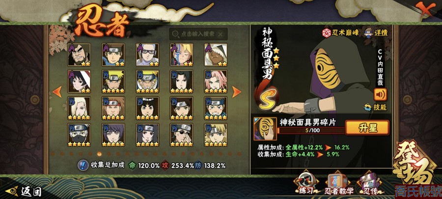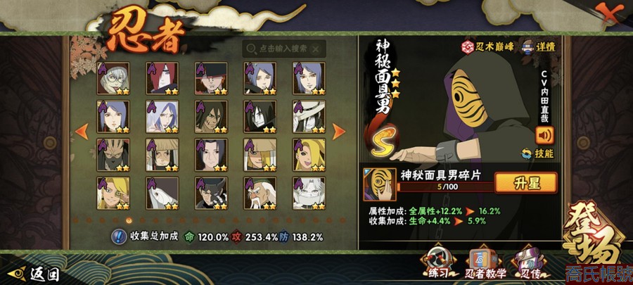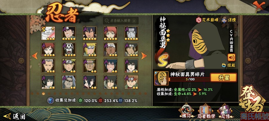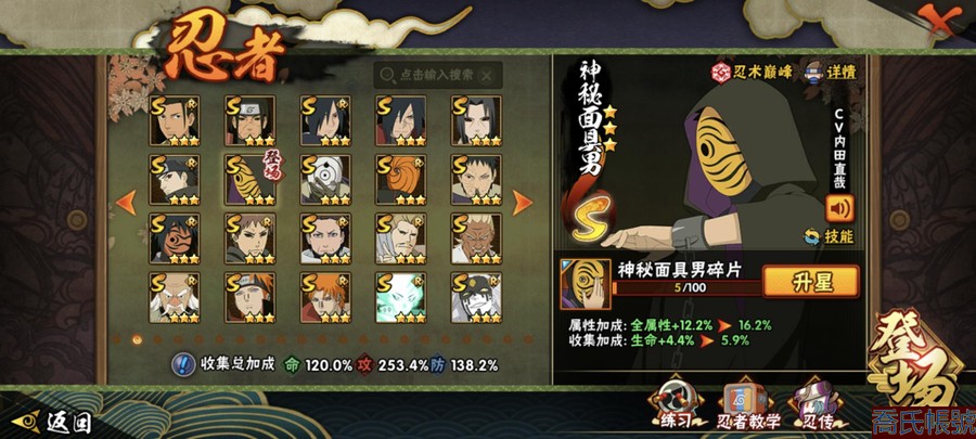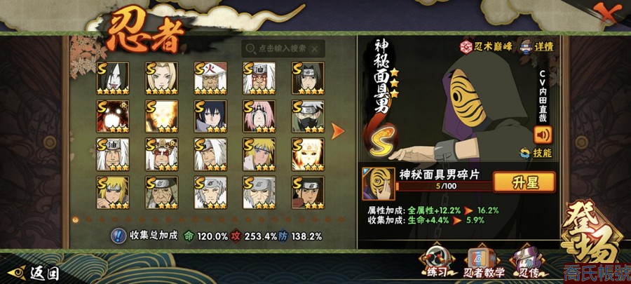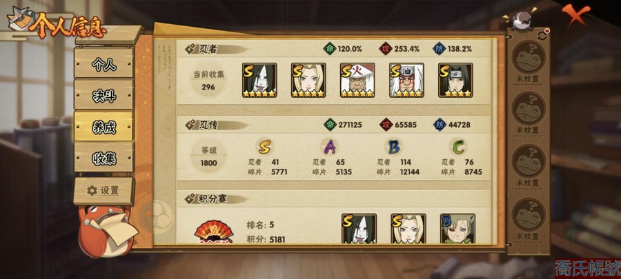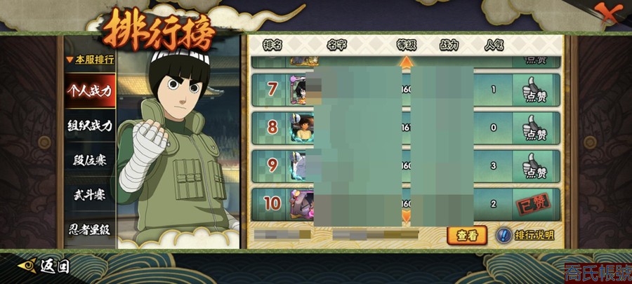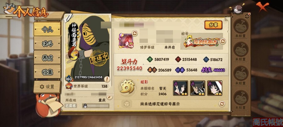 【OBHAWYM489542】戰鬥力:2240萬;VIPV15級;S忍4個;A忍4個;通靈獸3個;S忍:五影會談宇智波斑,九喇嘛連結波風水門,忍界大戰宇智波帶土,超佩恩天道;A忍:妖怪奇譚綱手,漂泊浪客宇智波帶土,俠隱江湖藥師兜,幻之真容旗木卡卡西;永久通靈獸:二尾又旅,一尾守鶴,七尾重明;【2523】5個傳承奧義