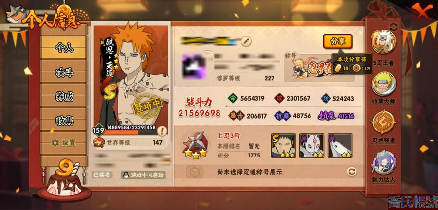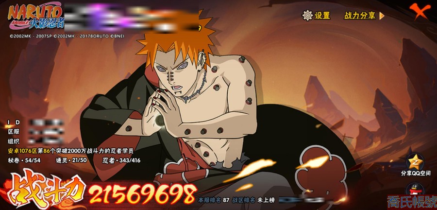 【OBHAWYM851242】戰鬥力:2156W+;段位:上忍3階;本服排名:87;戰區排名:未上榜;VIP15級;S忍50個;A忍75個;通靈獸21個;S忍:綱手(5星),猿飛日斬(5星),仙人模式自來也(4星),大蛇丸(4星),須佐能乎宇智波鼬(4星),暴怒第六尾漩渦鳴人,九喇嘛連結漩渦鳴人,永恆萬花筒宇智波佐助,忍界大戰春野櫻,須佐能乎旗木卡卡西,自來也,舞之豪傑自來也,傳說中的三忍自來也,百豪綱手,死門邁特凱,波風水門,九喇嘛連結波風水門,穢土轉生波風水門,穢土轉生猿飛日斬,千手扉間,穢土轉生千手扉間,千手柱間,穢土轉生千手柱間,木葉創立千手柱間,穢土轉生宇智波斑,宇智波斑,木葉創立宇智波斑,穢土轉生解宇智波斑,穢土轉生宇智波鼬,須佐能乎宇智波止水,神秘面具男,白面具宇智波斑,忍界大戰宇智波帶土,紅夜之刃神秘面具男,四代目風影羅砂,二代目水影鬼燈幻月,四代目雷影艾,忍界大戰艾,三代目雷影艾,穢土轉生金角銀角,三代目土影大野木,忍界大戰大野木,穢土轉生半藏,二代目土影無,天道佩恩,超佩恩天道,穢土轉生長門,仙人模式藥師兜,大筒木桃式,大筒木金式;A忍:邁特凱(5星),猿飛阿斯瑪(5星),蠍(5星),幹柿鬼鮫(5星),飛段(5星),旗木卡卡西(4星),疾風傳我愛羅(4星),死司憑血飛段(4星),須佐能乎宇智波佐助(3星),青年艾(3星),半蛇斗篷藥師兜(3星),宇智波鼬(3星),猿飛木葉丸(3星),仙人模式漩渦鳴人,忍者之路神秘面具男,初始形態機械鳴人,九尾查克拉漩渦鳴人,萬花筒寫輪眼宇智波佐助,疾風傳咒印宇智波佐助,宇智波泉奈,百豪春野櫻,忍界大戰秋道丁次,忍界大戰日向寧次,忍界大戰李洛克,最終章日向雛田,幻之真容旗木卡卡西,萬花筒寫輪眼旗木卡卡西,忍界大戰旗木卡卡西,元氣夏日旗木卡卡西,驚門邁特凱,穢土轉生猿飛阿斯瑪,宇智波止水,志村團藏,火影繼承人猿飛日斬,新春限定波風水門,青年波風水門,忍界大戰我愛羅,近松十人衛千代,五代目水影照美冥,桃地再不斬,漂泊武士桃地再不斬,穢土轉生桃地再不斬,奇拉比,忍界大戰奇拉比,忍界大戰土臺,三船,不風,不緣,不動,青年長門,小南,夏日泳裝小南,漂泊浪客小南,新春限定小南,黑絕,角都,地怨虞角都,穢土轉生角都,曉大蛇丸,緋流琥蠍,百機操演蠍,新春限定宇智波鼬,夏日限定宇智波鼬,迪達拉,穢土轉生迪達拉,惡靈之影飛段,暴怒宇智波帶土,俠隱江湖大野木,羈絆神農,六代目水影長十郎,五代目雷影達魯伊,桃式顯現漩渦博人,仙人模式巳月,四代目土影黑土,夏日限定黑土;通靈獸:忍犬,藍蛇,蛤蟆吉,忍龜,鐮鼬,猿魔,山椒魚,蛞蝓,熊貓,蜃,蛤蟆仙人,鮫鯊,蛤蟆健,烏鴉,蛤蟆龍,蛤蟆廣,夢貘,砂之守鶴,鷹,二尾又旅,蜘蛛;時裝:百戰波風水門,百戰宇智波鼬須佐能乎,狂野鮫鯊幹柿鬼鮫,蜀面豪傑舞之豪傑自來也,百戰大蛇丸,百戰佩恩天道,晴浪礁歌黑土夏日限定,太極靈韻日向花火武當宗師,驚雷掠影達魯伊五代目雷影,編織虛實宇智波鼬,龍的傳人李洛克截拳宗師,剎那的藝術迪達拉,血霧怪人幹柿鬼鮫,可愛睡衣漩渦鳴人,火之意志綱手百豪,初代目火影千手柱間,烈土霓裳黑土四代目土影,熊貓少女天天峨眉宗師,夏日衝浪旗木卡卡西元氣夏日,憤怒的伊始宇智波帶土暴怒,純白之心白,風之守護我愛羅忍界大戰,傳說的光芒波風水門,隱藏內心的面具旗木卡卡西暗部,神使之花小南新春限定;【1076】50s 忍法帖已80片 75a