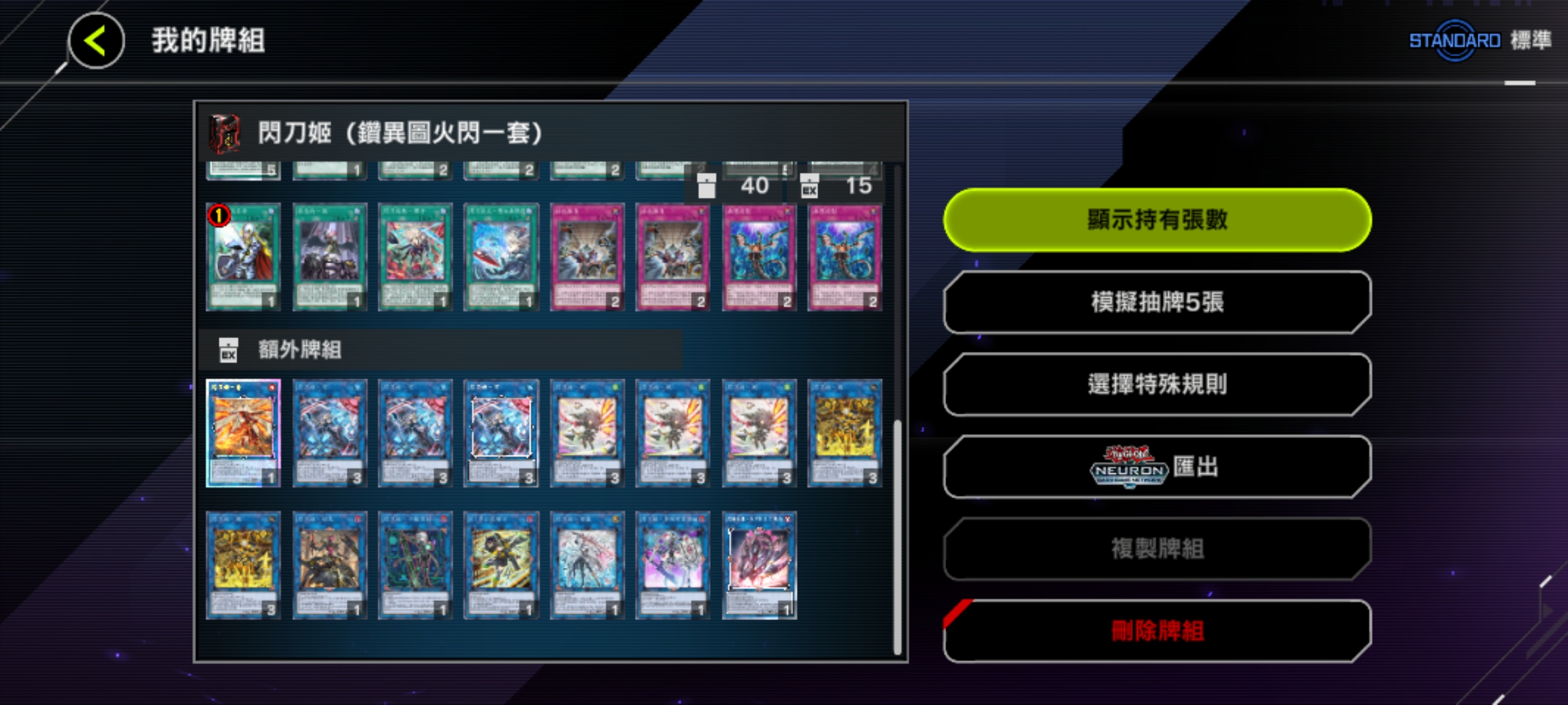 魔法卡:神鷹羽毛掃、墓穴的指名者(速攻)、抹殺的指名者(速攻)、閃電風暴、禁忌的一滴(速攻)、增援(異圖版!)、閃刀起動-交閃(異圖版!亮面!)。