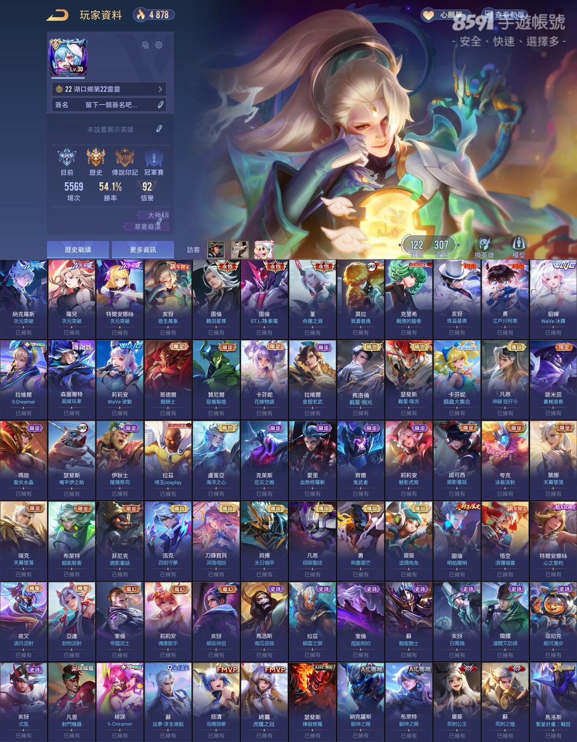 三次元突破!勝率佳!!近全英雄三百多造型!共122英雄308造型!勝率近55%!!共8次S戰場傳說印記!!常用奧義皆已齊全!!多課金抽獎造型!